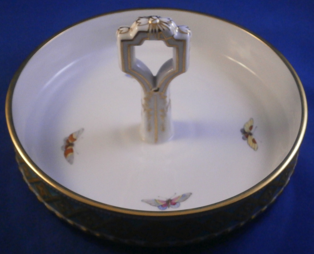 This is a very hard to find and truly superb piece from the Kurland service in the decoration 73 made by KPM in the 20th century. The Kurland pattern is always nice but the decor 73 is their top of the line and extra nice. It is one of my favorite patterns and looks very stunning when in use or on display. Hard to get these unusual dishes on the open market. The ice pail / fruit cooler was originally used to cool fruit with ice being added to the top of the lid and to the inside with a third bowl like pieces holding the fruit. On modern pieces this central bowl does not exist anymore. It is used more as an ice pail for a bottle of champagne and the lid as decoration when put on display. The main body is hand painted with a superb and large floral arrangement to the front and back with a butterfly to each side of each arrangement. There is a handpe to eack side that is very detailed and highlighted with gilding. The top edge as well as the lid edge have the tell tale turquoise ground trim color to it with the relief design fully gilded with some tooled details to it. A handle is sticking out from the center of the lid with some nice relief details to it and gold highlights. The inside of the top of the lid has four more butterflies painted on it. A truly stunning looking piece! The lidded cooler is in perfect condition. It measures about 10.625 inches tall and 7.375 inches in diameter. The handles stick out about 1.125 inches on either side. It is marked underneath with the under glaze blue scepter, the red orb as well as some black artist mark and decor number 73 as shown. Please email me for more information or other pictures.