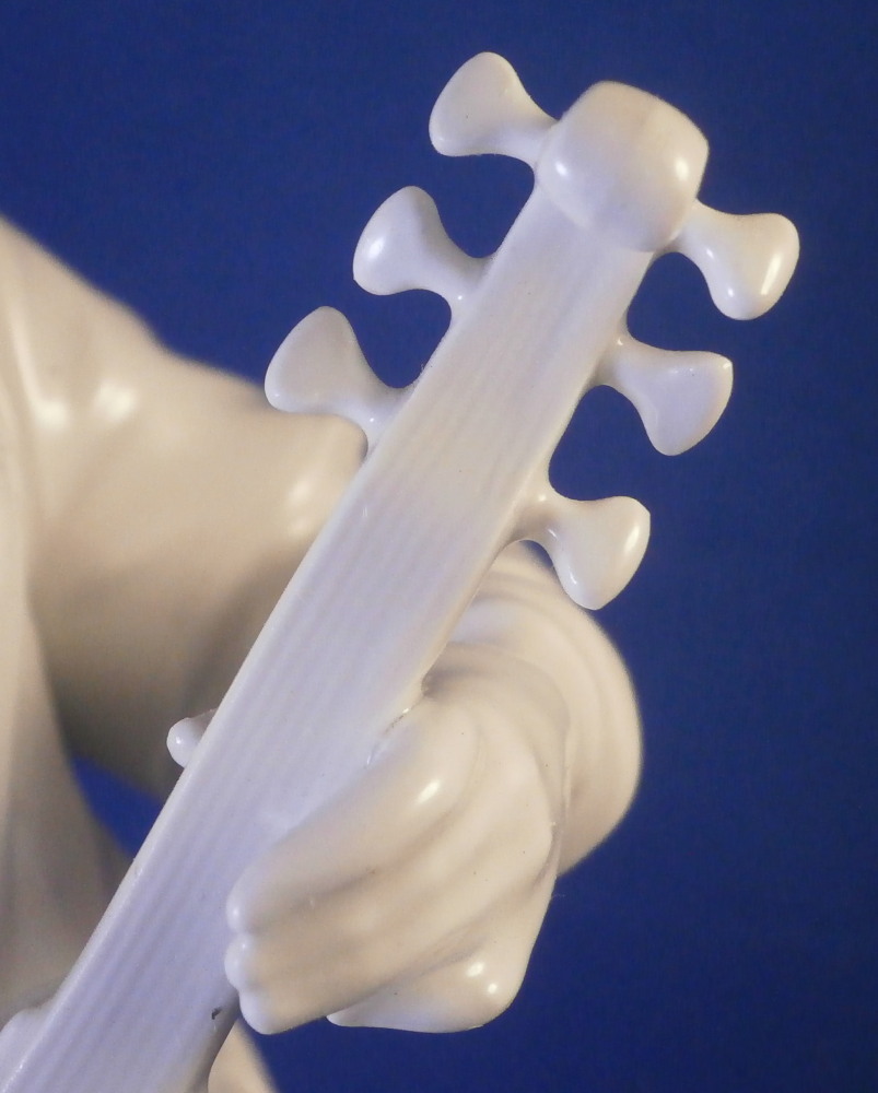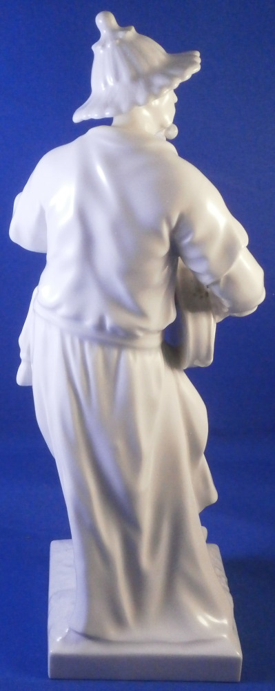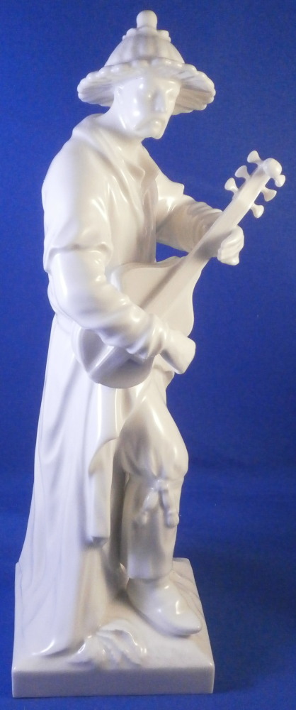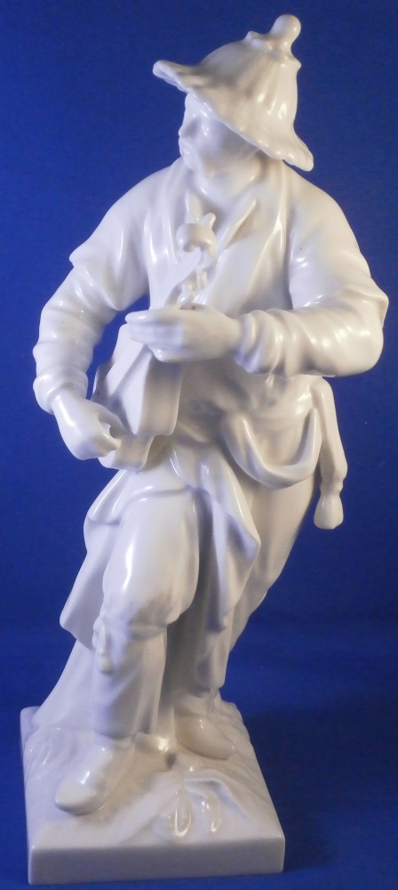 This is a superb figurine of a Malabar made by KPM in the later 20th century. It is of an Asian gentleman playing the lute. A superbly modeled figure with lots o details standing on a square base with plants in relief to the top. The gentleman is wearing his traditional outfit of a flowing robe and a nice hat. This figurine was originally modeled by Elias Meier in 1777 and comes from the series Fremde Voelker (foreign peoples). The figure is in perfect condition! The figurine is 8.75 inches tall, 3.25 inches wide and 3.5 inches deep. It is marked underneath with the under glaze blue scepter (first choice) as well as an impressed star mark as shown. A really nice figurine! Please email me for more information or other pictures.