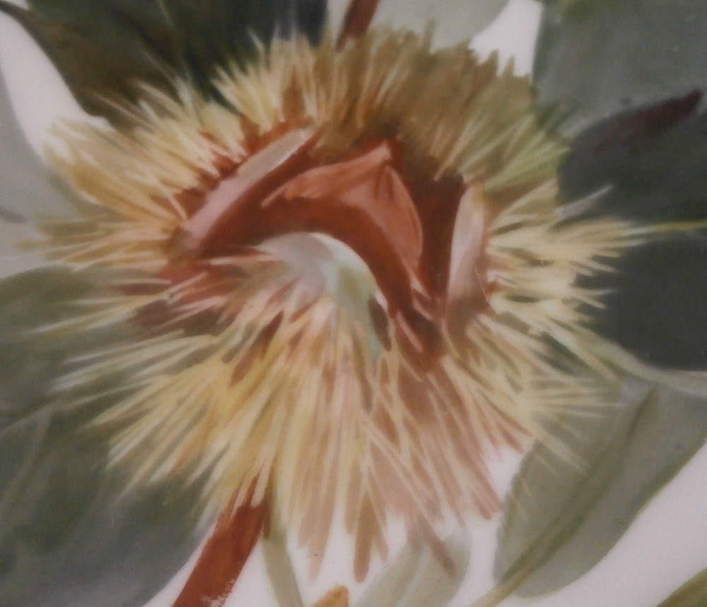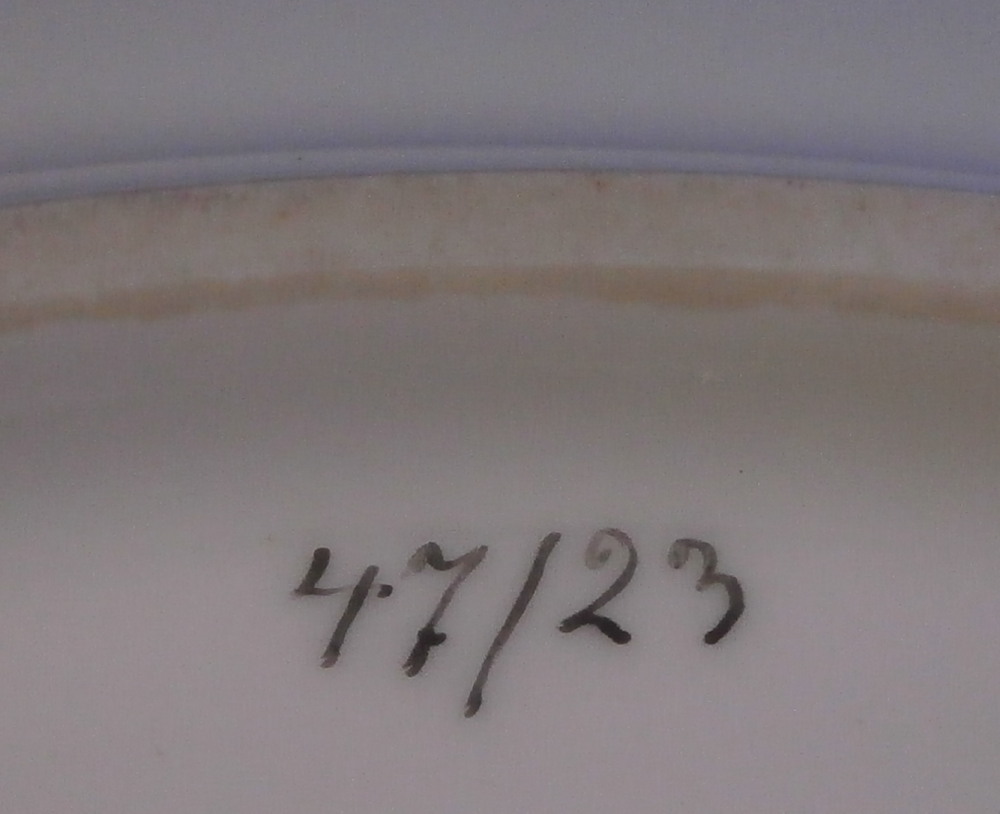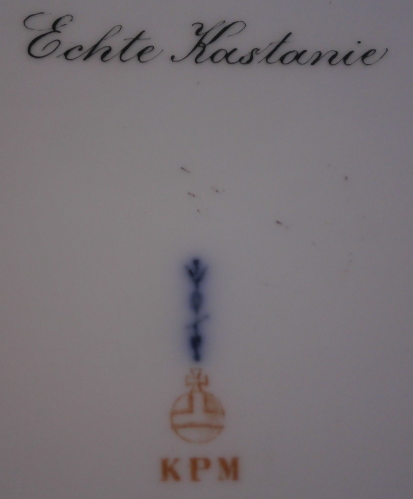 This is a great plate made by KPM in the early 20th century. It is hand painted with the rarest design on these plates of this style - the tree branch / leaf motif. This one is of a branch of a European Chestnut tree including its leaves on a branch but also half opened chestnut which makes this one really superb plate! Kind of the German version of the Flora Danica :) Just an amazingly detailed painting and with the rim painted with gold on a raised design it is just spectacular. The plate is in great condition with one of spot of wear on one of the outer leaves from stacking. Light and not obvious when on display jsut when held at a certain angle to the light. Two scratches to the glaze in the white area also not visible when on display. It is 8.625 inches in diameter so a nice size and 1 inch tall. The plate is marked underneath with the under glaze blue scepter, the red orb mark, some black numbers, a painter's and a gilder's mark, the usual impressed marks of this period as well as the name of the tree - Echte Kastanie in black script. Please email me for more information or other pictures.