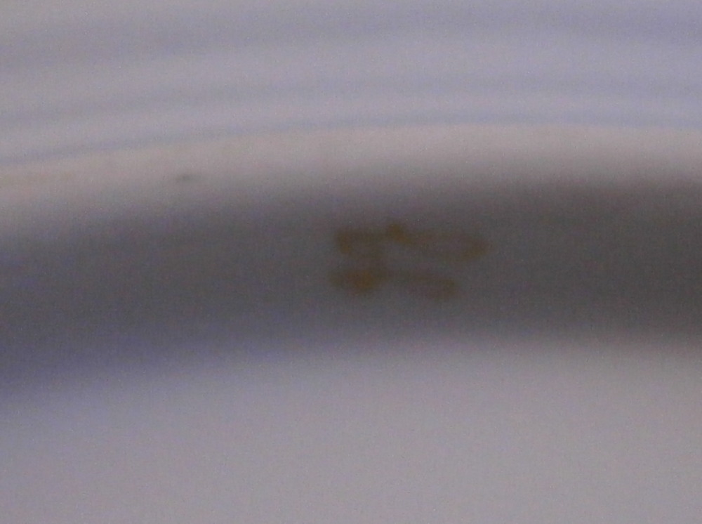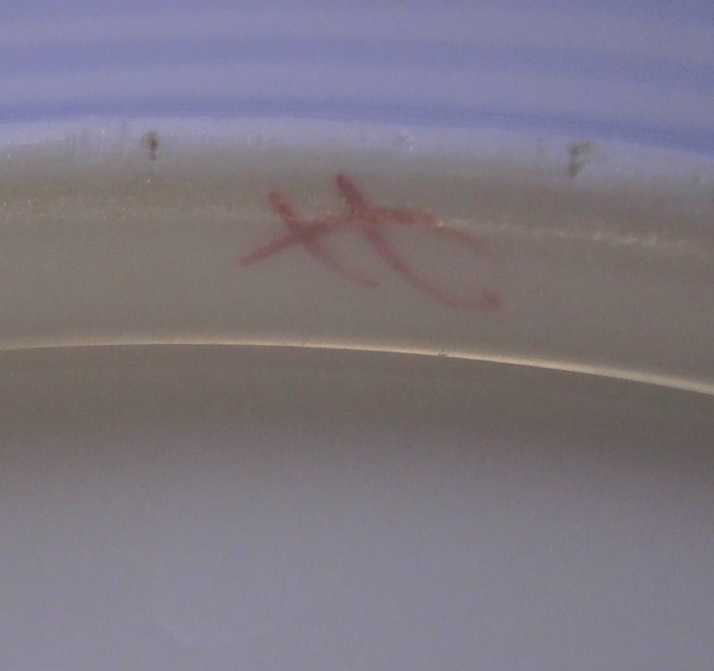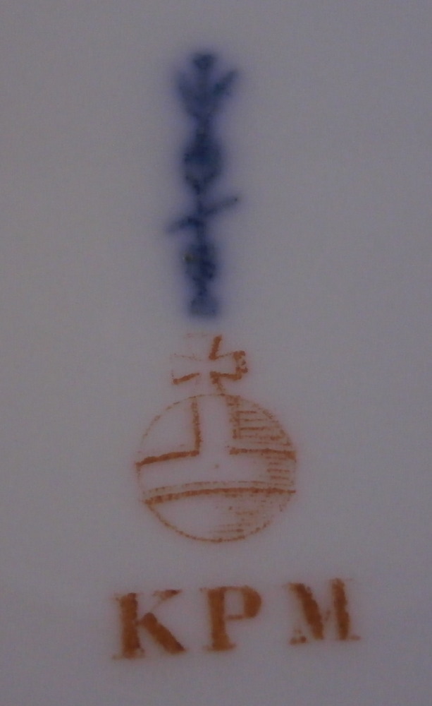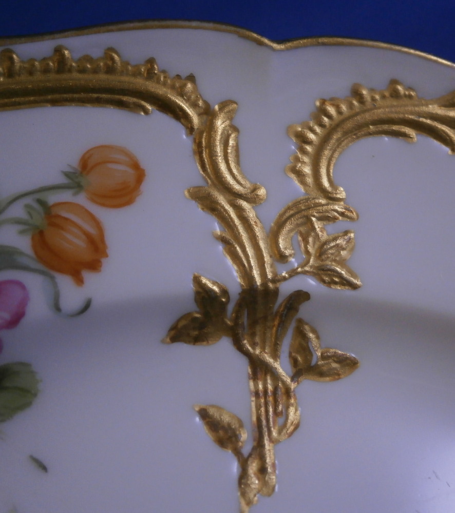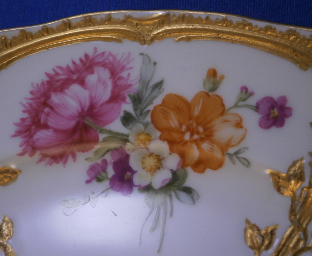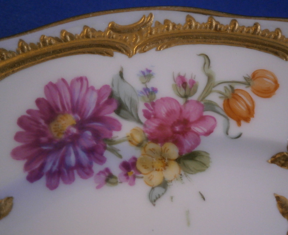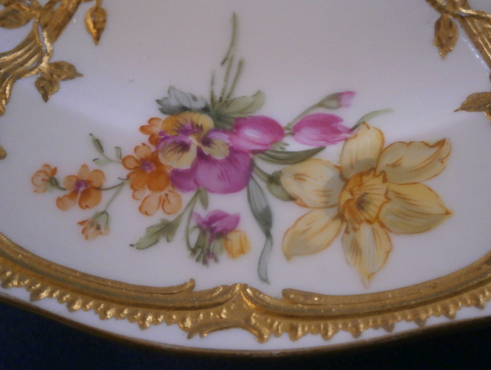 This is a superb dessert plate made by KPM in the early 20th century. The design is called Neuzierat and this is the version with the spaces between the raised design and the rims left white and not fully gilded. The piece is hand painted superbly along the rim with three larger floral arrangements and three small flowers and has a superb raised gold trim in between that juts out into the well of the plate. A single flower adorns the center. The dish is marked underneath with the under glaze blue scepter mark as well as the red orb, a gilder's and painter's mark and the usual impressed marks as shown. It is in great condition with the stems of one of the floral arrangements mostly gone which was probably a firing issue and some very minor wear to the gilding along the very edge. It displays superbly! The plate is 0.875 inches tall and 7.375 inches in diameter. Please email me for more information or other pictures.