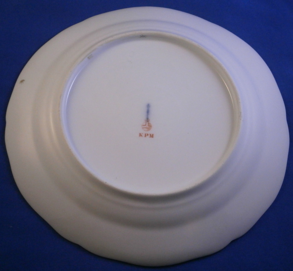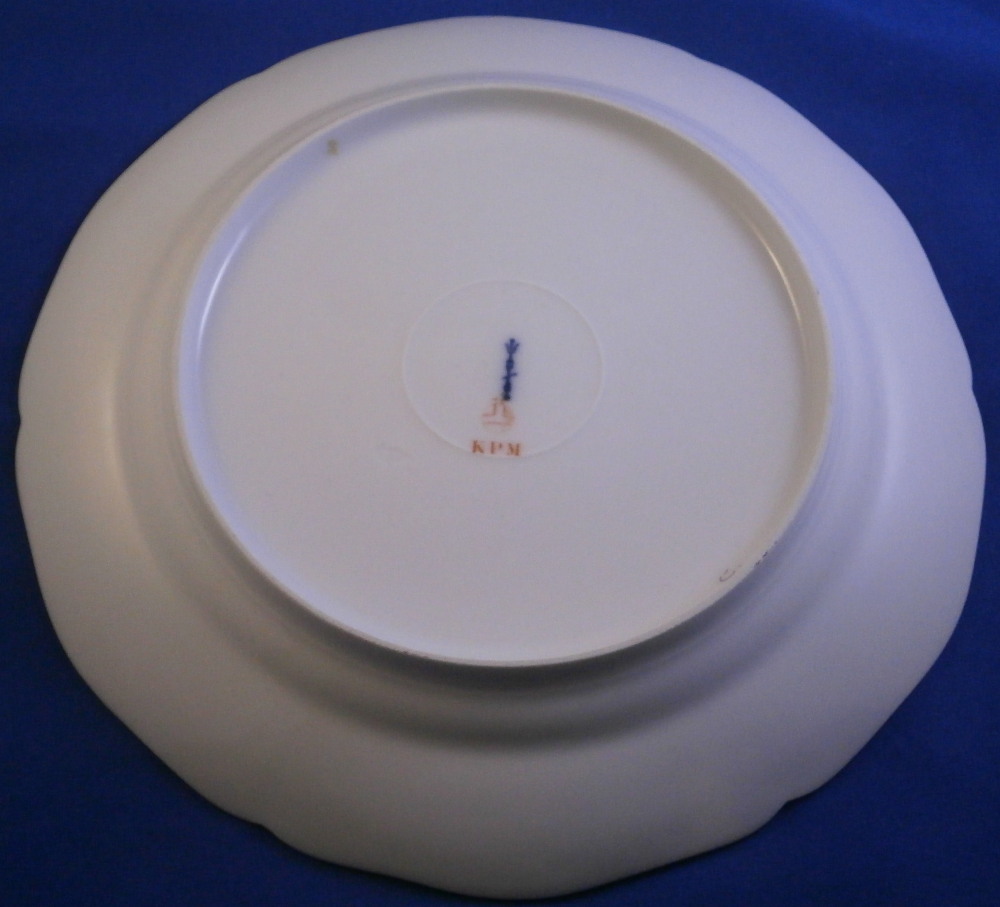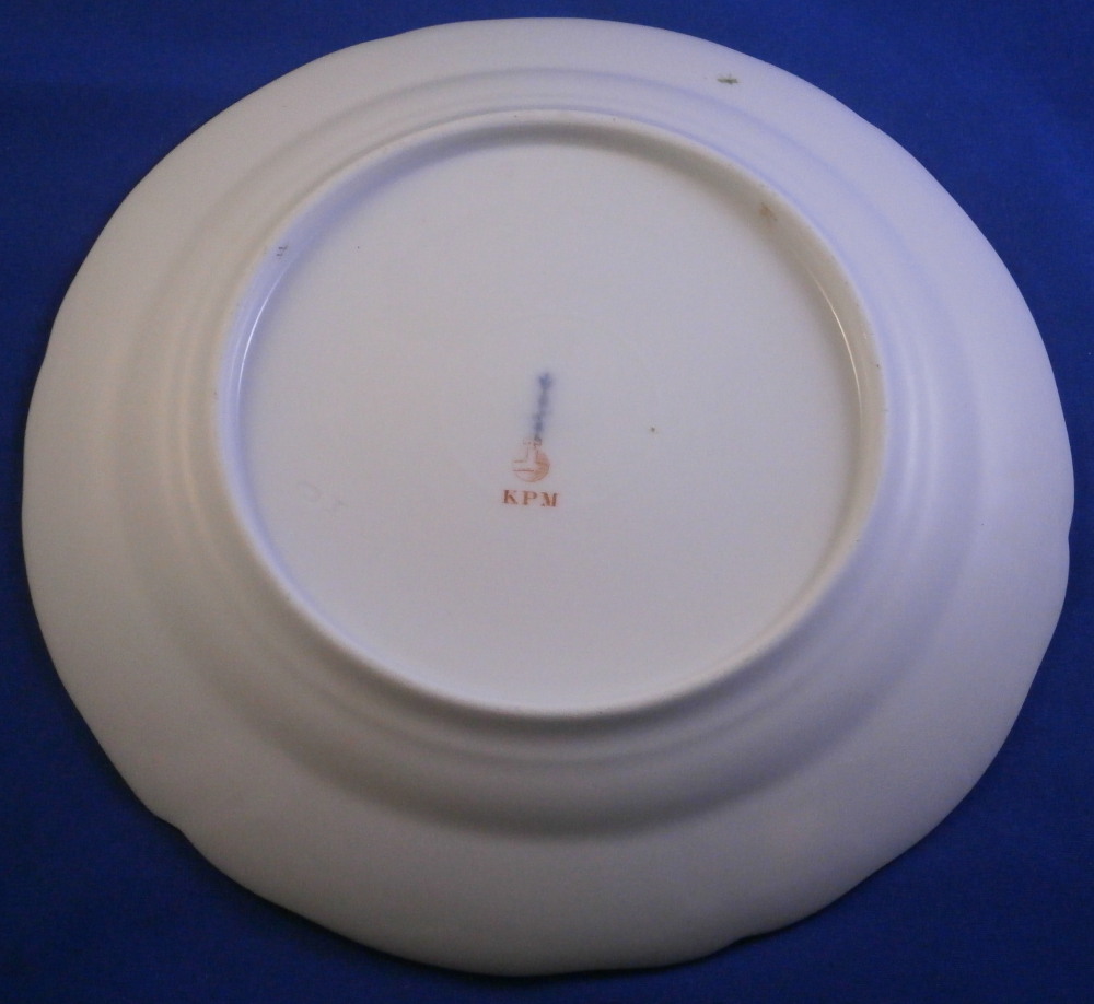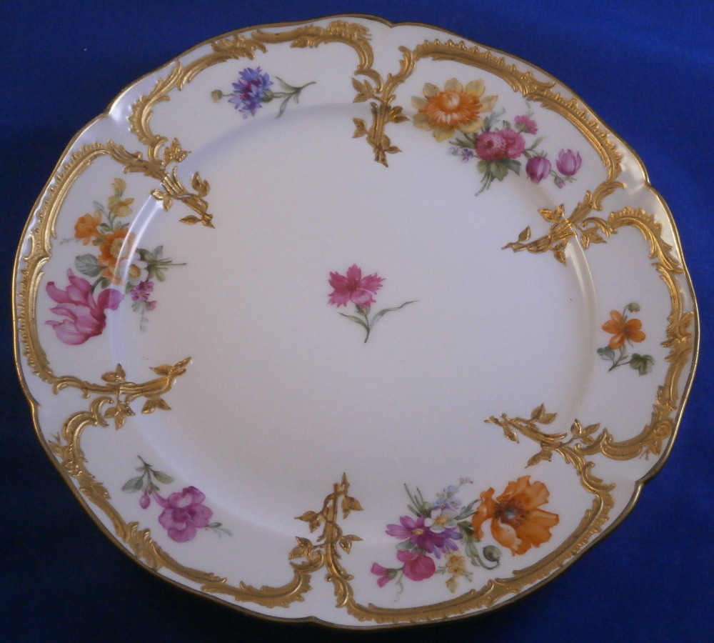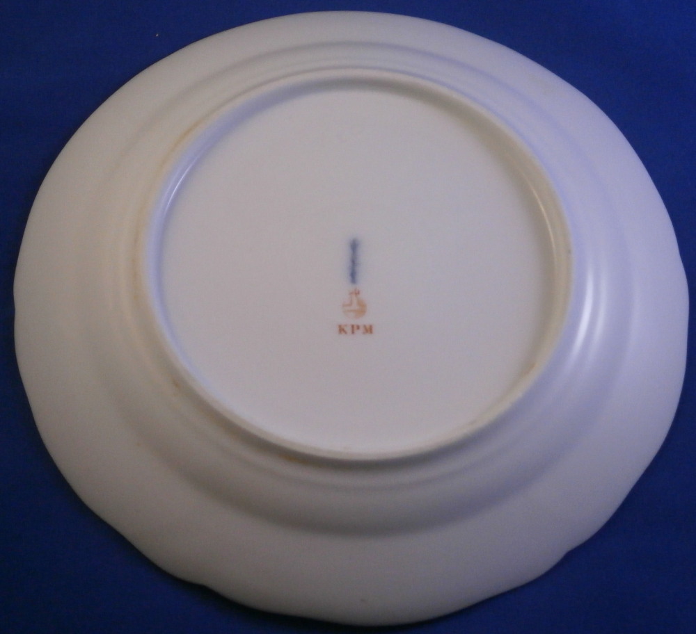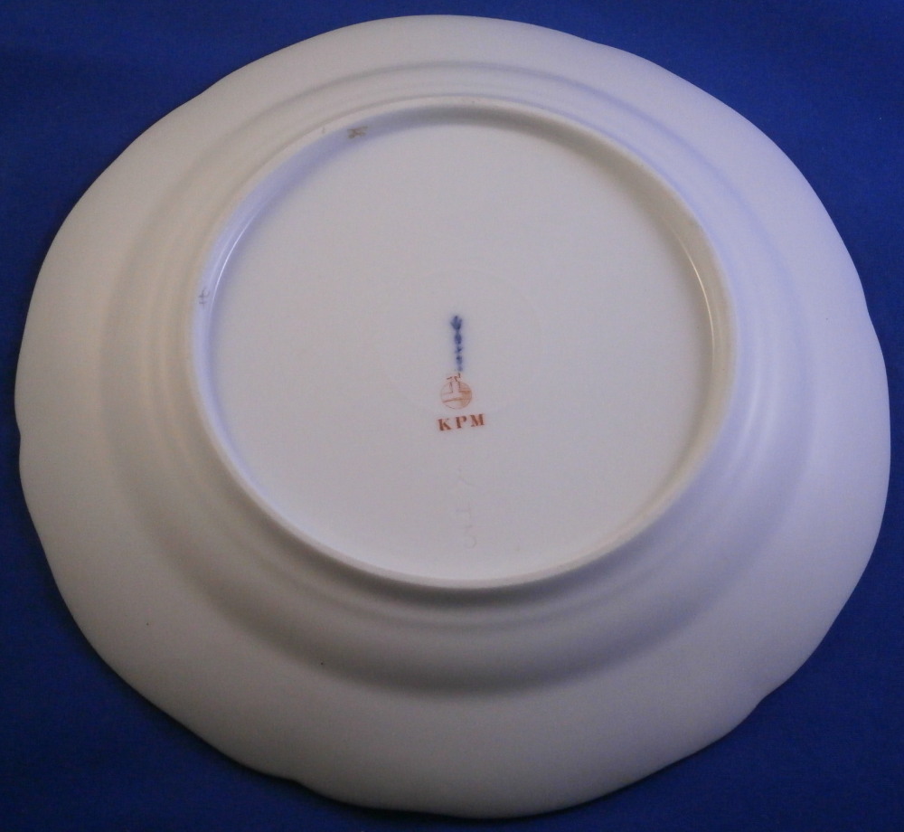 This is a superb set of 6 dessert plates made by KPM in the early 20th century. The design is called Neuzierat and this is the version with the spaces between the raised design and the rims left white and not fully gilded. Each piece is hand painted superbly along the rim with three larger floral arrangements and three small flowers and has a superb raised gold trim in between that juts out into the well of the plate. A single flower adorns the center. The dishes are marked underneath with the under glaze blue scepter mark as well as the red orb, a gilder's and painter's mark and the usual impressed marks as shown. The set is in great condition with some minor wear to the gilding along the very edges. As nice as they come. They displays superbly! Each plate is about 0.875 inches tall and 7.25 inches in diameter. Please email me for more information or other pictures.