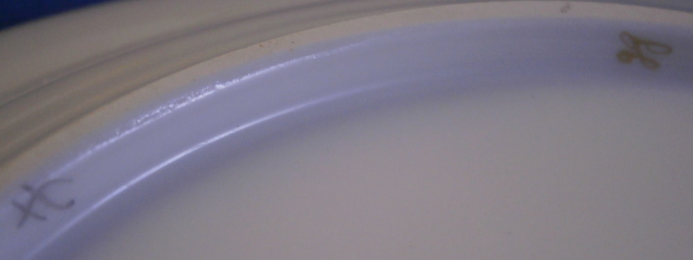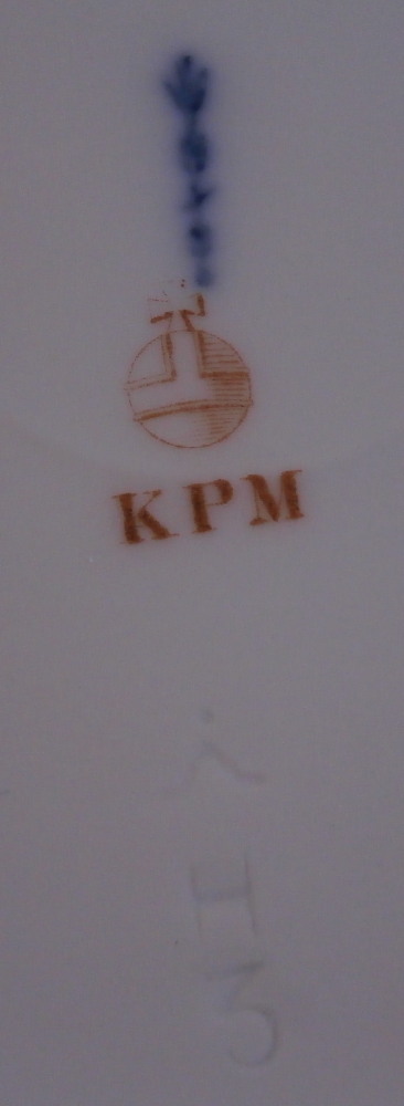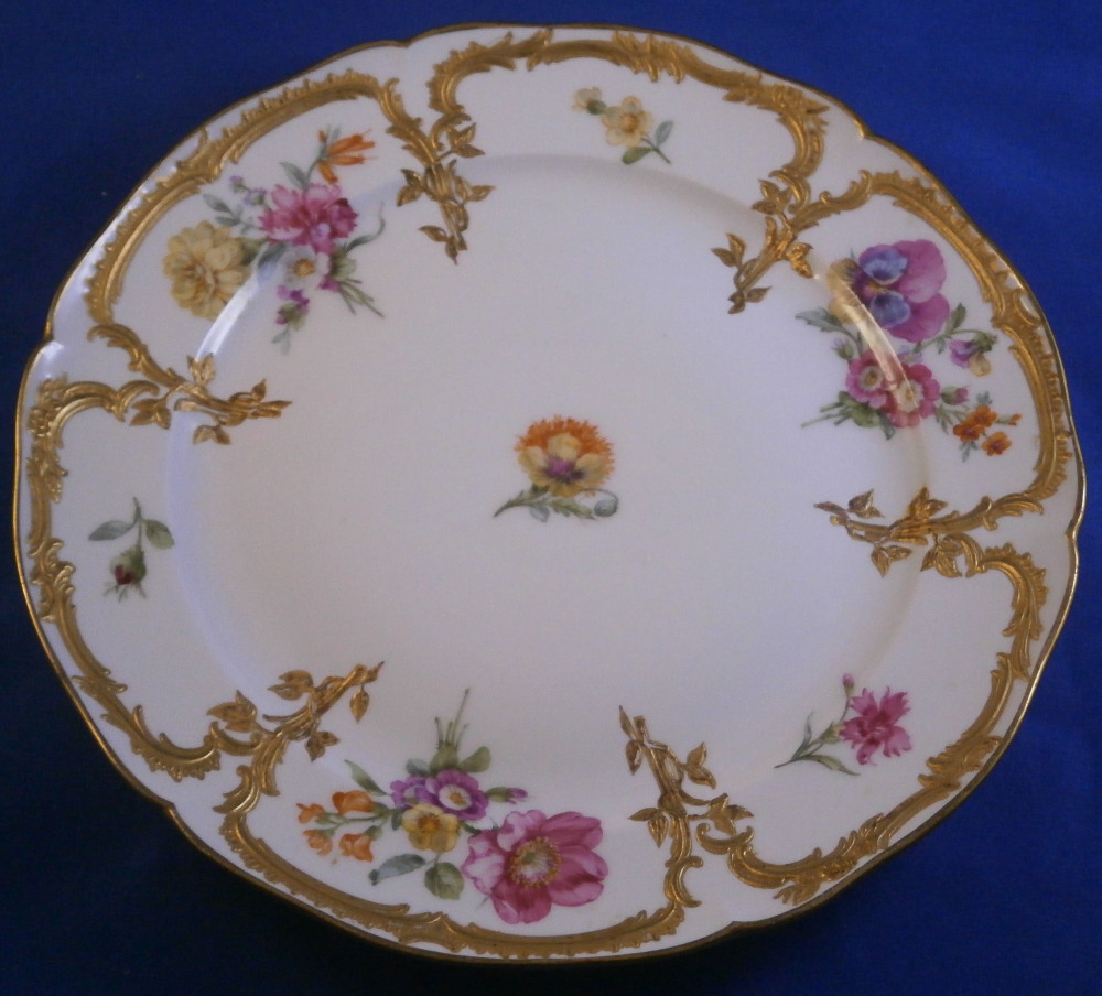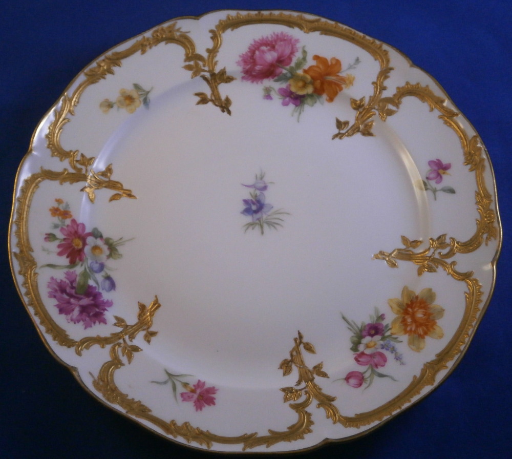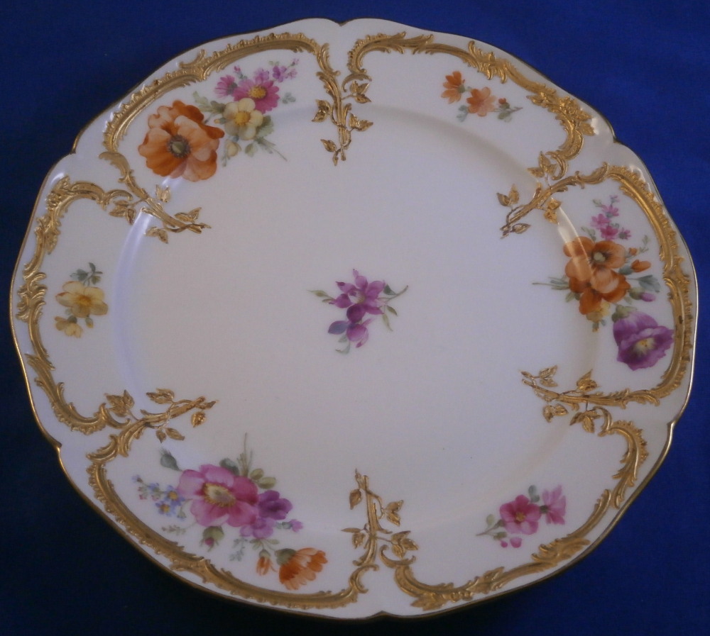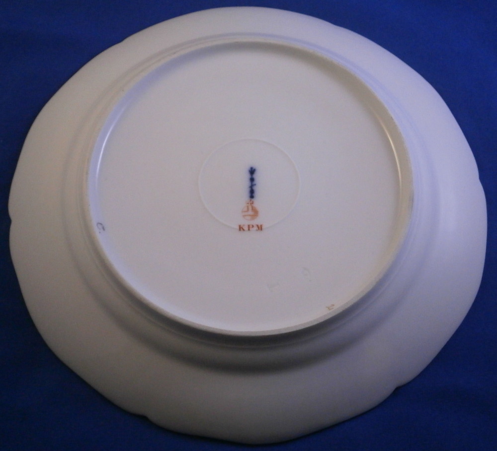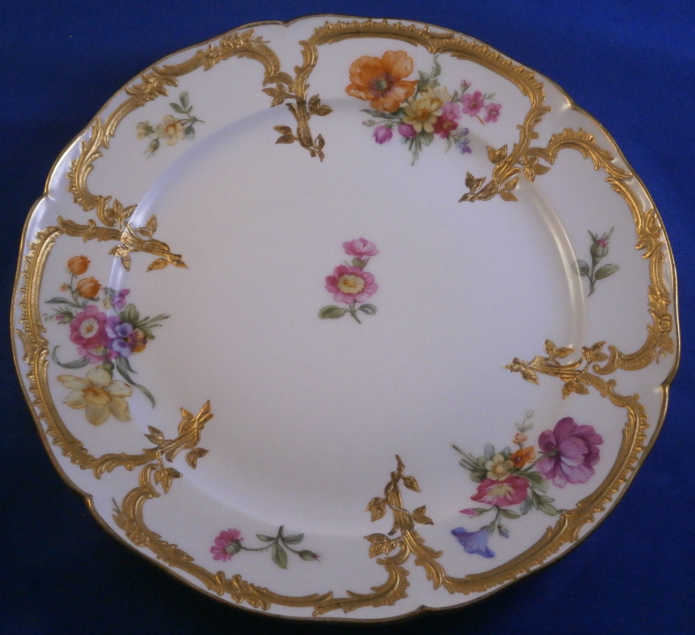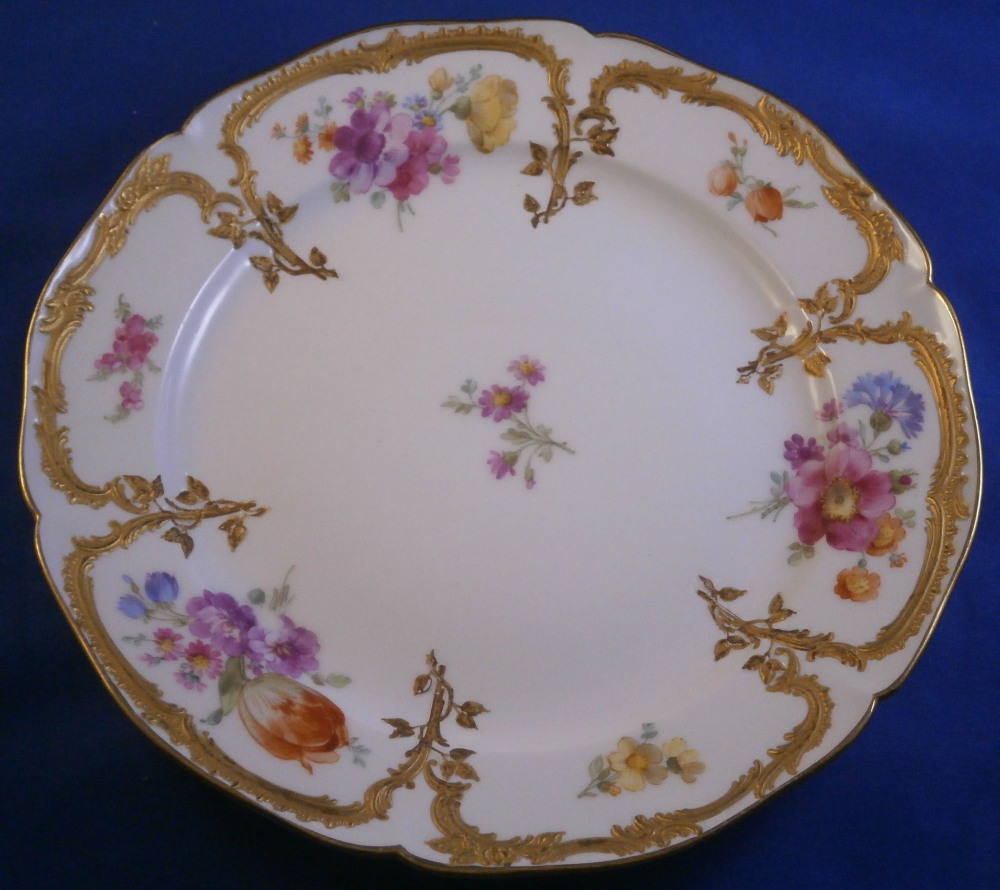 This is a superb set of 6 dessert plates made by KPM in the early 20th century. The design is called Neuzierat and this is the version with the spaces between the raised design and the rims left white and not fully gilded. Each piece is hand painted superbly along the rim with three larger floral arrangements and three small flowers and has a superb raised gold trim in between that juts out into the well of the plate. A single flower adorns the center. The dishes are marked underneath with the under glaze blue scepter mark as well as the red orb, a gilder's and painter's mark and the usual impressed marks as shown. The set is in great condition with some minor wear to the gilding along the very edges. As nice as they come. They displays superbly! Each plate is about 0.875 inches tall and 7.25 inches in diameter. Please email me for more information or other pictures.