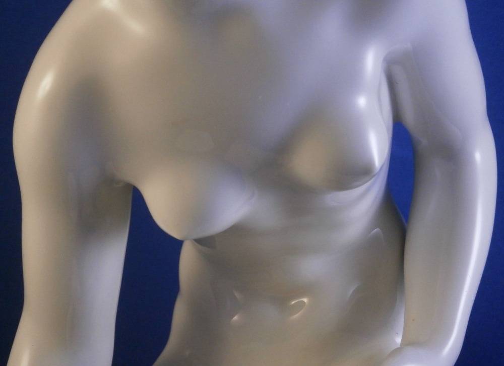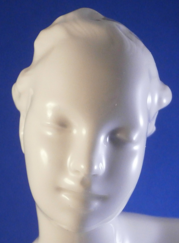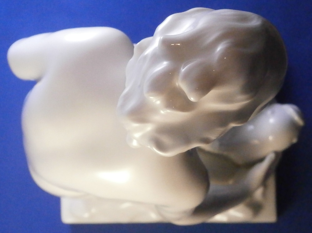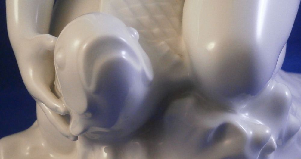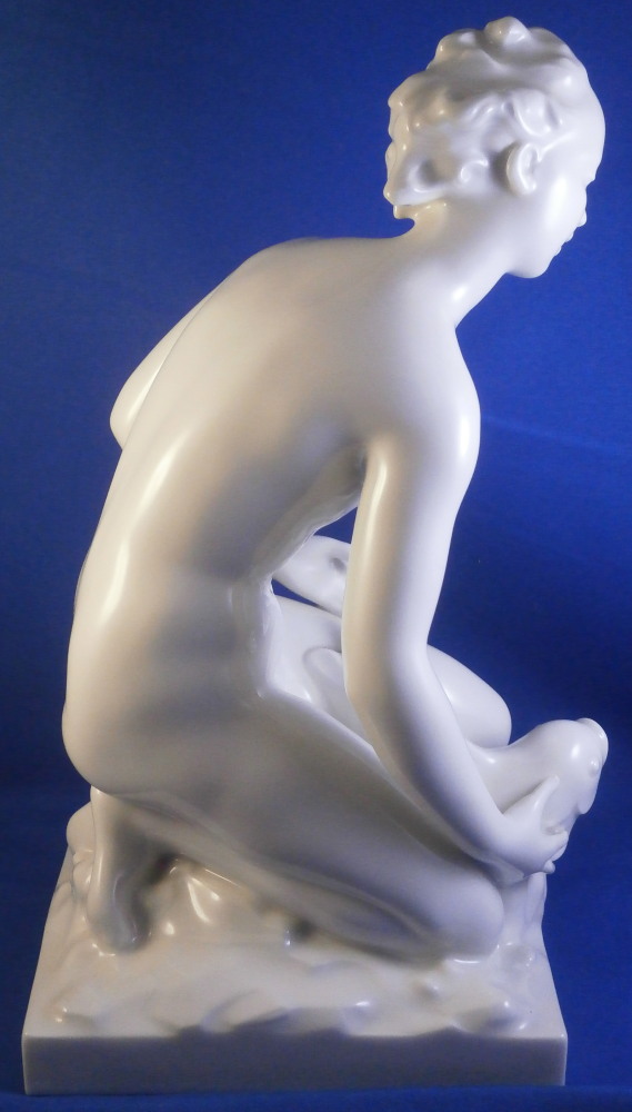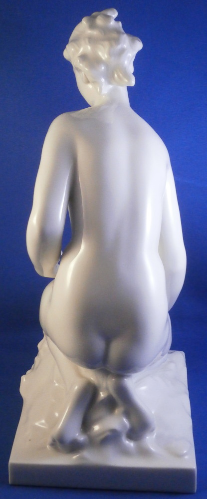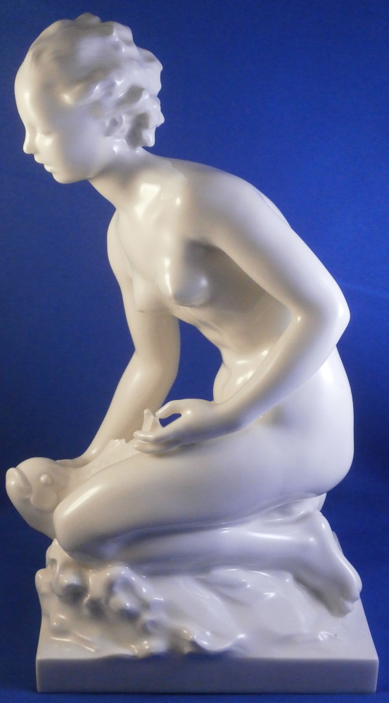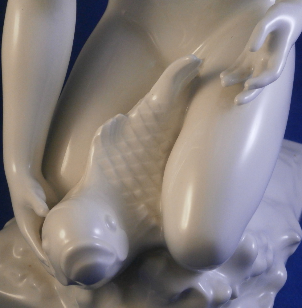 This is a superb blanc de Chine figurine made by KPM in the mid 20th century. It is of a young lady kneeling in the waves close to shore while holding a fish in between her legs. The figure was originally modeled by Suse Müller-Diefenbach around 1938. The piece is superbly modeled with lots of details and left in the white to show them all off. The figure is in perfect condition with one tiny black firing spot near the back corner of the base from when it was made. It is 10.25 inches tall, 4.375 inches wide and 6.25 inches deep. The figurine is marked underneath with the under glaze blue scepter (first choice) as well as some impressed letters and marks as shown. A really nice figurine! Please email me for more information or other pictures.