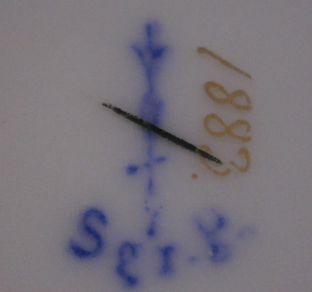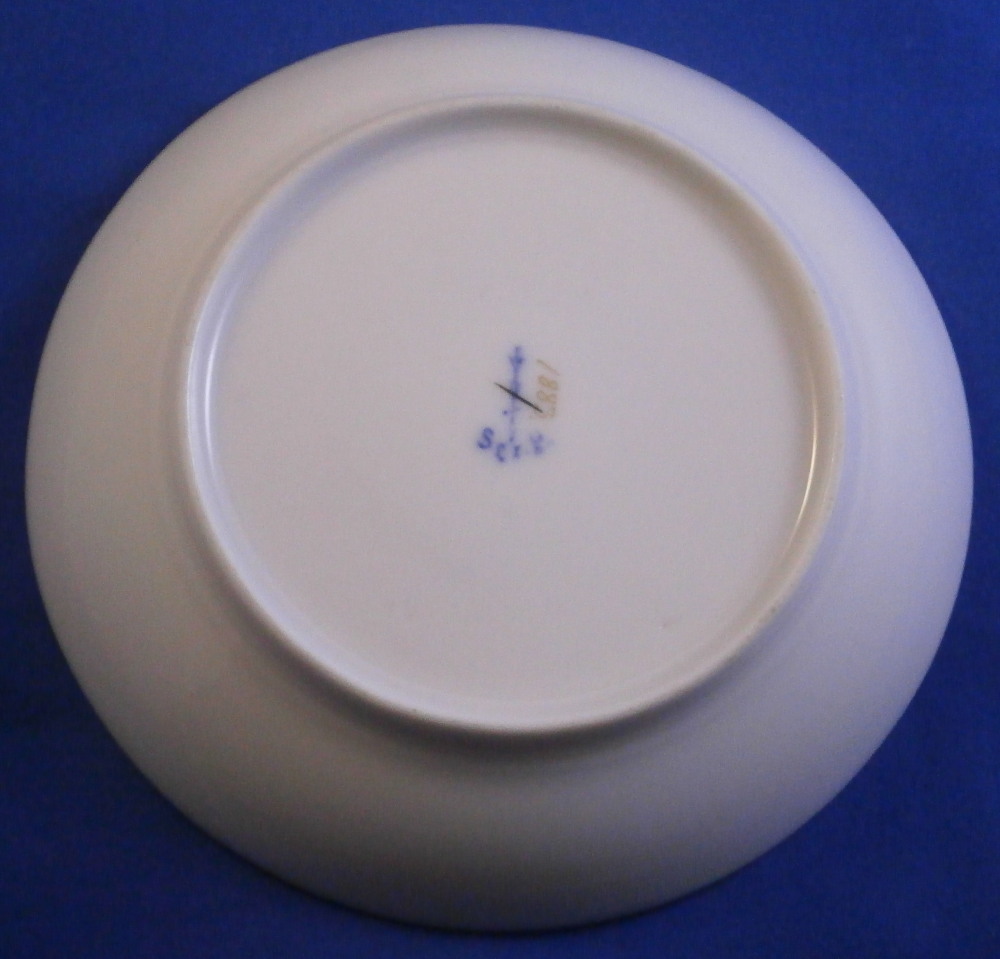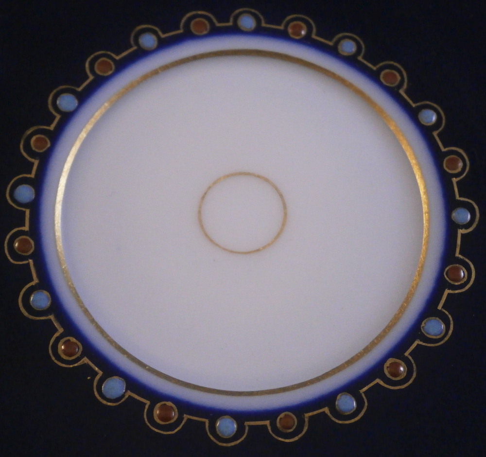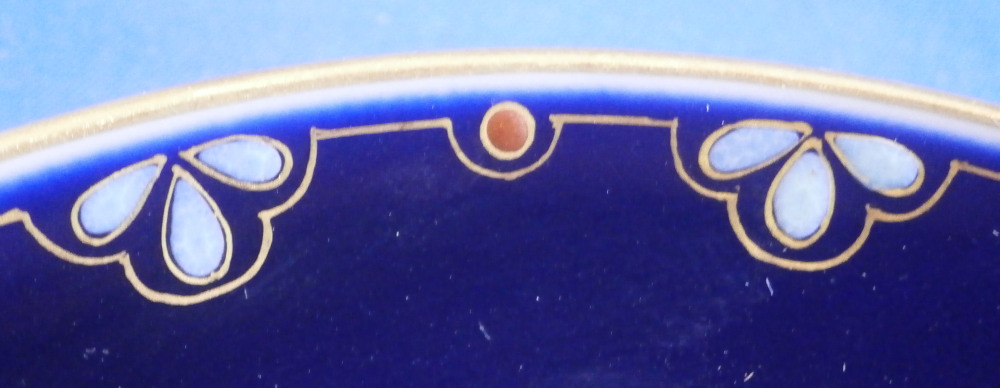 This is a very rare saucer made of Seger porcelain in the late 19th century during the Art Nouveau / Jugendstil period. The saucer has a cobalt blue ground color to it with some delicate gold trim but the ebst part are the raised enamel " jewels " in light blue and red. A stunning look and the jewelled pieces are hard to find. I used to own a cup and saucer set in this design and showed the picture as an example to see what cup would go with this saucer. The dish is in great condition with some wear to the glaze over the blue ground as shown. Does not impact the piece on display. The saucer is just under 1 inch tall and 5 inches in diameter. Marked with the underglaze blue scepter and S.g.r.P. mark with a line cut across it denotng it to be a second choice. Also a gold number 1883. No red orb mark on these ever since they were never sold in the white and Seger pieces usually did not use them! Please email me for more information or other pictures.