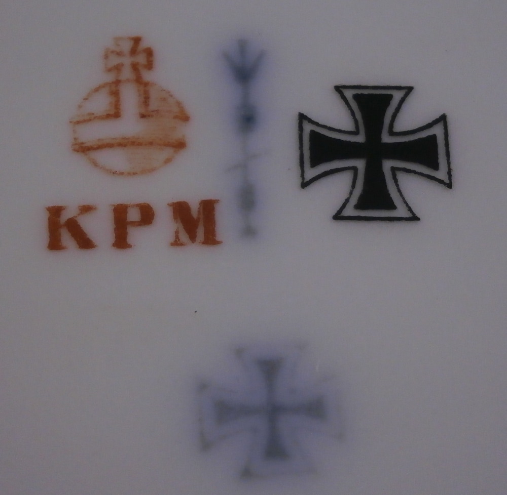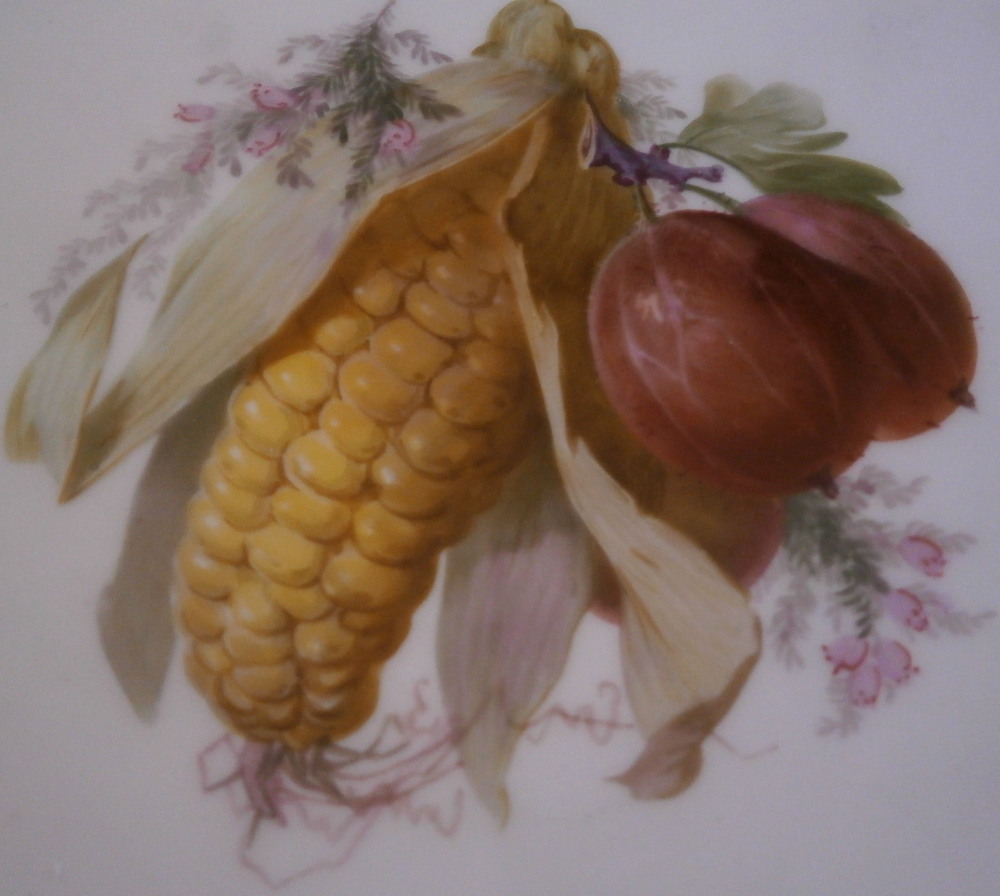 This is a cute plate made by KPM in the early 20th century. It is hand painted with a superb design in the center of a piece of corn as well as two gooseberries and some pinks flowers (heather maybe) and off course that amazing gold trim on relief design which makes these plates from the Neuzierat series so special. The combination is probably my favorite plate deisgn. The painting is top notch and the rim trim is just spectacular. The plate is in perfect conditionand it displays perfectly. The piece is 7.375 inches in diameter so the smaller version and 0.875 inches tall. The plate is marked underneath with the under glaze blue scepter, the red orb mark, some black numbers, a painter's mark, the usual impressed marks of this period as well as the under glaze blue and over glaze black Iron cross used during the period of WWI. I have other matching plates if anyone would like a pair or a set of these. Please email me for more information or other pictures.