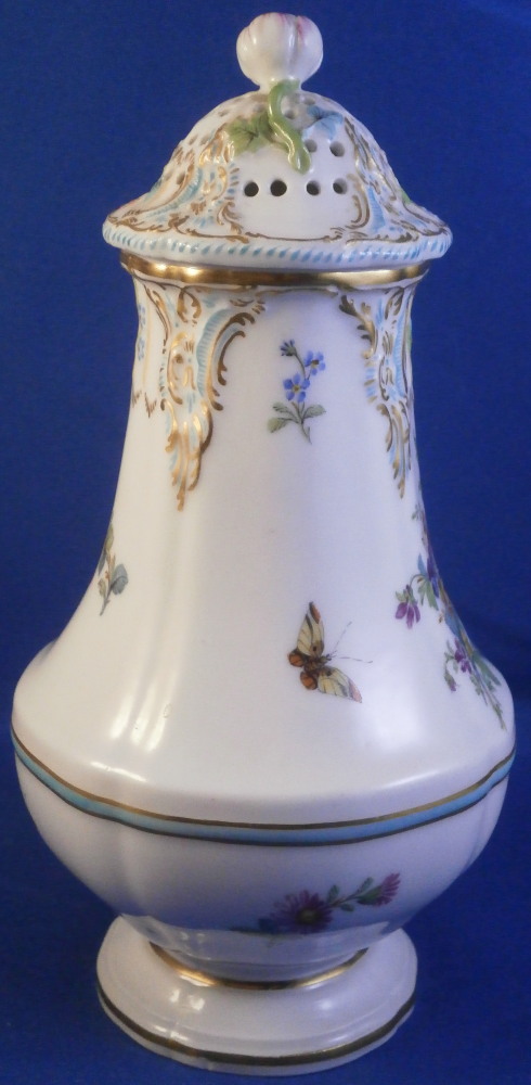 This is a fancy sugar shaker / caster / muffineer made by KPM in the early 20th century . It is of a nice size and is hand painted with a polychrome floral arrangement on the front as well as some butterflies and single flowers scattered throughout the rest of the body. There is a relief design to the paste of the upper part highlighted with gilding and turquoise which then goes into the top. The top has the characteristic holes in it for the sugar to come out of. Floral finial with its stem and leaves to the top. Turquoise and gold ring around the widest part and gold trim to the bottom edge. A really nice looking piece! It is in perfect condition. The cork in the bottom is missing but that is an easy thing to replace if need be. The pot is marked with the under glaze blue scepter mark as well as the red orb mark as shown. It is 6 inches tall and 3 inches in diameter at the widest middle section part. . Please email me for more information or other pictures.