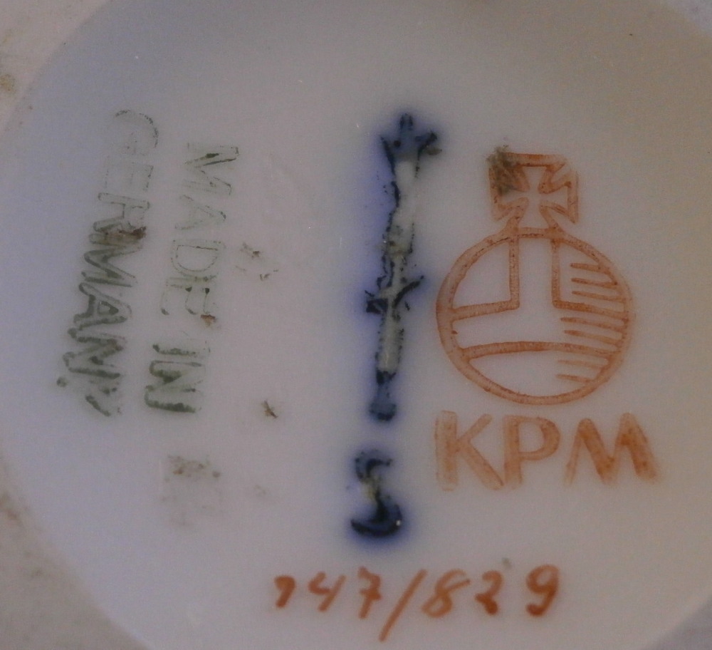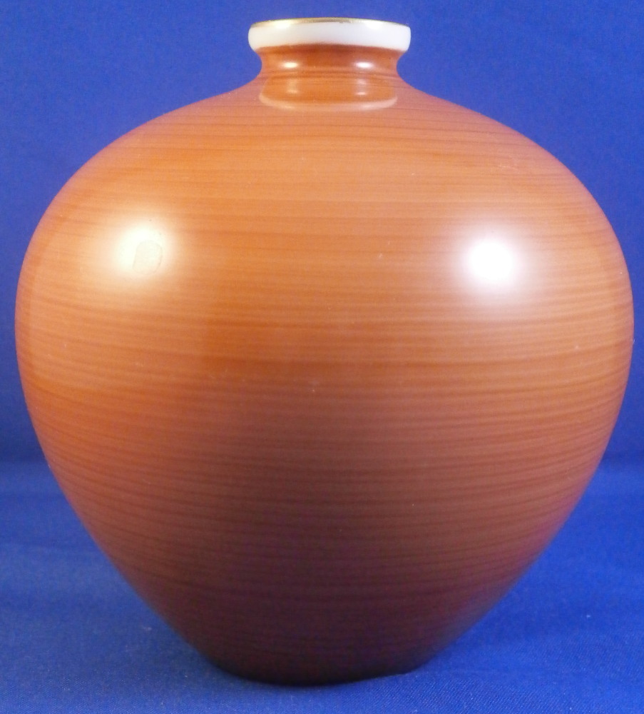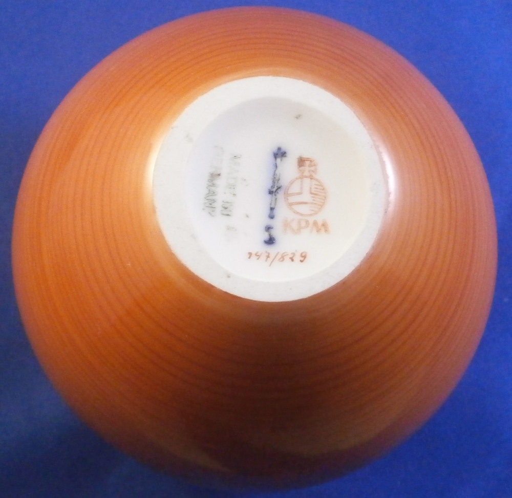 This is a small but superb vase made by KPM in the mid 20th century. I believe this spiralling orange ground ring decor was the design of the famous Trude Petri. A simple shape with a spiral / fun ring design decoration. Orange in color but the rings have different shades to give it more depth. The top is left white with a gold trim to the edge. A very elegant looking piece! The vase is in superb condition with some minor use marks common to these pieces. It is 4.125 inches tall and 3.75 inches in diameter. The bottom of the piece is marked underneath with the under glaze blue scepter mark with the letter S for the Selb location under that as well as the red orb mark, some red numbers and Made in Germany in green. So this would date to before 1949 when theys tarted using West Germany to mark items. Please email me for more information or other pictures.