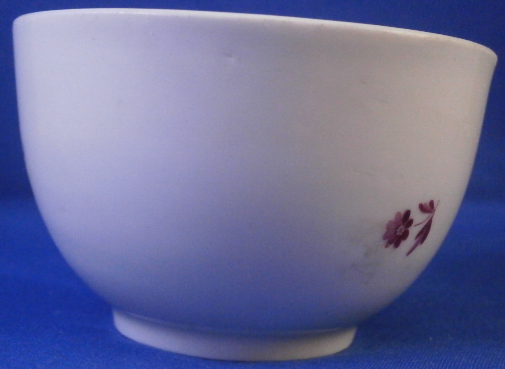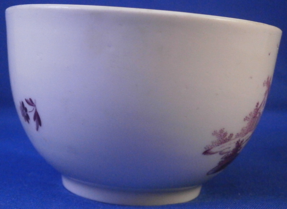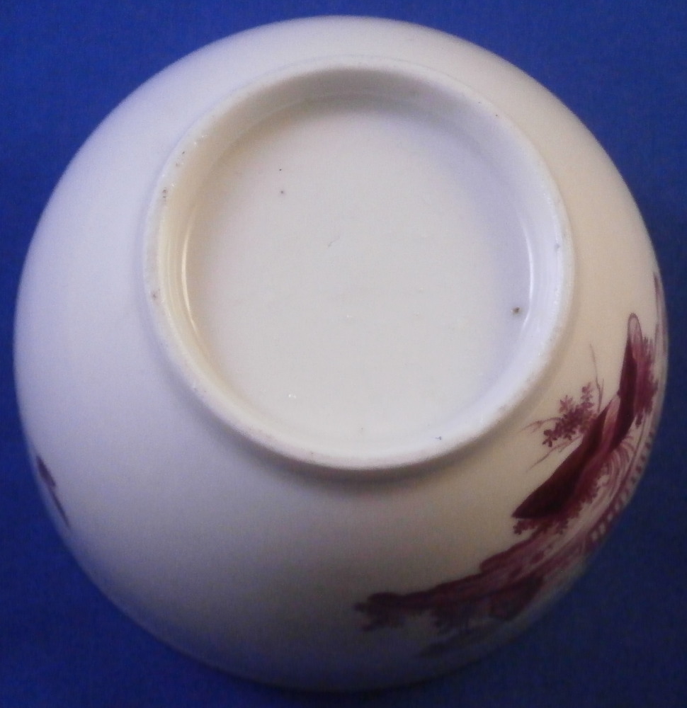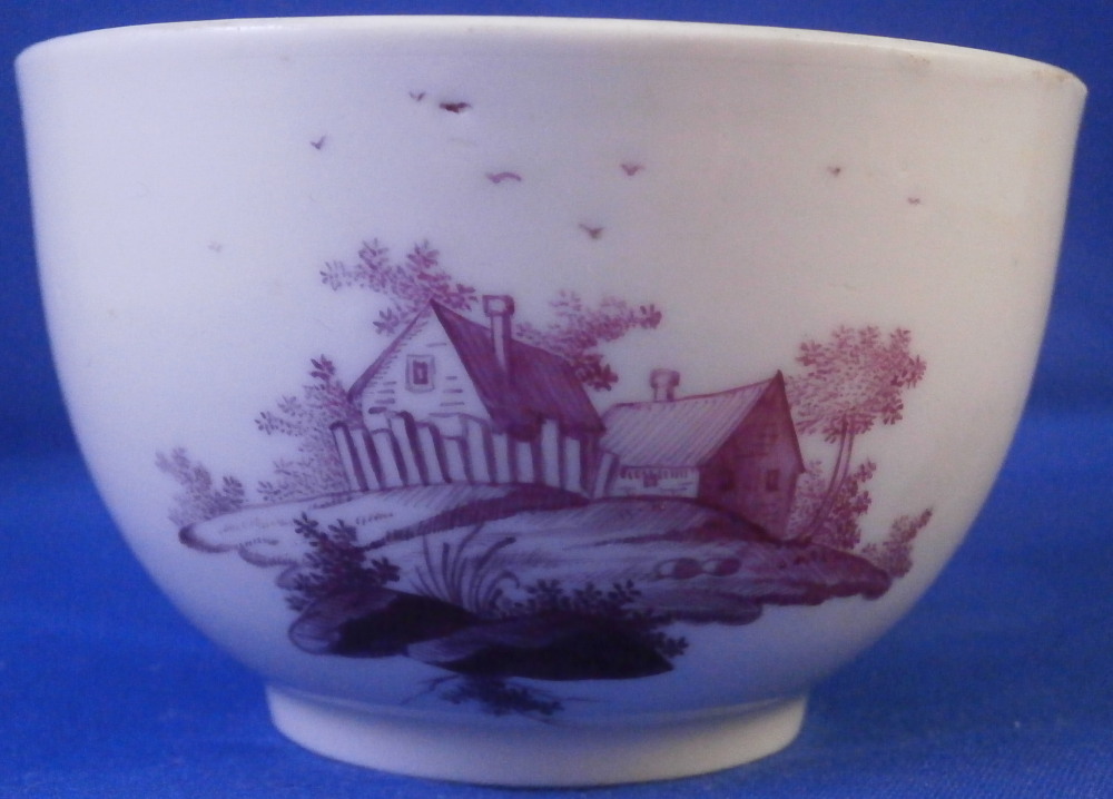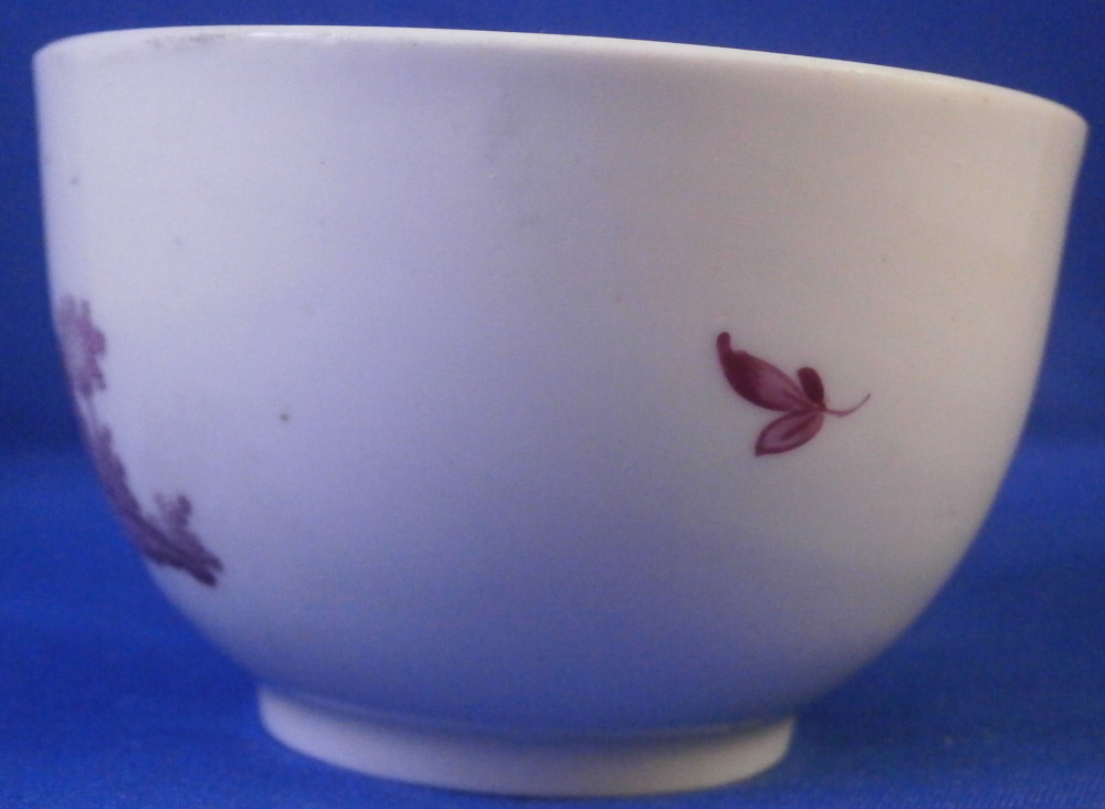 This is a nice cup and saucer set made by Limbach around 1780. Limbach was founded in 1762 and made porcelain until about 1850. Both pieces have a hand painted scene in puce of a couple of buildings in a nice landscape surrounding with three little leaves filling in the rest of the space. Both scenes include the same two larger buildings which is neat. They are both in perfect condition as shown. The saucer is marked underneath with the under glaze blue crossed L mark meant to imitate the Meissen crossed swords mark while the cup is unmarked. The cup is 1.875 inches tall and 3 inches in diameter. The saucer is 1.25 inches tall and 5.25 inches in diameter. A great set by one of the nicer smaller makers! Please e-mail me for more information or photos.
