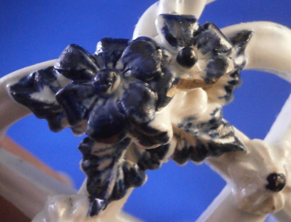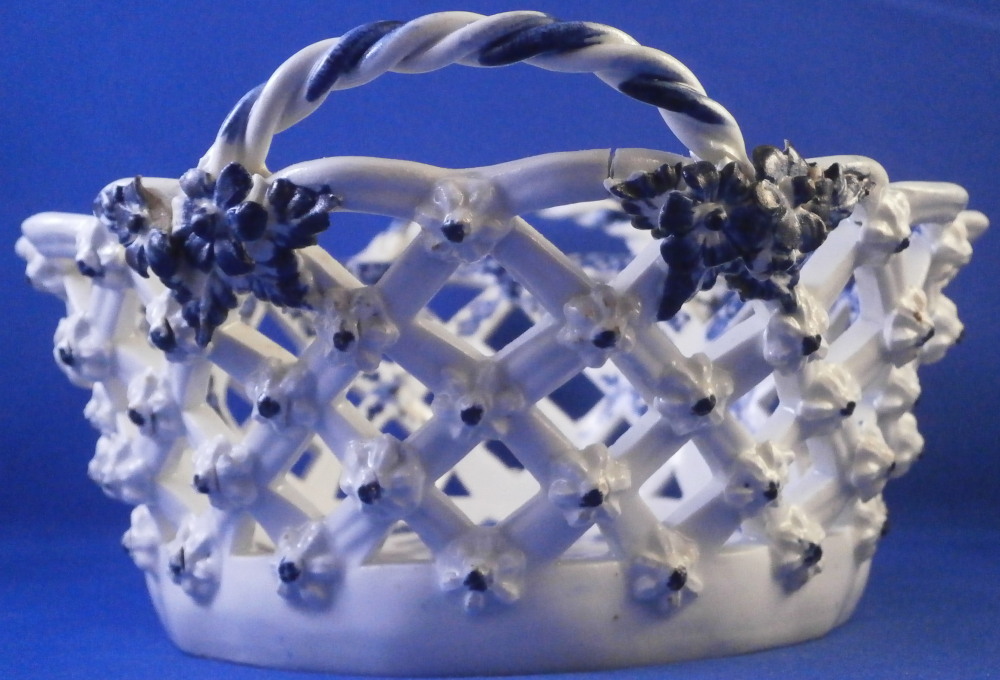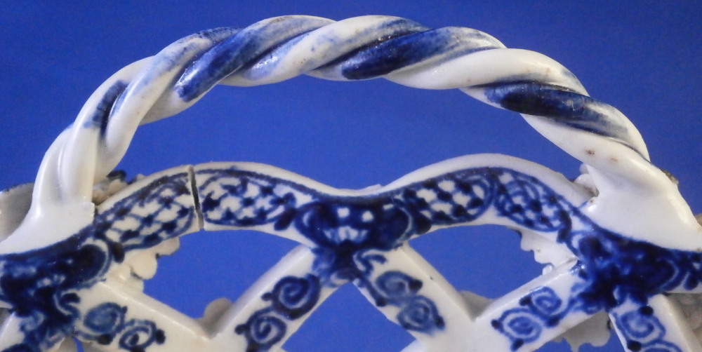 This is a superb chestnut basket made by Lowestoft in the 18th century. A smaller version that the other one I have up for sale. Looks very much like the Worcester model except for an extra round of decoration to the inside lattice lower part. The piece is decorated with the pinecone pattern in under glaze blue and has reticulated sides in a lattice pattern with applied flowers on the intersections. A rope twist handle to either side with the terminals having moulded flowers and leaves to them. Nice blue designs to the inside rim and lower part as shown. A really nice example and in pretty nice condition though not perfect. There are three splits to the top edge where the paste shrank too much during the firing process. This is not later damage but from when it was made. There is also a flower petal chipped off on one terminal of each of the handles. Impossible to spot when on display but I like to be very thorough. One of the applied flowers is missing its blue center. Not damage but the painter must have missed it. The inside decoration along the lattice is nice and crisp! A very nice example for this maker. The basket is unmarked which is the norm for this maker and time period. The piece is about 3.25 inches tall including the handles, 6.875 inches wide and 6.125 inches deep. Please email me for more information or other pictures.