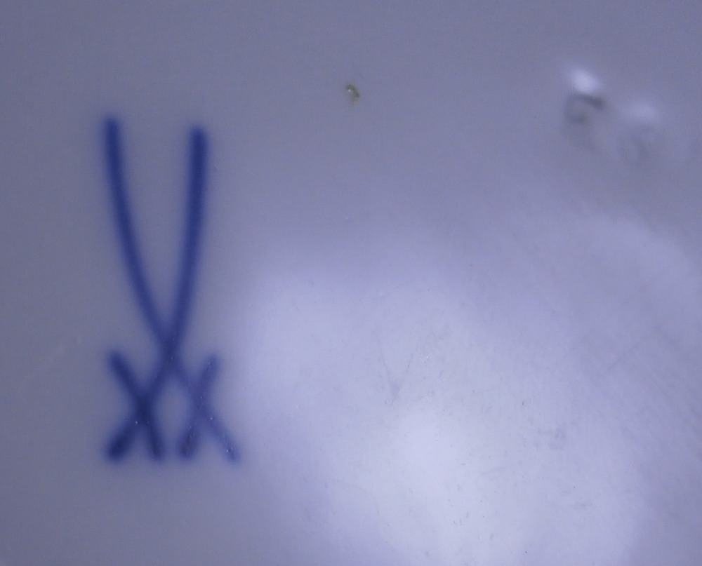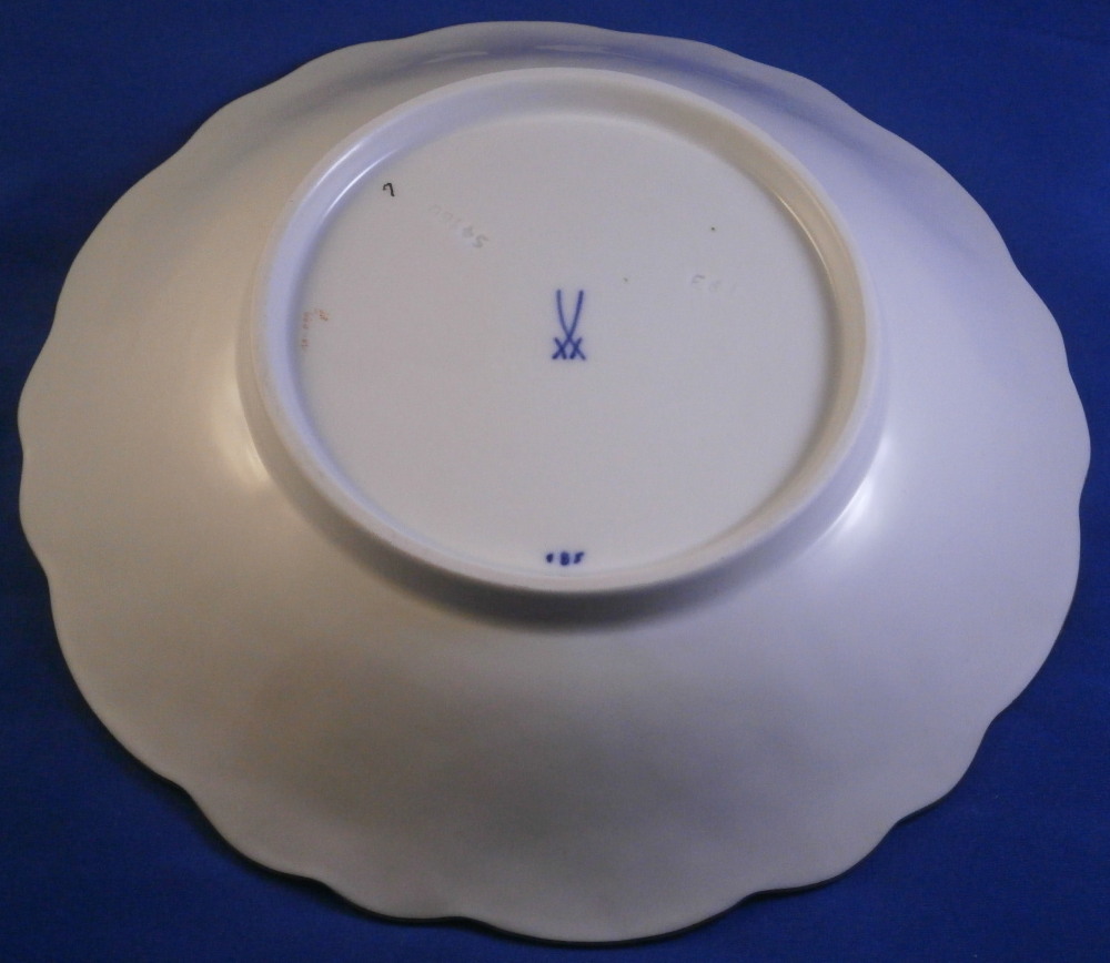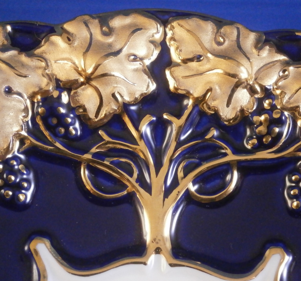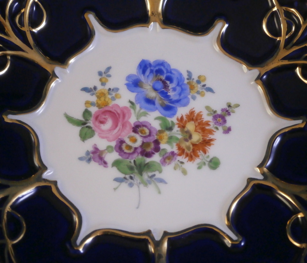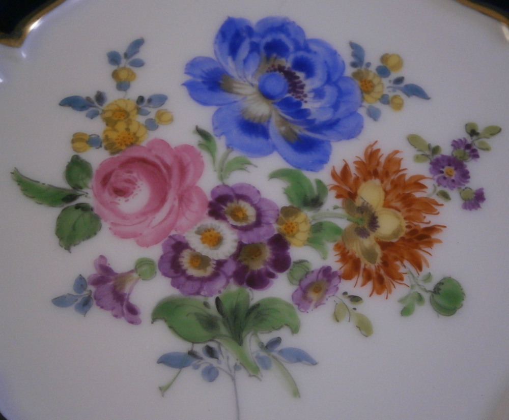 This is a really cute bowl or small serving dish made by Meissen during the 20th century. A smaller version of the much more common charger sized pieces. The bowl is decorated with that amazing cobalt blue ground color along the rim with a relief design of grape leaves along with their vines and some grapes all highlighted with full gilding that is partially flat and partially shiny. Nicely shaped edge. The center has a nicely hadn painted polychrome floral arrangement to it. The combo of the cobalt blue, the gold and the floral design looks amazing! A really stunning look! The piece is in great condition with two or three spots in the thicker parts of the vines that have blue showing through the gold. It is not wear but looks like they tooled it to much to get it shiny and then parts were regilded and missed those spots. You can see it under the loop. Definitely factory made. Nothing major and it's still a first choice and does not take away from the piece and it looks amazing! The dish is marked underneath with the under glaze blue swords mark as well as the usual impressed and artist's marks, etc. as shown. It is 1.625 inches tall and 8.375 inches in diameter. Please email me for more information or other pictures.