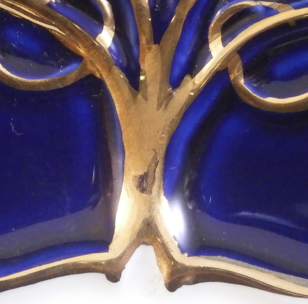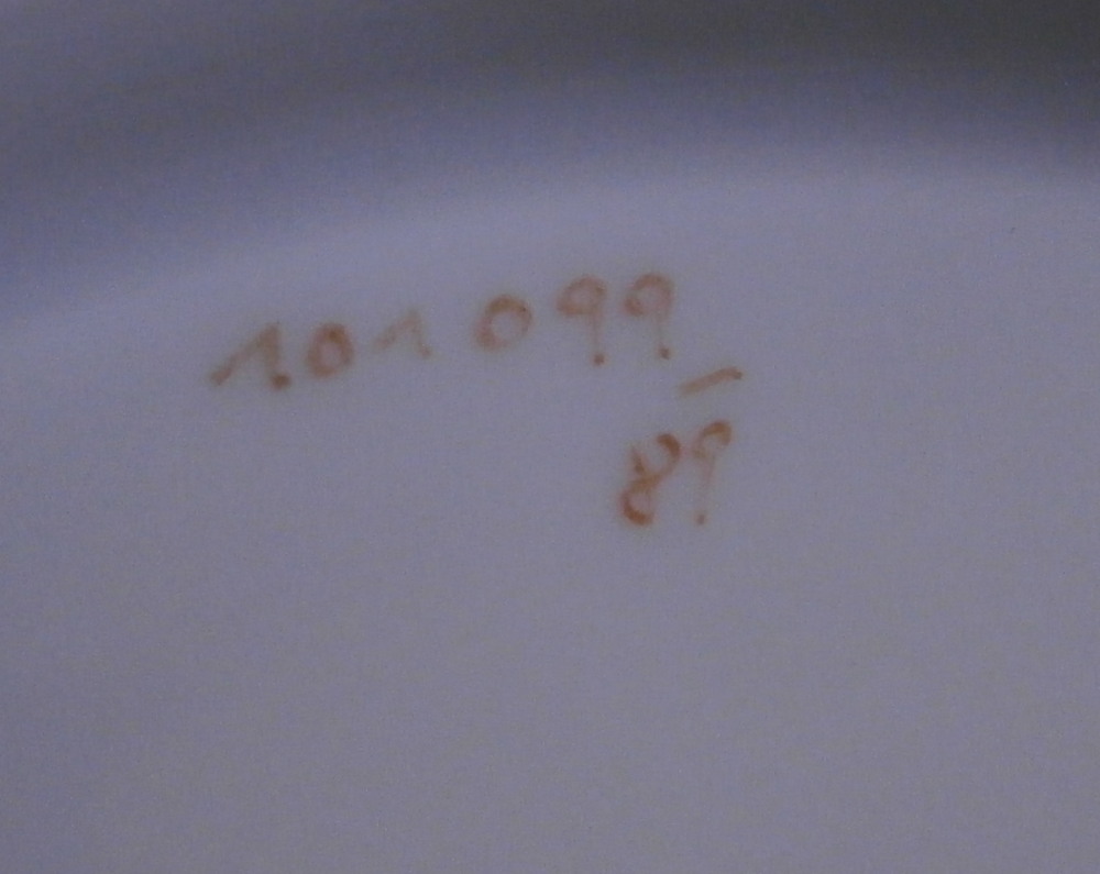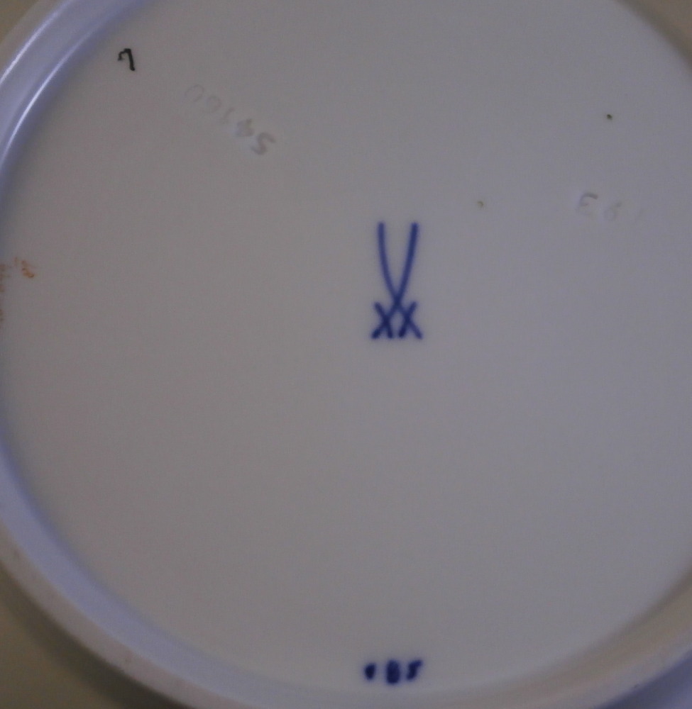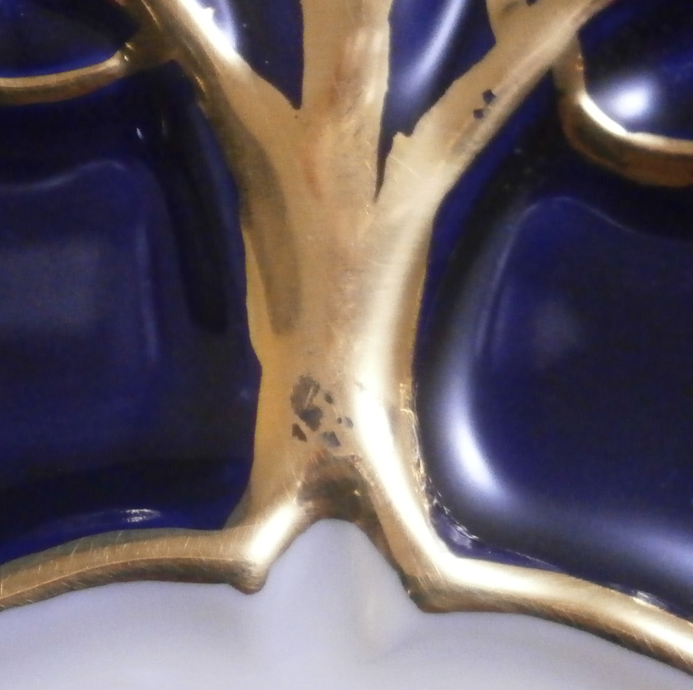 This is a really cute bowl or small serving dish made by Meissen during the 20th century. A smaller version of the much more common charger sized pieces. The bowl is decorated with that amazing cobalt blue ground color along the rim with a relief design of grape leaves along with their vines and some grapes all highlighted with full gilding that is partially flat and partially shiny. Nicely shaped edge. The center has a nicely hadn painted polychrome floral arrangement to it. The combo of the cobalt blue, the gold and the floral design looks amazing! A really stunning look! The piece is in great condition with two or three spots in the thicker parts of the vines that have blue showing through the gold. It is not wear but looks like they tooled it to much to get it shiny and then parts were regilded and missed those spots. You can see it under the loop. Definitely factory made. Nothing major and it's still a first choice and does not take away from the piece and it looks amazing! The dish is marked underneath with the under glaze blue swords mark as well as the usual impressed and artist's marks, etc. as shown. It is 1.625 inches tall and 8.375 inches in diameter. Please email me for more information or other pictures.