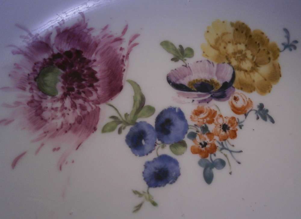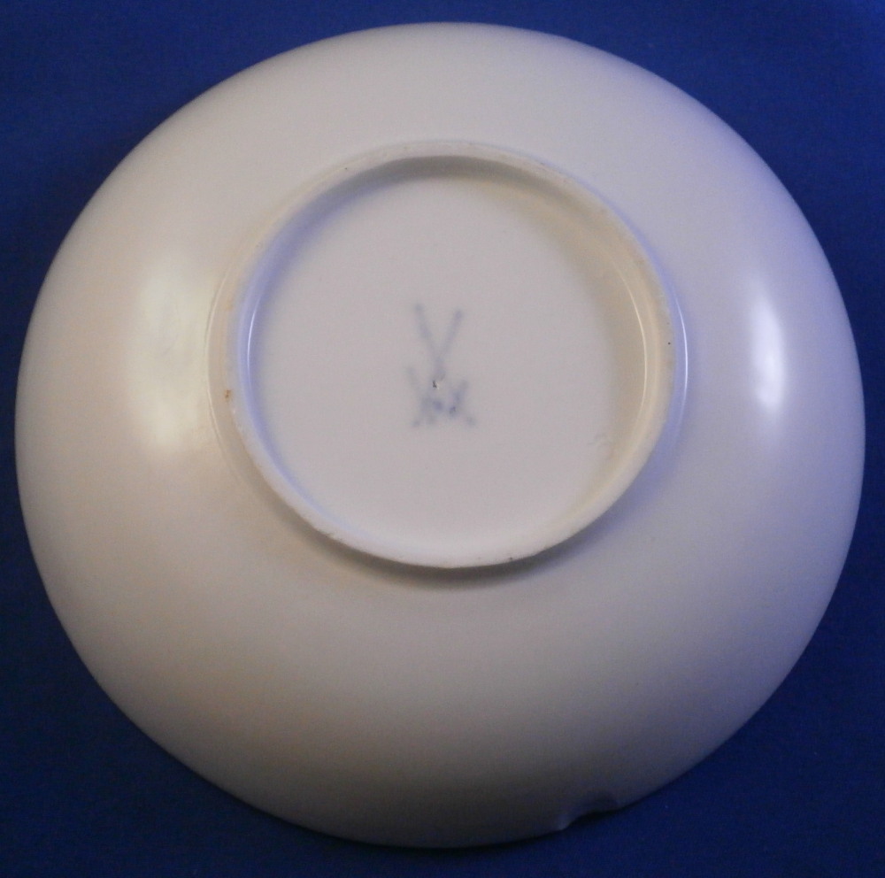 This is a saucer made by Meissen in about 1765. It is nicely hand painted with one larger floral arrangement on one side as well as three single flwoers to fill in the rest of the space, Brown trim to the edge. A fairly simple design for them but still quite nice. The saucer is marked with the under glaze blue crossed swords mark with the dots between the bottom parts underneath as well as a number impressed by the foot ring as shown. The piece displays nicely but does ahve a large chip to mostly the outside edge as shown. Your can see it from the outside edge but mostly it is hidden when on display. There is also a glaze skip near the same area that can been seen in the same pictures. The saucer is 1.125 inches tall and just over 5.25 inches in diameter. Please email me for more information or other pictures.