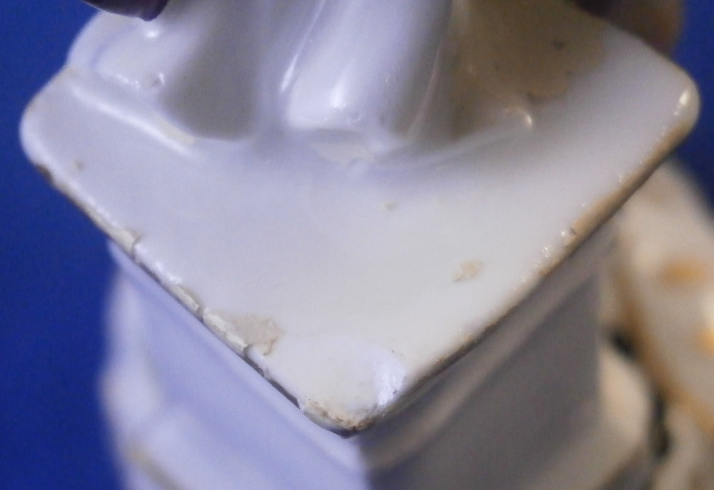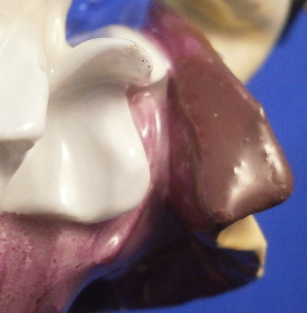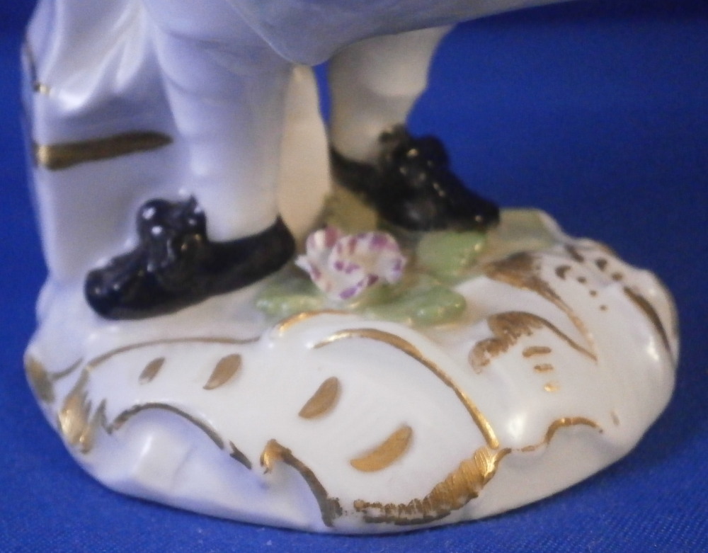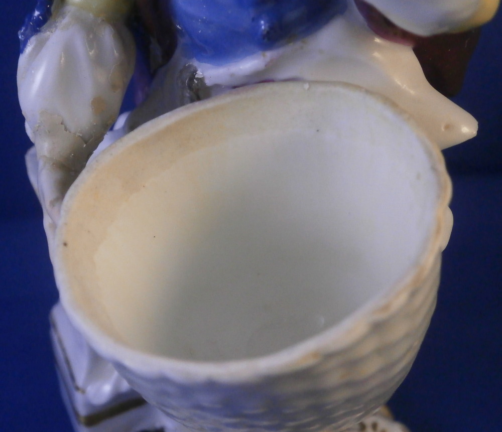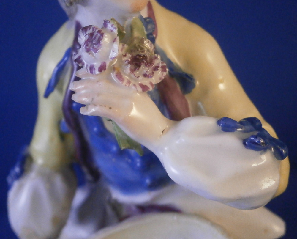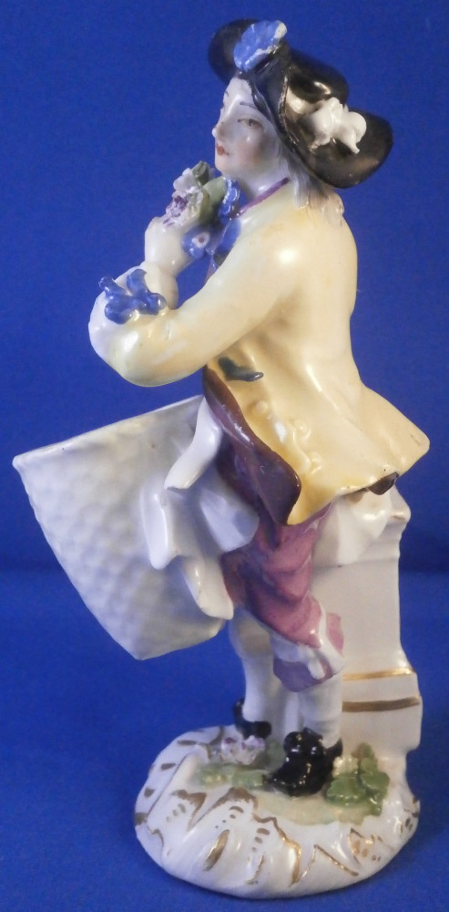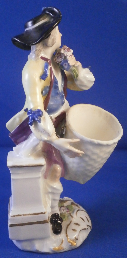 This is a nice early figurine made by Meissen in about 1750. It is a figure of a gentleman holding a bunch of flowers in his left hand and has a basket in front of him. He is nicely dressed with a black hat, a fancy yellow and purple jacket with blue bows and light purple pants. Standing on a typical base with gilded scrolls to the front plus some flowers and leaves to the top and a column in the back. A nice example from the mid 18th century. Lots of nice detail as one would expect from a Meissen figurine. The figurine is in good condition for the age with some expected small issues. The back of the hat has a tiny chip to it, both bottom corners and the bottom of one of the fold of the jacket have been restored, a flat chip to the corner of the top of the column and his right hand was off and has been reattached. That could have been done better. Too much over paint there. The fingers are all OK so it's an easy fix. The bottom of the base is flat and filled with only the air hole in it. There are some remnants of the blue crossed swords underneath but they are fairly hard to see. The figure is 5.25 inches tall, 2.25 inches wide and 2.625 inches deep. Please email me for more information or other pictures.