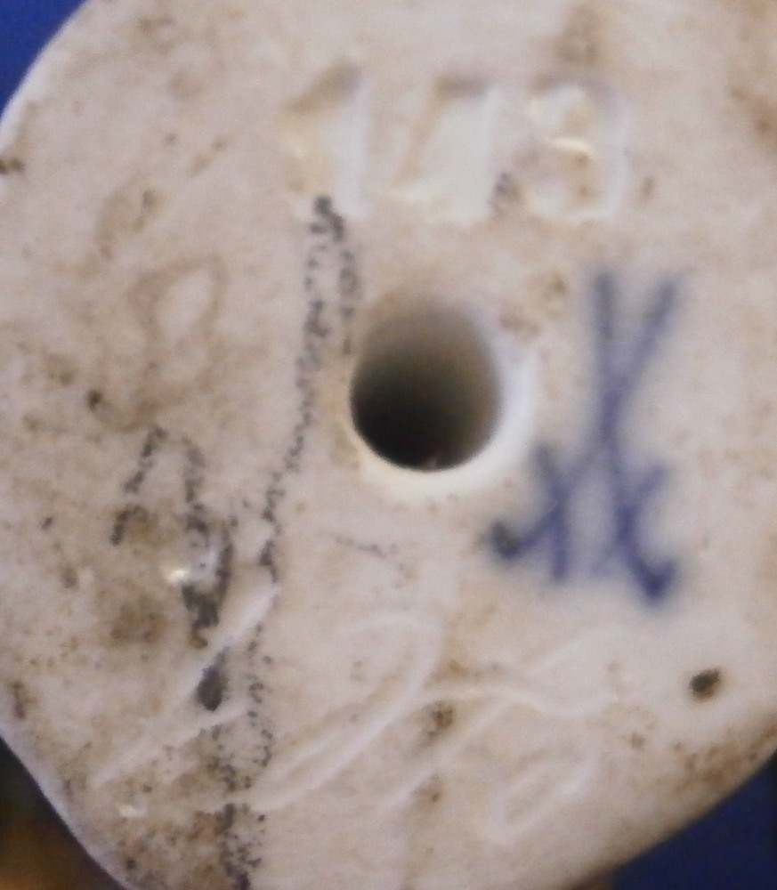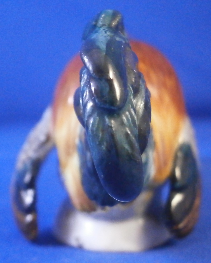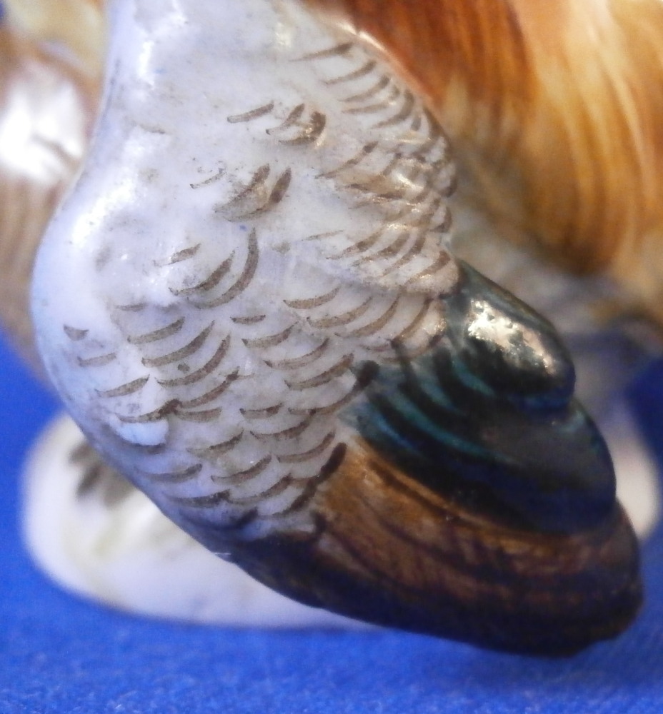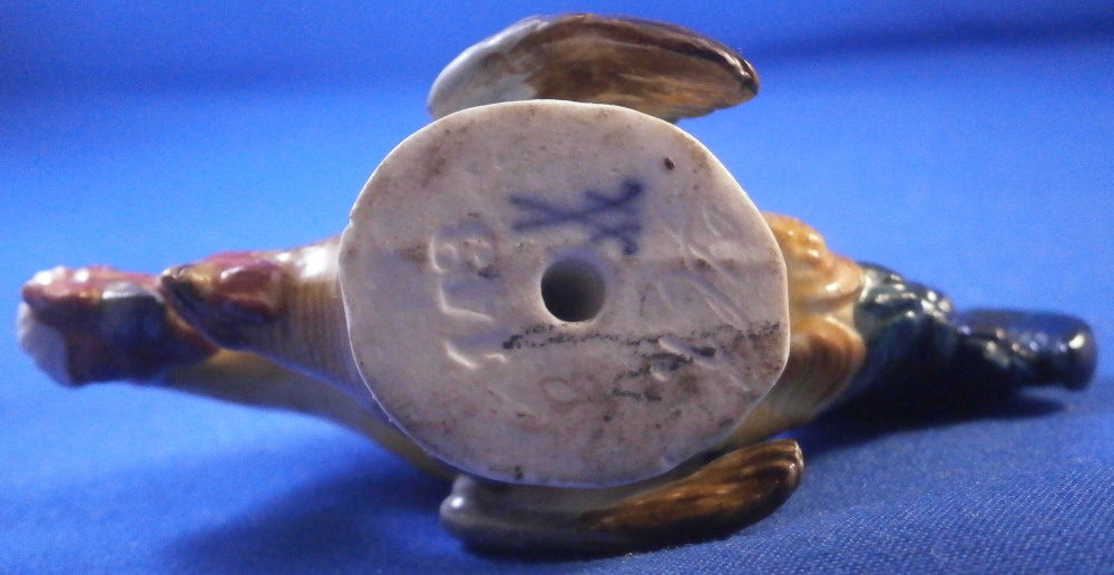 This is a fun miniature chicken figurine made by Meissen in the mid to late 19th century. It's one of the more collected one - I wonder why. The figure is of a rooster and a hen having some special fun. The figurine is superbly modeled and hand painted and in great condition. No chips, restorations, etc. The piece is marked underneath with the blue crossed swords mark as well as the usual incised marks and impressed numbers for this period as shown. The figurine is 1.5 inches tall, 1.375 inches wide and 3 inches long. Please email me for more information or other pictures.
