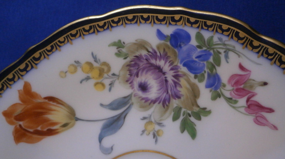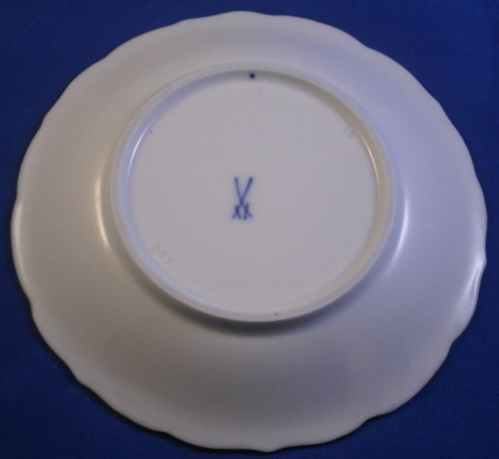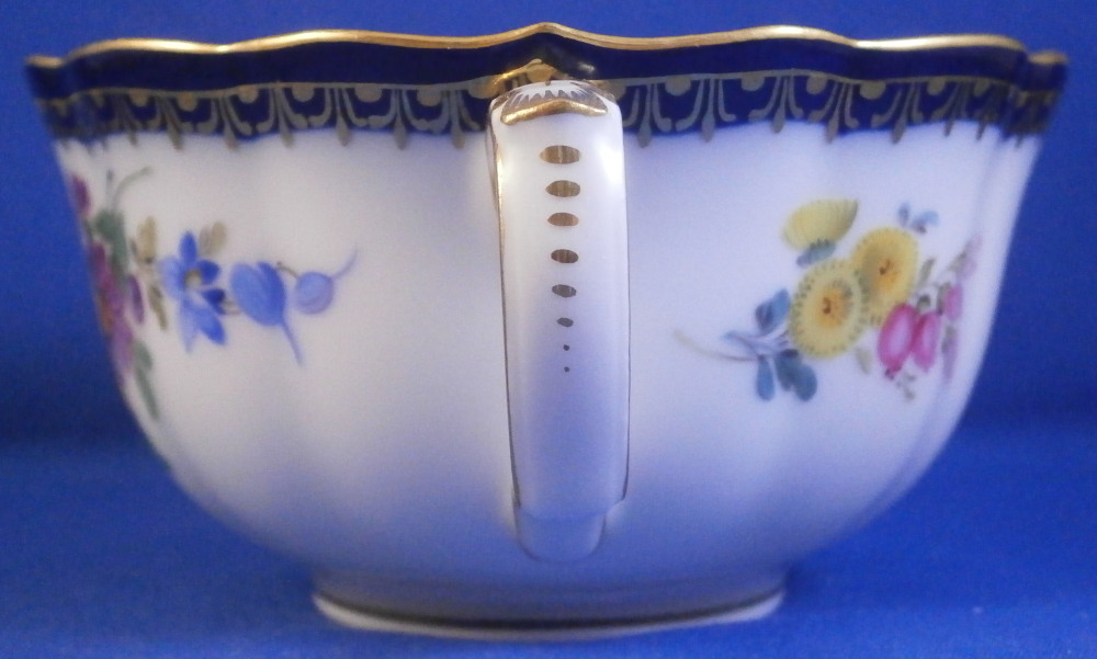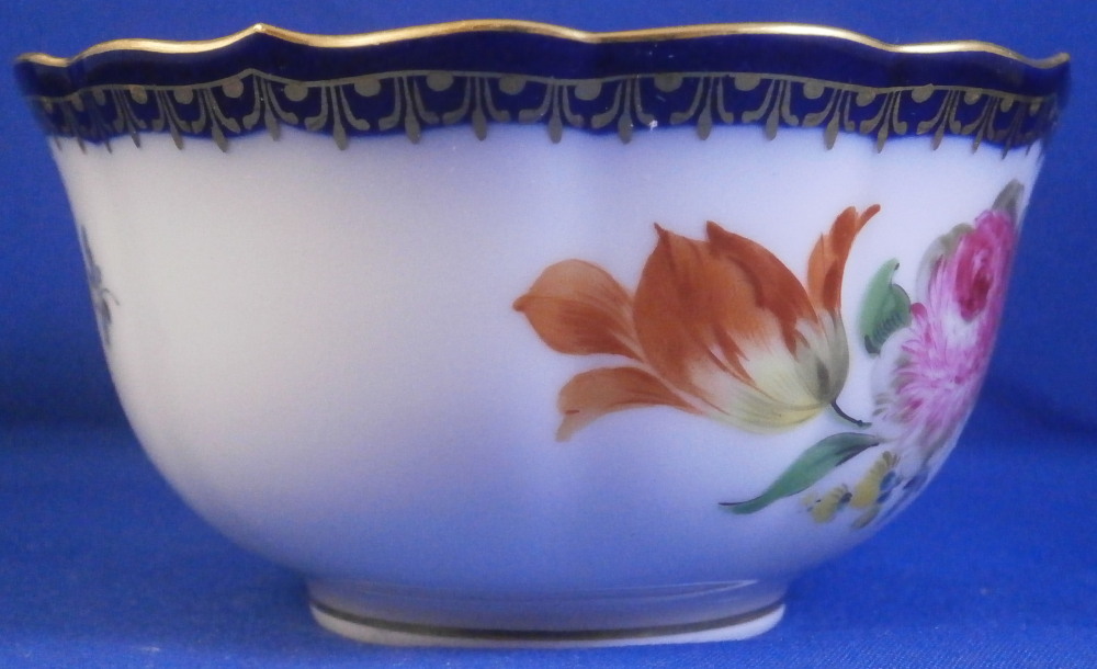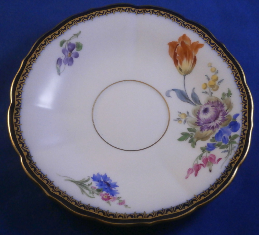 This is a porcelain tea cup and saucer made by Meissenin the 20th century. The decoration is from their A-Kante design with both pieces having a nice edge shape. They are both hand painted with a large polychrome floral arrangement to one side as well as a smaller arrangement and a single flower plus the cobalt blue and gold trim design to the rim that gives this service its name. A nice looking set that is in perfect condition. The saucer is 0.875 inches tall and 5.875 inches in diameter. The cup is 2 inches tall and 3.75 inches in diameter. Both are marked underneath with the under glaze blue crossed swords mark (first choice) as well as the usual impressed numbers, etc. as shown. I also have the sugar dish and creamer up on the site if anyone is interested in multiple pieces from this design. Please email me for more information or other pictures.