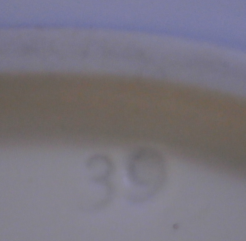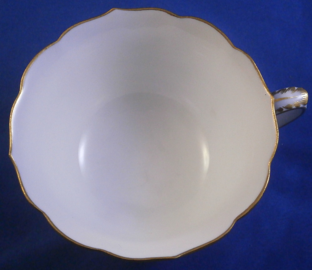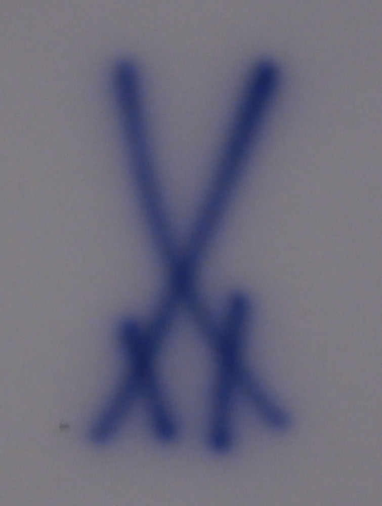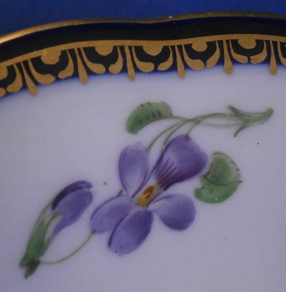 This is a porcelain tea cup and saucer made by Meissenin the 20th century. The decoration is from their A-Kante design with both pieces having a nice edge shape. They are both hand painted with a large polychrome floral arrangement to one side as well as a smaller arrangement and a single flower plus the cobalt blue and gold trim design to the rim that gives this service its name. A nice looking set that is in perfect condition. The saucer is 0.875 inches tall and 5.875 inches in diameter. The cup is 2 inches tall and 3.75 inches in diameter. Both are marked underneath with the under glaze blue crossed swords mark (first choice) as well as the usual impressed numbers, etc. as shown. I also have the sugar dish and creamer up on the site if anyone is interested in multiple pieces from this design. Please email me for more information or other pictures.