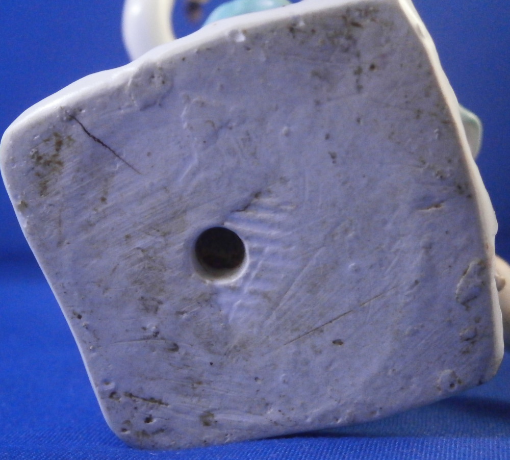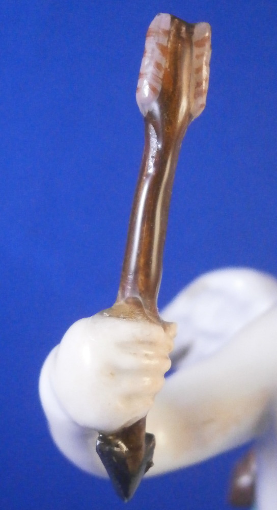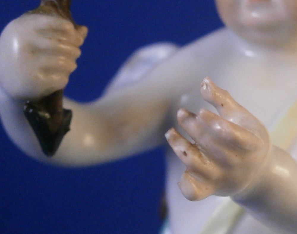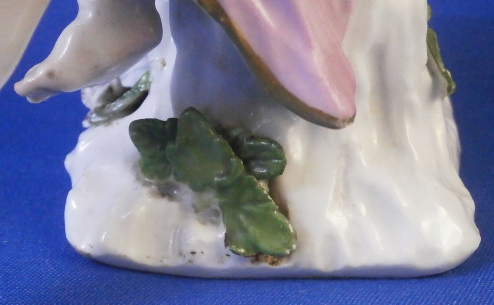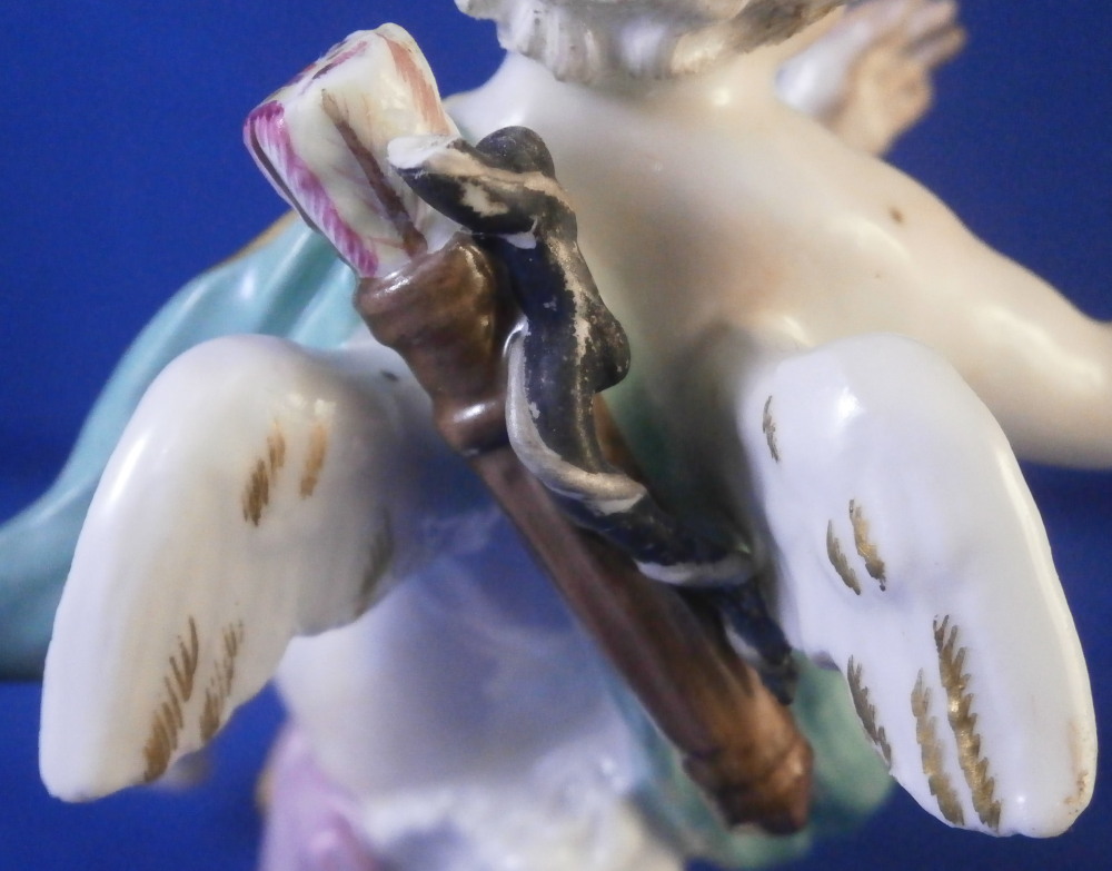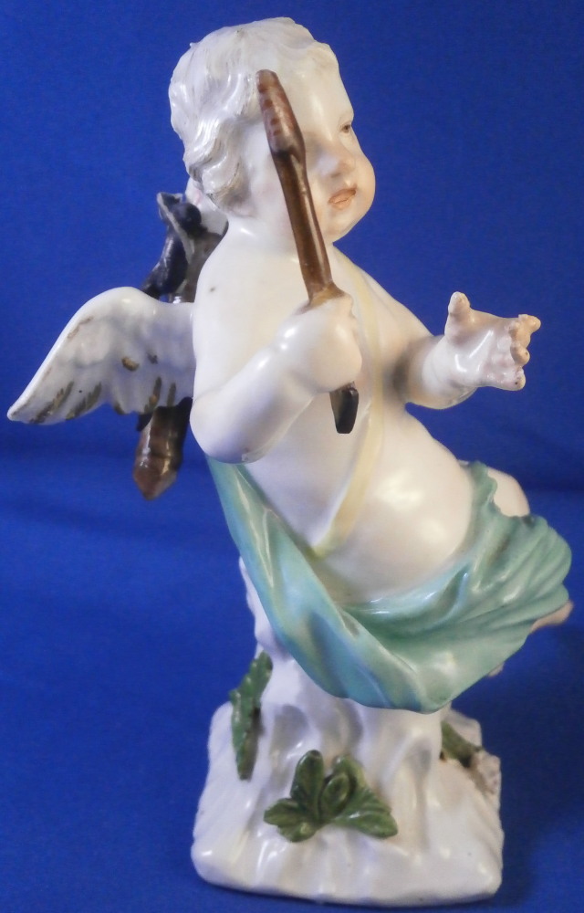 This is a figurine of a cherub / angel / Amor / Cupid made by Meissen in the mid 18th century or about 1750. Cupid is sitting on tree stump that forms the base and has some leaves and a flower attached as decoration. Cupid has a turquoise cloth around his mid section and is holding an arrow in his left hand with a quiver and bow in the back. These early figurines are amazingly modeled and hand painted. I wish they still made them this way today! The figure is in great condition with a restoration to the arrow and thenit broke above the hand again and was reglued. The bow is missing to the top end, the big toe of the left foot has been perfectly restored and some of the leaves are chipped. All in all as nice as they come, Wings, etc. are fine. The bottom of the base is flat and filled with only the air hole in it. Marked with the small blue crossed swords to the bottom back of the base. The figurine is 4.5 inches tall, 2.75 inches wide and 3.25 inches deep. Please email me for more information or other pictures.