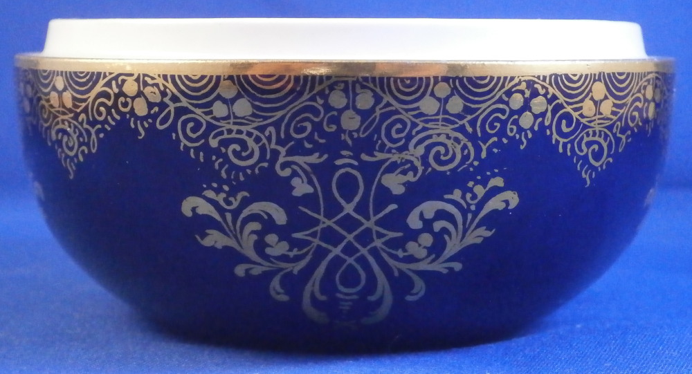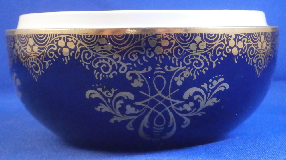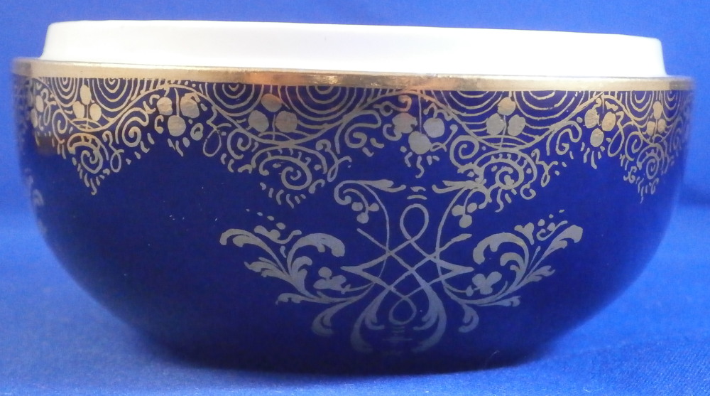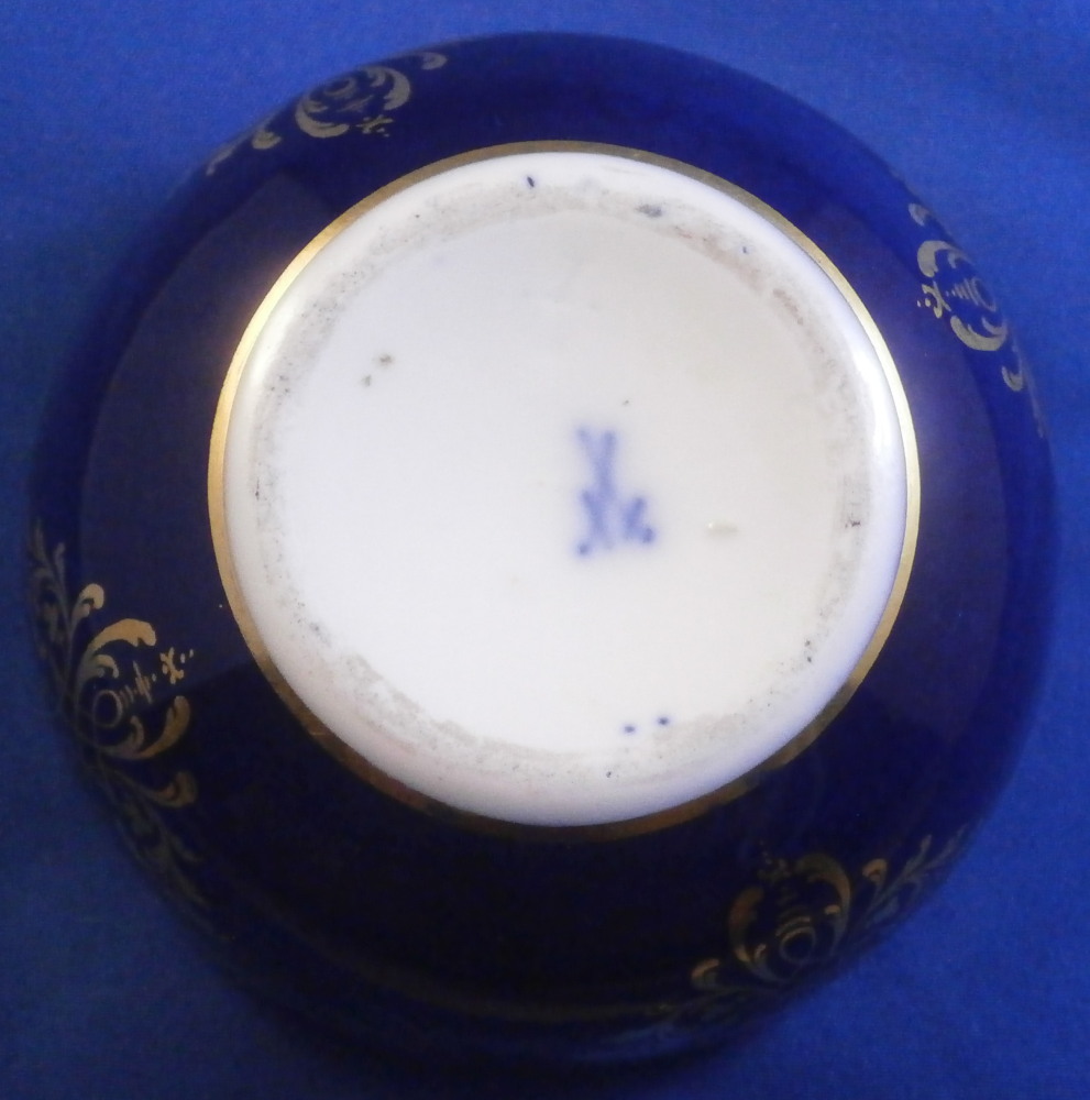 This is a superb little little box made by Meissen in the later 19th century. It is hand painted with a superb Watteau style scene on the lid surrounded by their nice deep cobalt blue color and some superb fancy gold trim. The painting is of superb quality! The bottom part has the same deep cobalt blue ground color and fancy gilding over that. An amazing piece for sure! Typical shape with a domed lid and simple bottom. Gold design to the bottom inside as well. The lidded dish is in perfect condition with a touch of wear to the gold ring around the base only. Displays perfectly! The bottom part is marked with the under glaze blue crossed swords mark (first quality) underneath as well as some incised marks as shown. The box is 2.5 inches tall and 3.375 inches in diameter. Please email me for more information or other pictures.