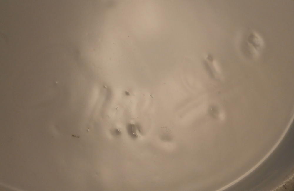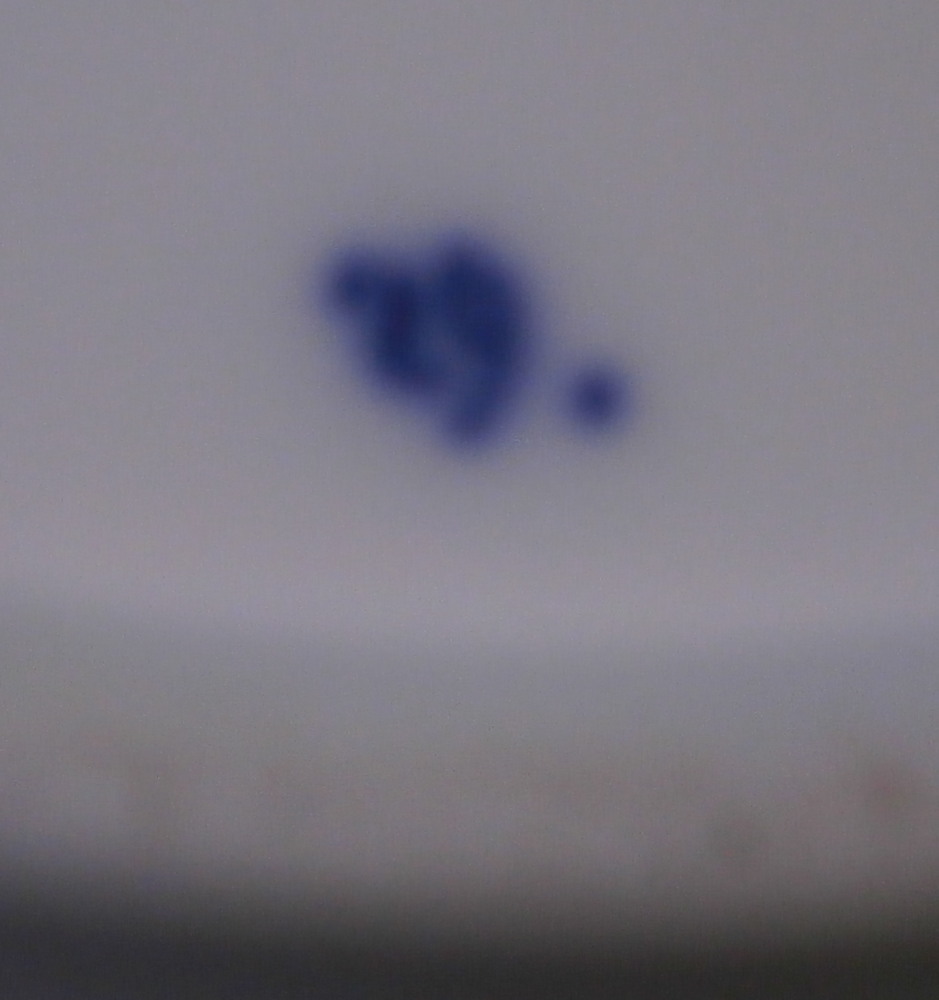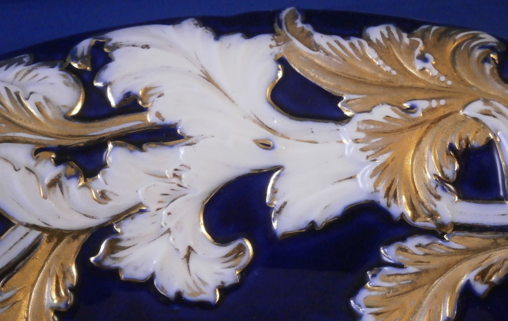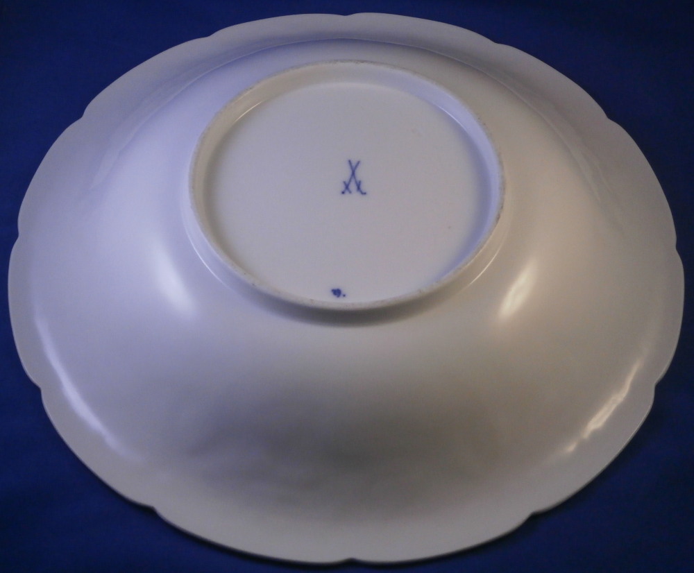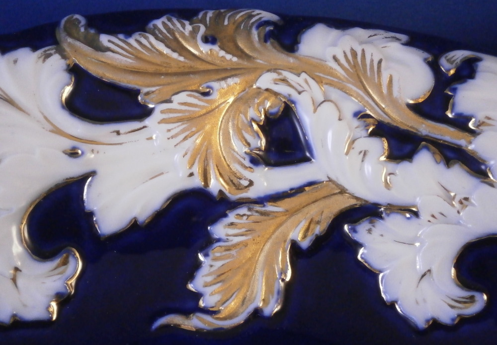 This is a nice large display plate / bowl / charger made by Meissen during the mid 19th century. Not the most exciting decoration ever but as my youngest said - it is really pretty. The dish is of a nice size and the cobalt blue ground color with the relief leaf design highlighted with gilding looks stunning. Sometimes simpler is better! The plate has a ring of relief leaves around the rim that are alternated in terms of decoration. One set is mostly white with just some gold veins while the other set is mostly gilded. That on the blue background really does look pretty. The piece is in good condition with some wear to the gilding though not bad at all and it displays nicely! It is a great size for being able to use it being 2.25 inches tall and having a diameter of 11.875 inches. The piece is marked underneath with the under glaze blue swords mark (first choice) as well as an incised model number and an impressed number as shown plus the blue painter's number. Please email me for more information or other pictures.