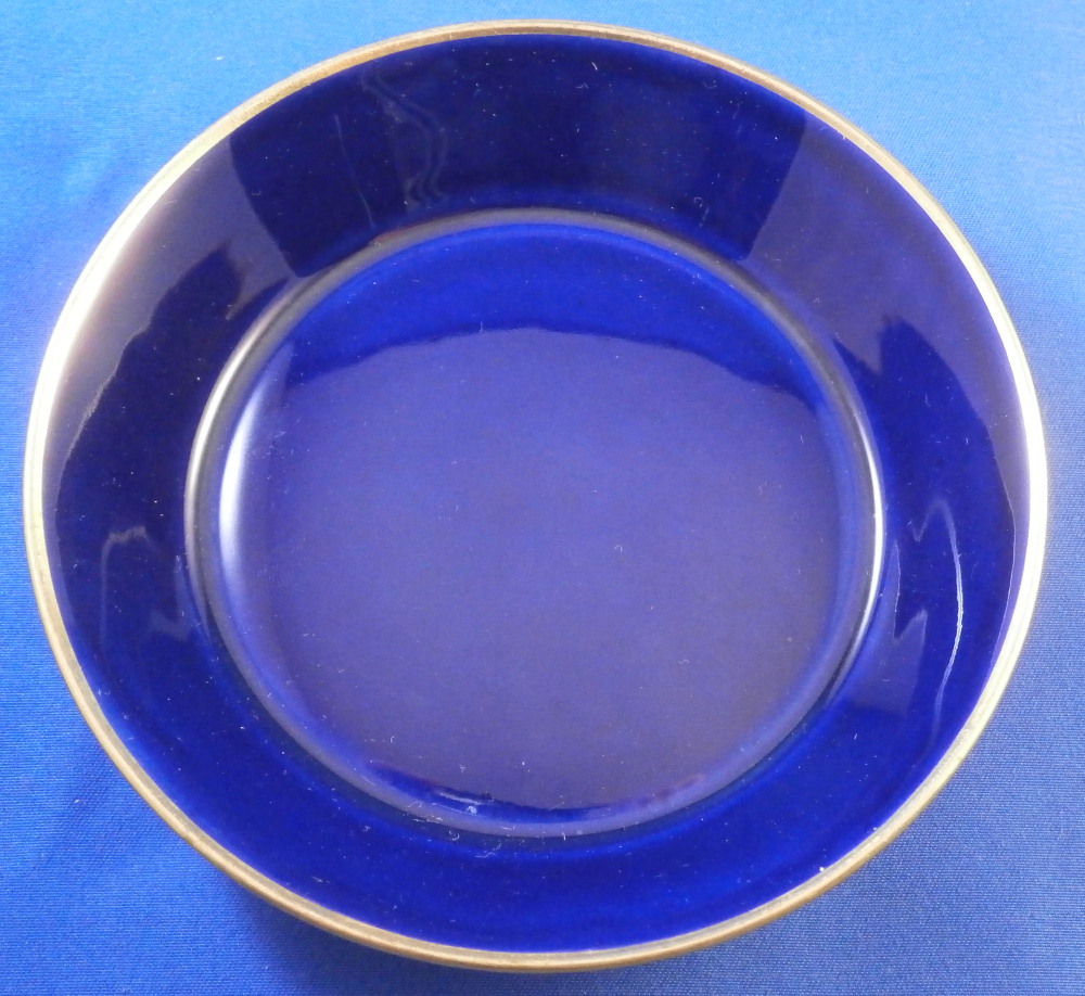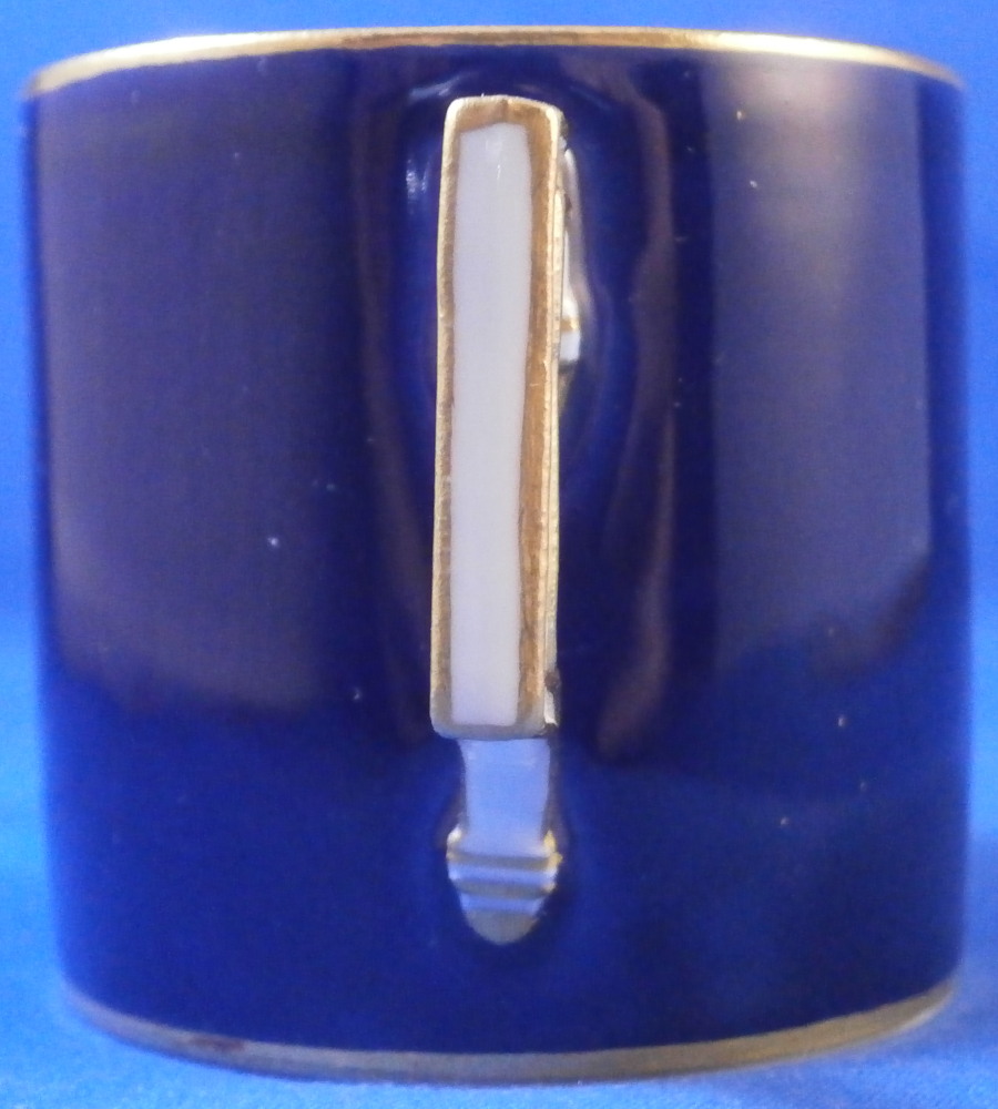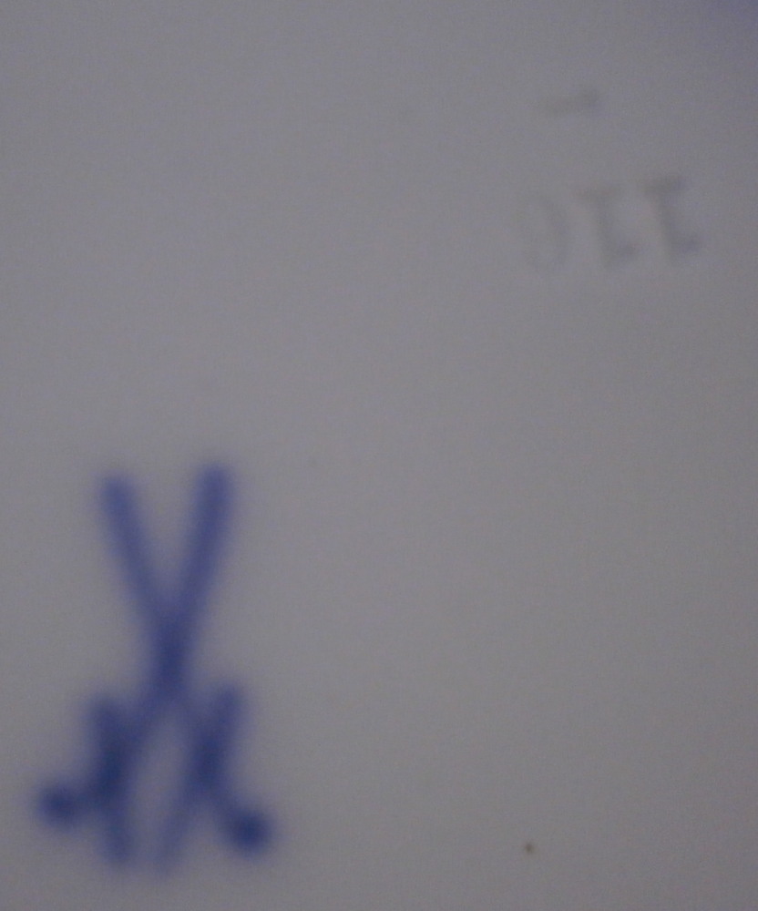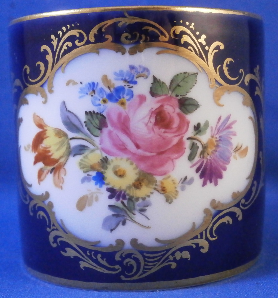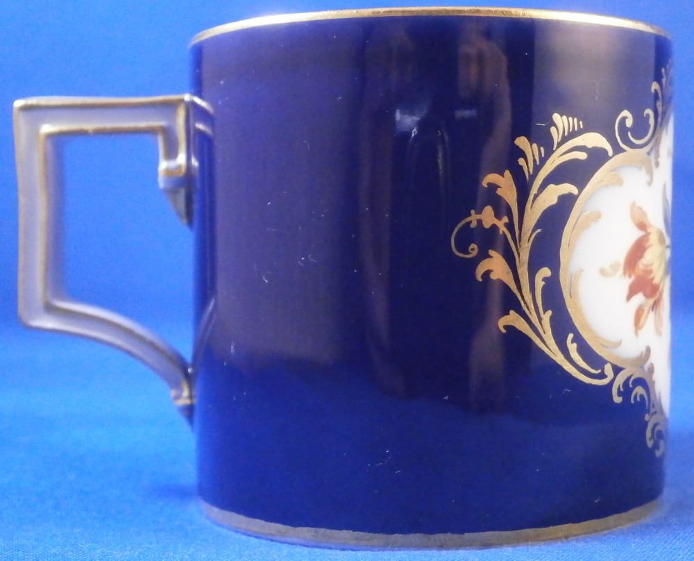 This is a cute little cup and saucer set / demitasse / mocha or espresso coffee cup & saucer made by Meissen during the earlier 20th century. The cup has that superb cobalt blue ground color with a white panel to the front on which a polychrome floral arrangement was painted. It is surrounded by some fancy gilding. Gold trim to the edge and the white classicism syle handle. The saucer is simple in design with the entire piece having a cobalt blue ground color to it with just a simple gold line to the edge but it works well with the fancier cup. The cobalt blue and gold combo always looks stunning! The set is in perfect condition. Both are marked underneath with the under glaze blue crossed swords mark as well as the usual impressed numbers and a black painter's number under the cup as shown. The cup is 2 inches tall with a diameter of 2.125 inches. The saucer is 0.875 inches tall and 4.25 inches in diameter. Please email me for more information or other pictures.