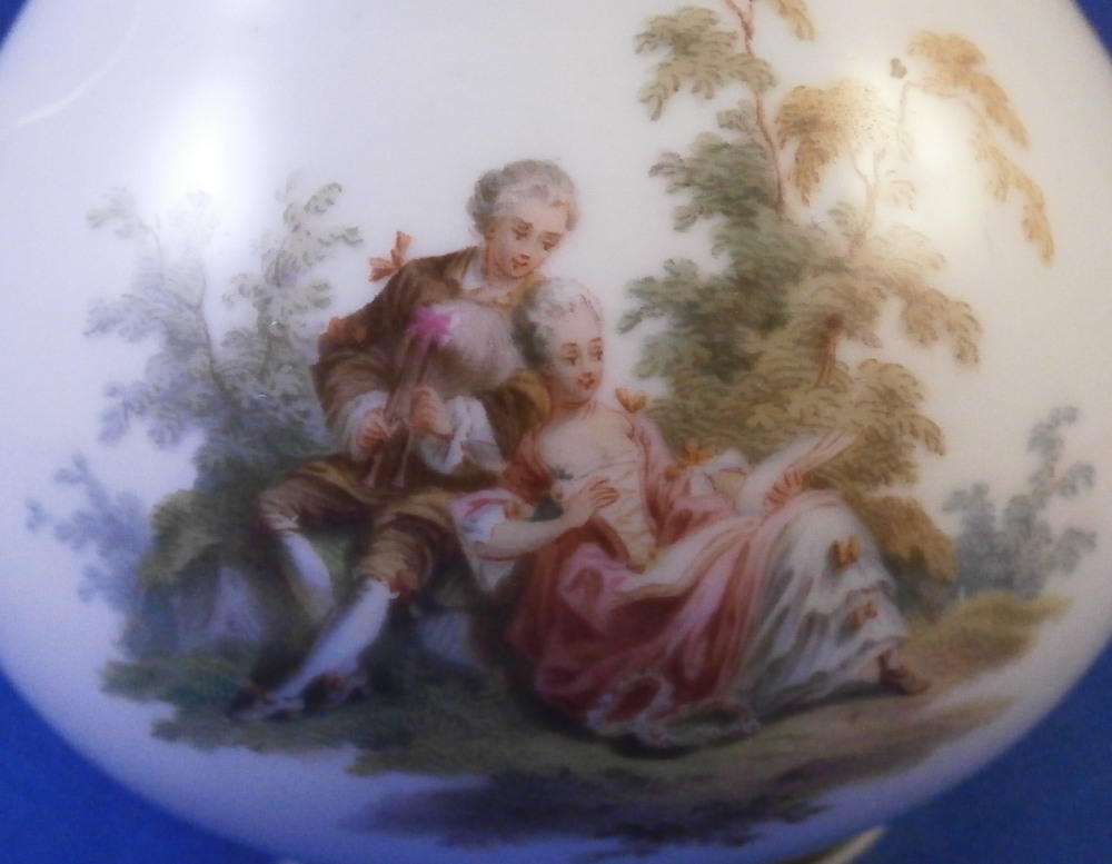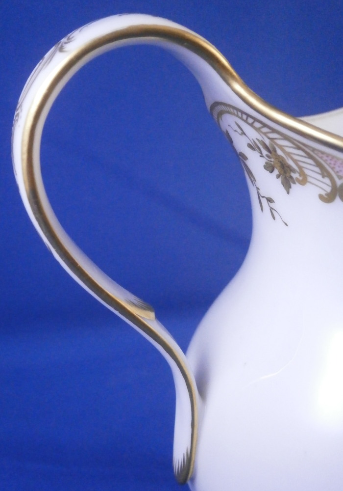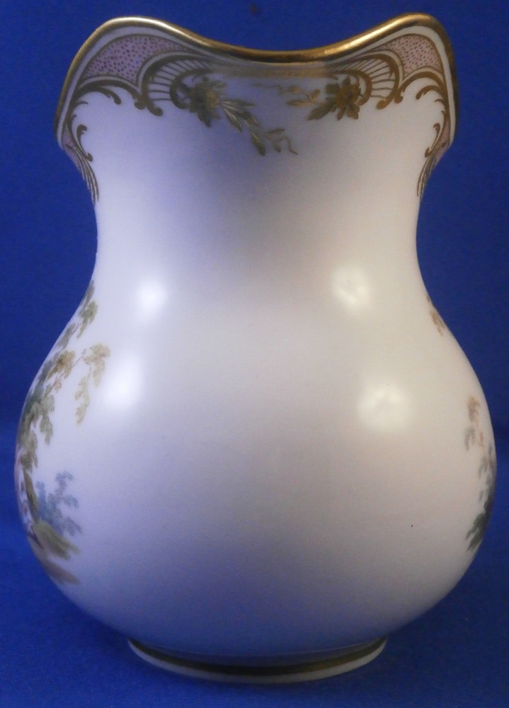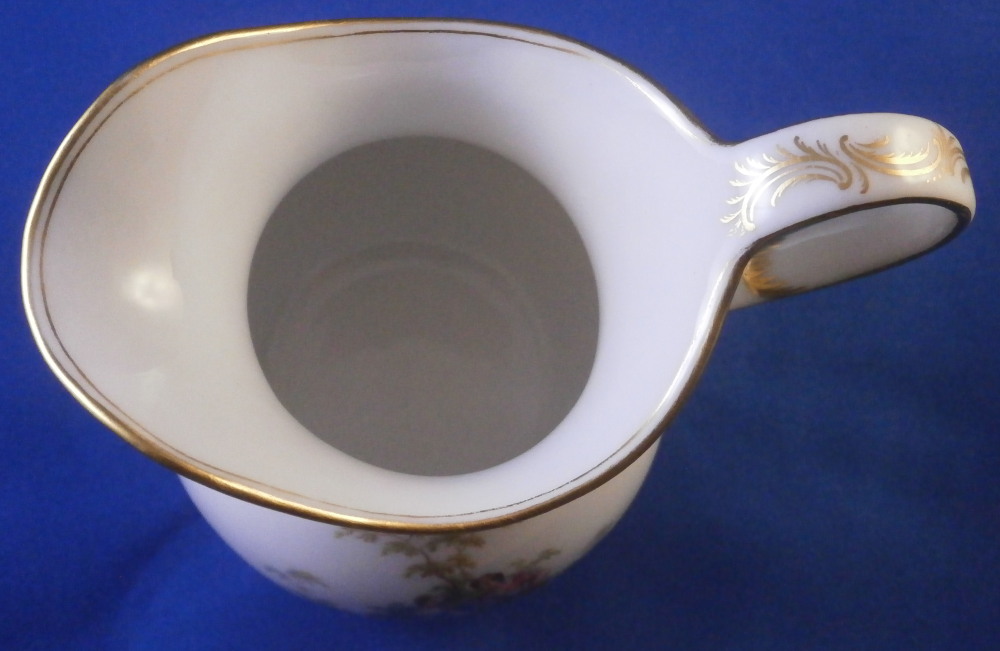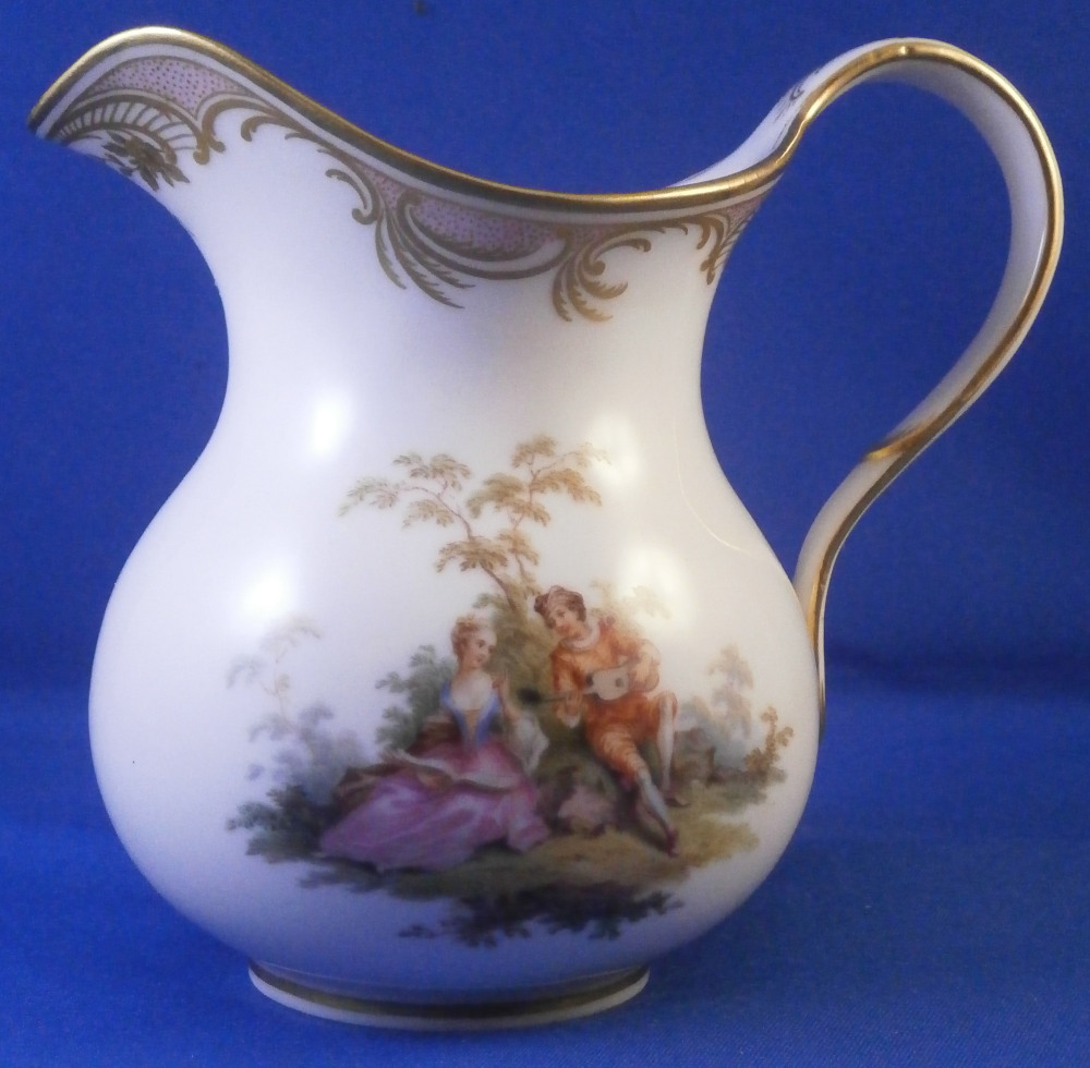 This is a nice creamer made by Meissen in the mid to later 19th century. It has a nice shape to it, a good size as well and is hand painted with a polychrome Watteau style scene on both sides. The scenes include couples in a landscape surrounding. Very nice quality painting! The top rim has a gold design with areas of tiny pink dots in between as shown. Gold line to the inside edge and gold trim to the handle. All in all a very nice example! The creamer is in superb condition with just a spot of two of wear to that tiny thin gold line of the inside edge. As nice as they come! The piece is marked with the under glaze blue crossed swords mark (first choice) underneath as shown. The creamer is 4.125 inches tall at the handle, 3 inches wide and 4.375 inches from spout to handle. Please email me for more information or other pictures.