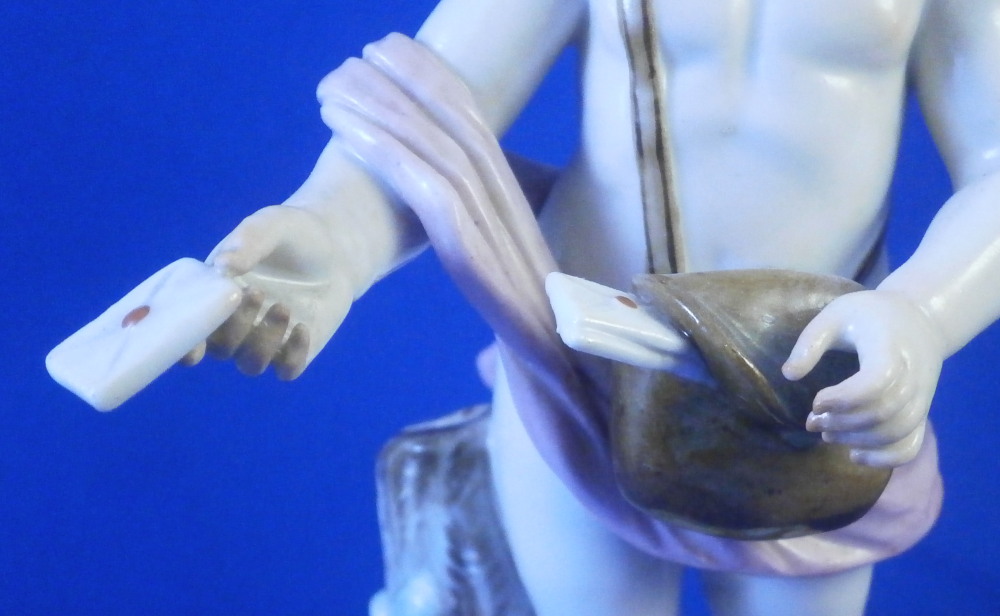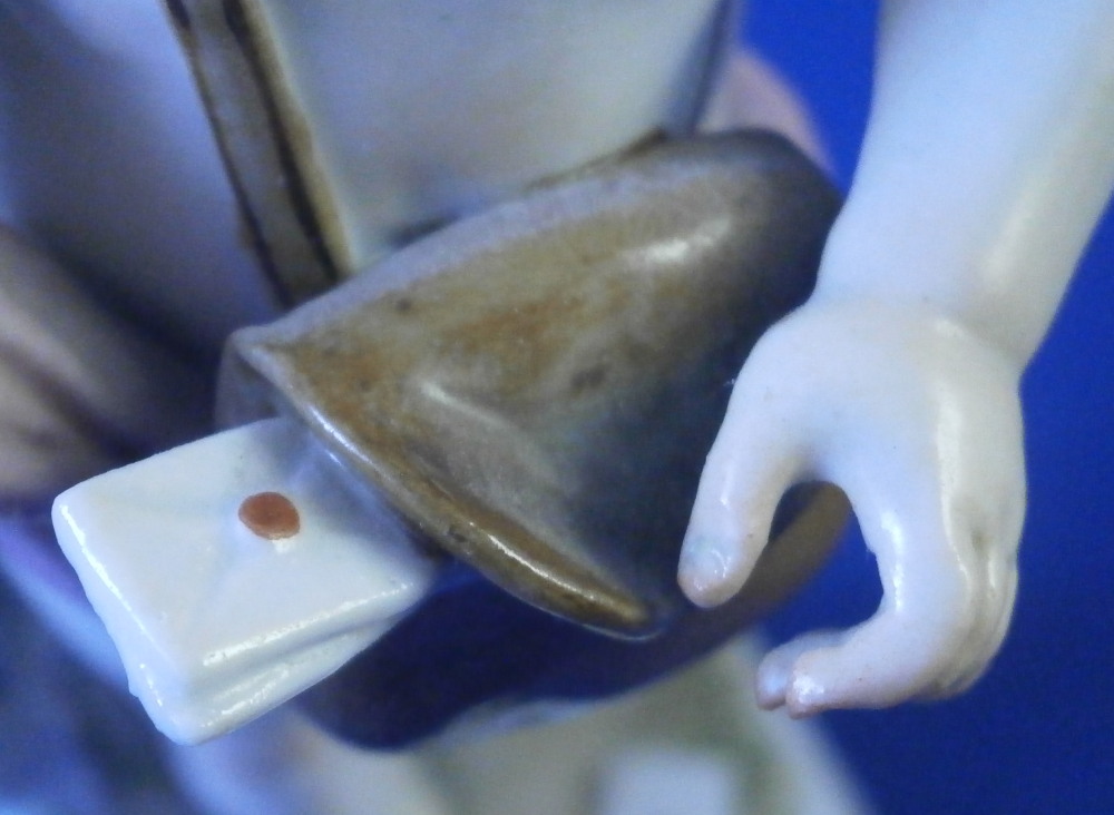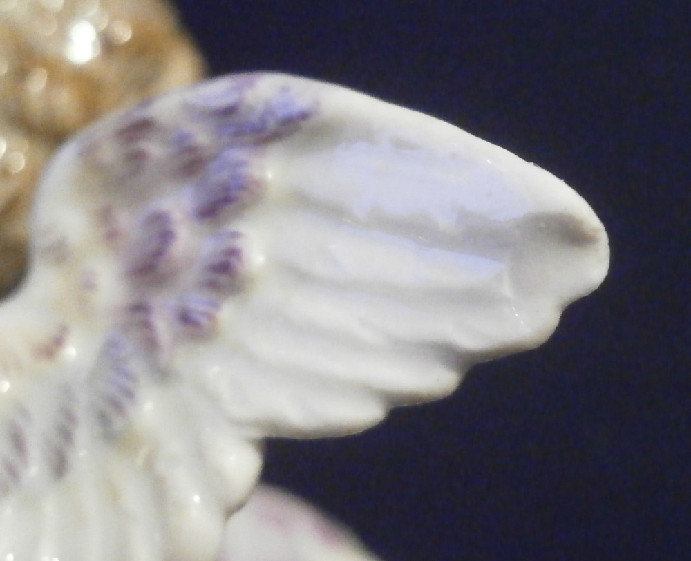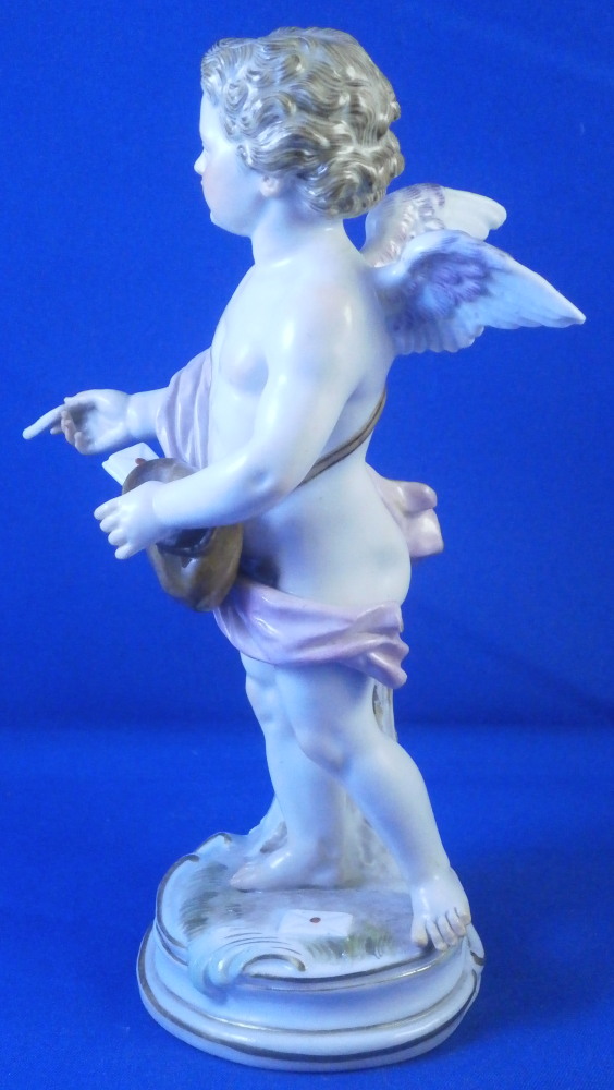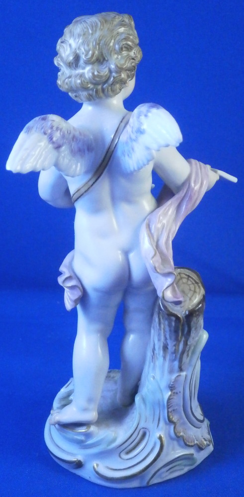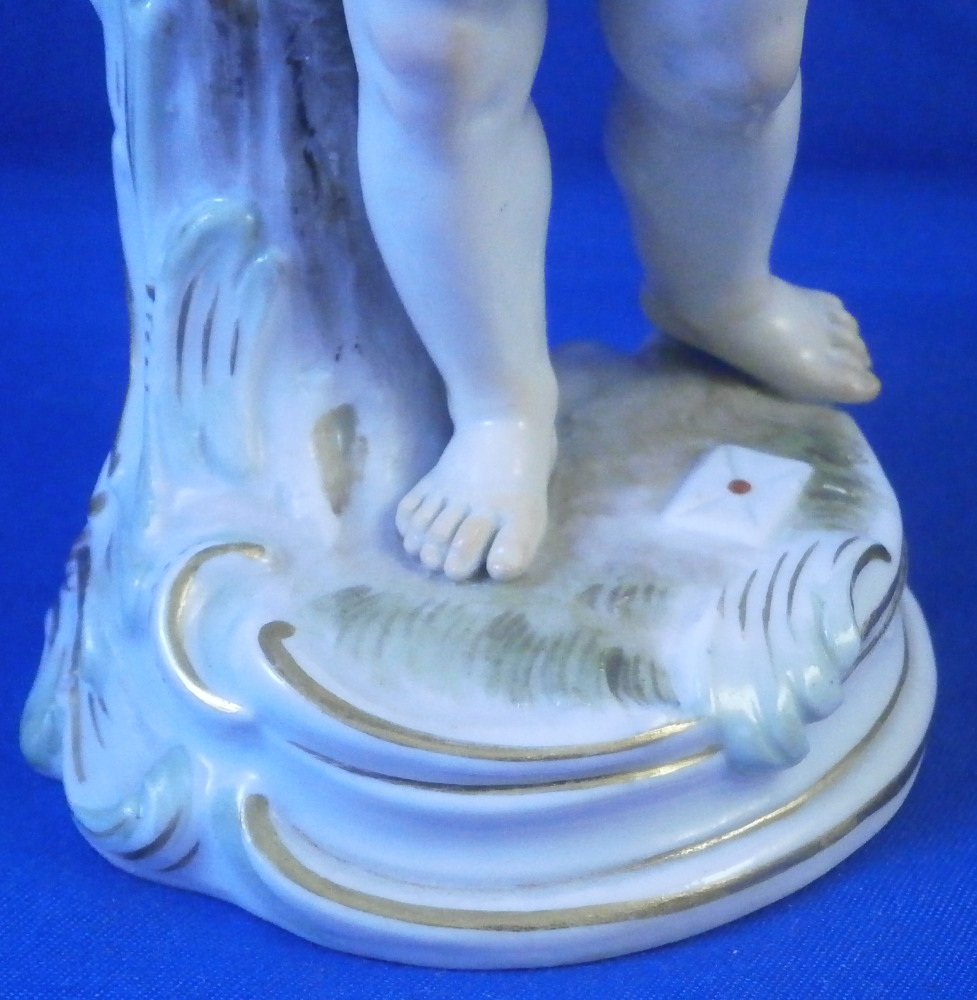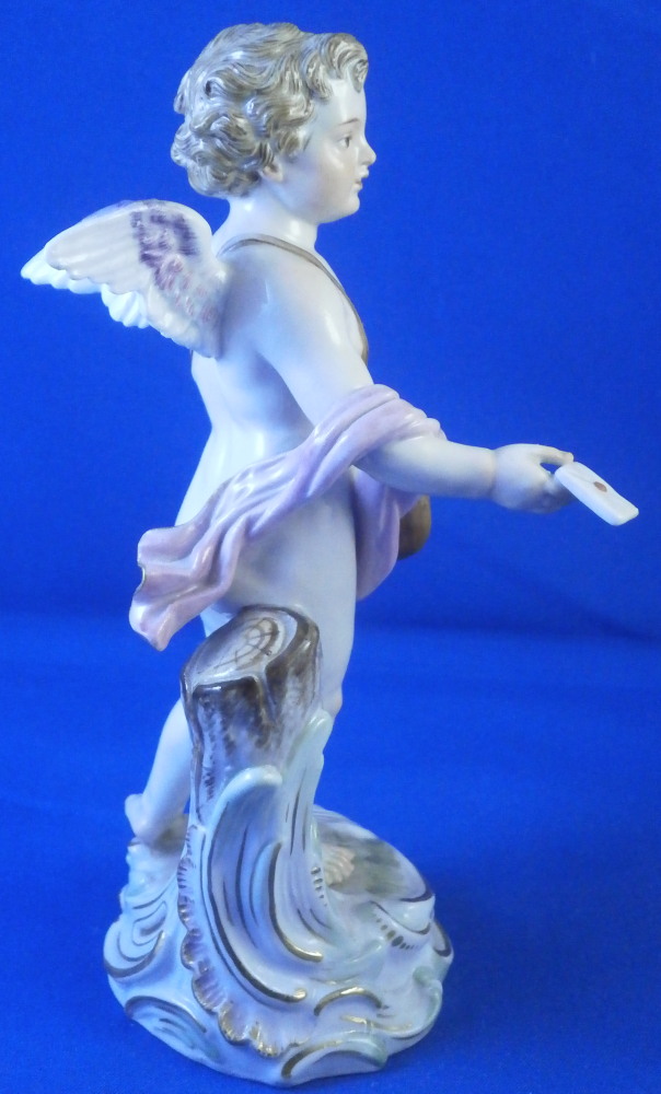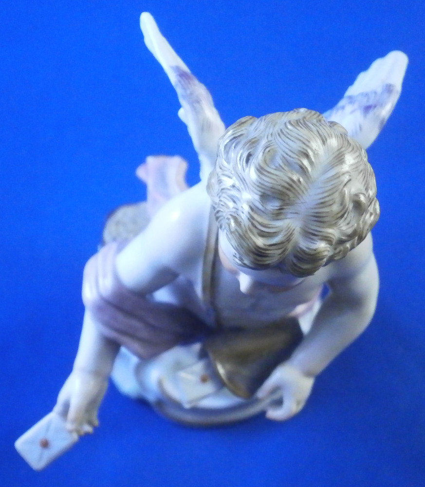 This is a really nice figurine made by Meissen in the late 19th century. It is of a cherub aka Cupid / Amor playing postal service. A nice size figurine that is superbly modeled with lots of details and hand painted to perfection. His wings in the back, a little bag in front with two letters sticking out and another letter in his hand. He is presumably delivering his love letters :) in Nice base with some gilt scrolls to it, a tree stump in the back and another letter on top. Pink cloth around his mid section. The figure is in great condition and displays perfectly but there is a small chip to one of the wing tips as shown. The underside base has the under glaze blue crossed swords mark to it as well as a painter's mark and the usual impressed and incised numbers as shown. The figure is 5.75 inches tall, 2.5 inches wide and 2.875 inches deep. Please email me for more information or other pictures.