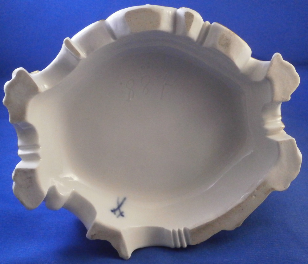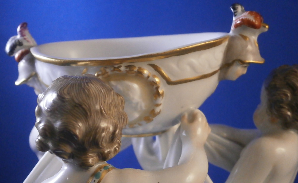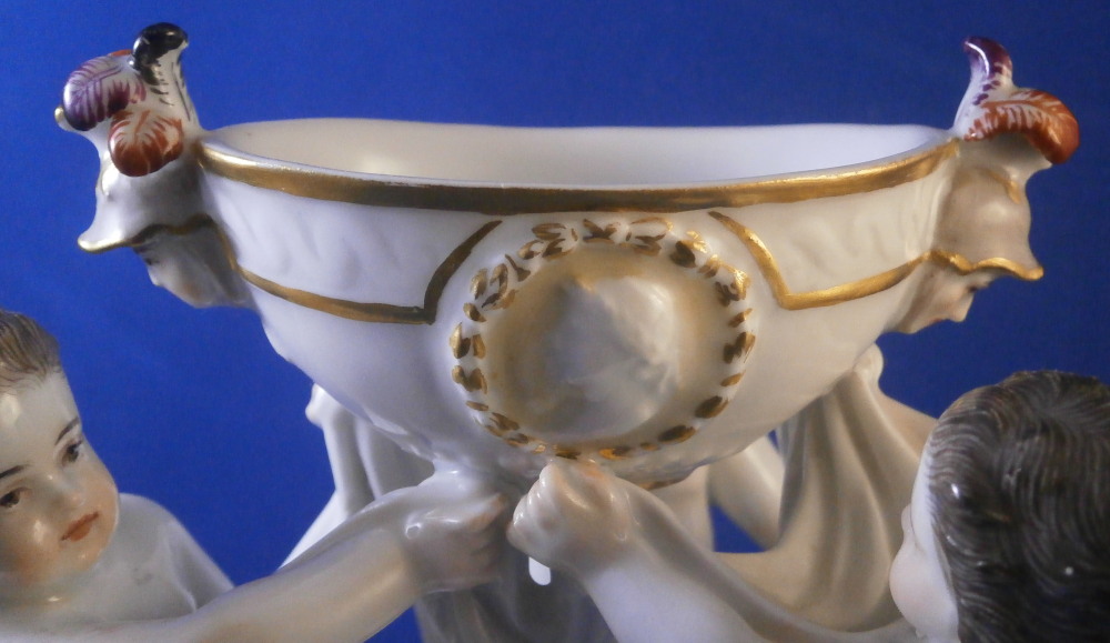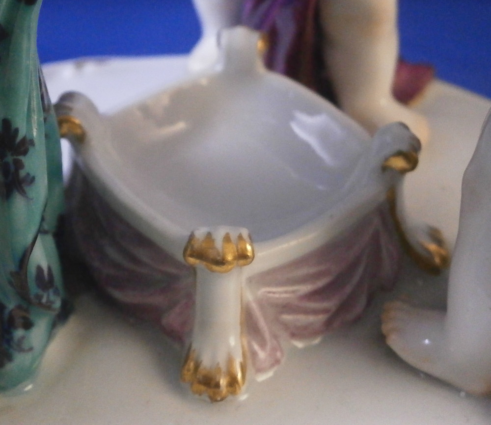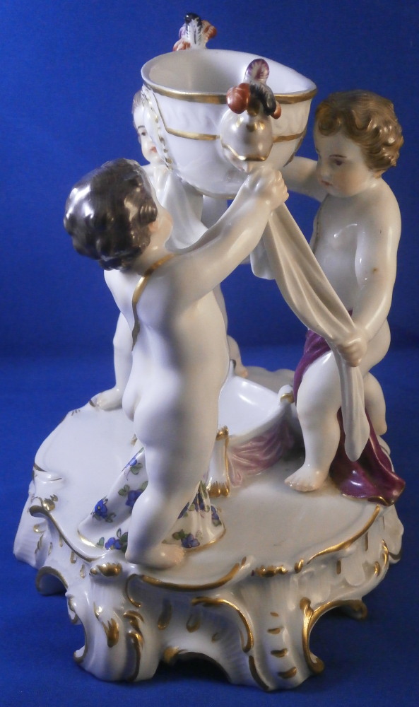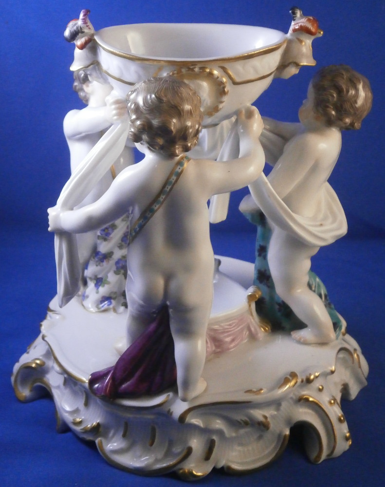 This is an unsual figurine made by Meissen in the late 19th to early 20th century. I think it was meant to be an essential oil diffuser with the bowl in the center of the base meant to hold a candle and the oval bowl up top holding the oil. Not a model I ahve ever come across before so I am not entirely sure. Either way it is a nicely modeled figure of three putti standing on a fancy base holding up the bowl in the center. The bowl has figural heads as handles. These are wearing little helmets with three feathers on top. Each putto has a different color cloth between their legsand they are holding a white cloth in their hands that goes from one putto to the next. The base has some superb scrolls all around the edge with gold highlights to them. A really nice figurine and I might even try to use it one of these days after my kids cook some smelly food :) The piece is 6.375 inches tall, 6 inches wide and 5 inches deep. It is in perfect condition but there are two or three small black firing spots - one in the white cloth and one on the one putto's arm I found and there is probably another one hiding somewhere. Normal to larger pieces of this period and does not take away from the piece! The figurine is marked underneath with the under glaze blue crossed swords mark (first choice) as shown as well as the usual impressed and incised marks as shown. Please email me for more information or other pictures.