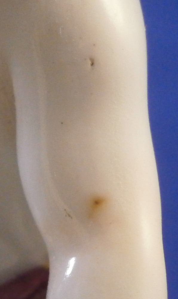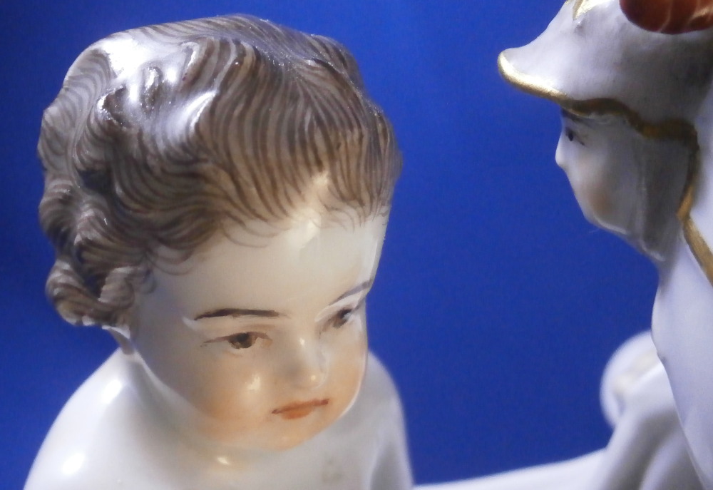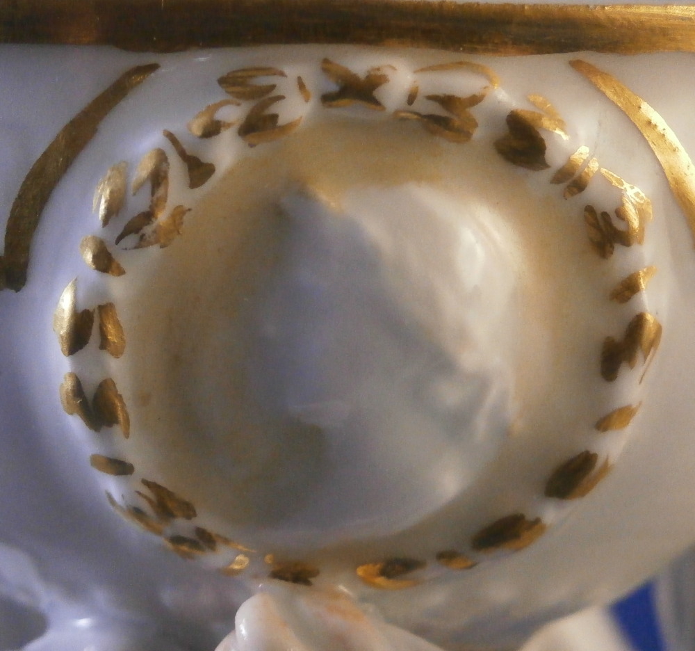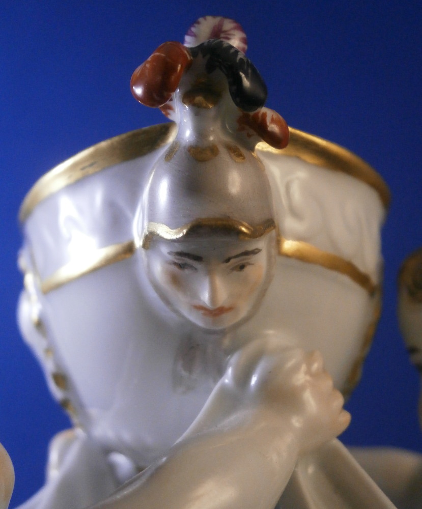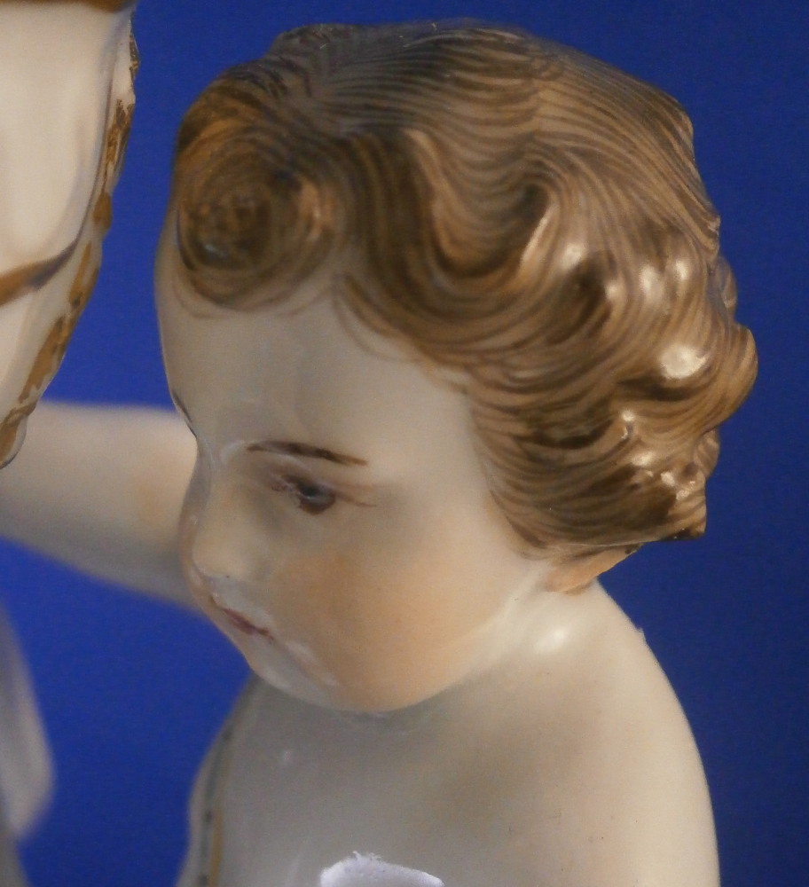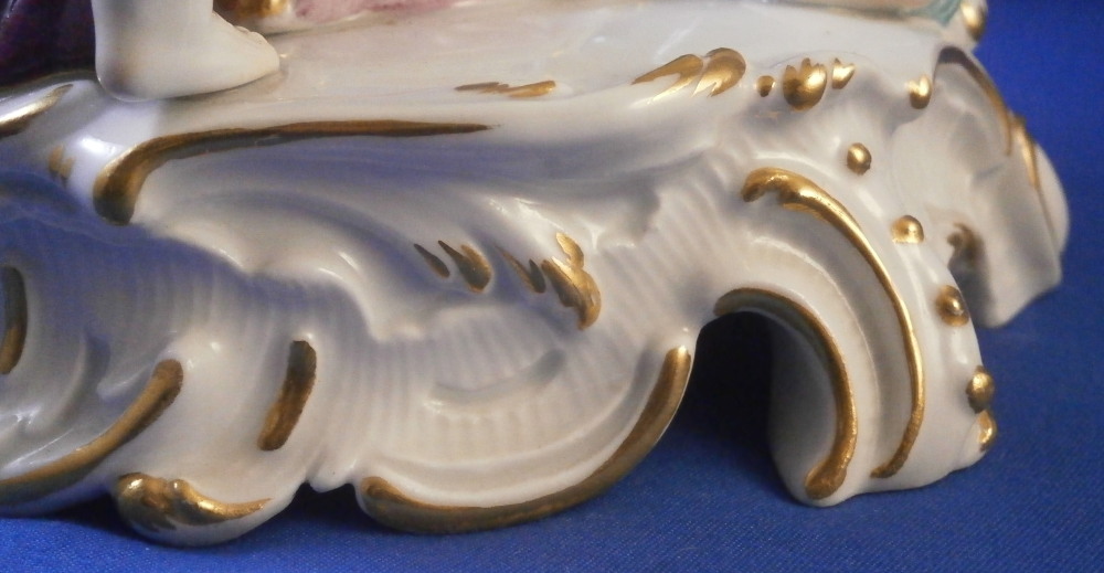 This is an unsual figurine made by Meissen in the late 19th to early 20th century. I think it was meant to be an essential oil diffuser with the bowl in the center of the base meant to hold a candle and the oval bowl up top holding the oil. Not a model I ahve ever come across before so I am not entirely sure. Either way it is a nicely modeled figure of three putti standing on a fancy base holding up the bowl in the center. The bowl has figural heads as handles. These are wearing little helmets with three feathers on top. Each putto has a different color cloth between their legsand they are holding a white cloth in their hands that goes from one putto to the next. The base has some superb scrolls all around the edge with gold highlights to them. A really nice figurine and I might even try to use it one of these days after my kids cook some smelly food :) The piece is 6.375 inches tall, 6 inches wide and 5 inches deep. It is in perfect condition but there are two or three small black firing spots - one in the white cloth and one on the one putto's arm I found and there is probably another one hiding somewhere. Normal to larger pieces of this period and does not take away from the piece! The figurine is marked underneath with the under glaze blue crossed swords mark (first choice) as shown as well as the usual impressed and incised marks as shown. Please email me for more information or other pictures.