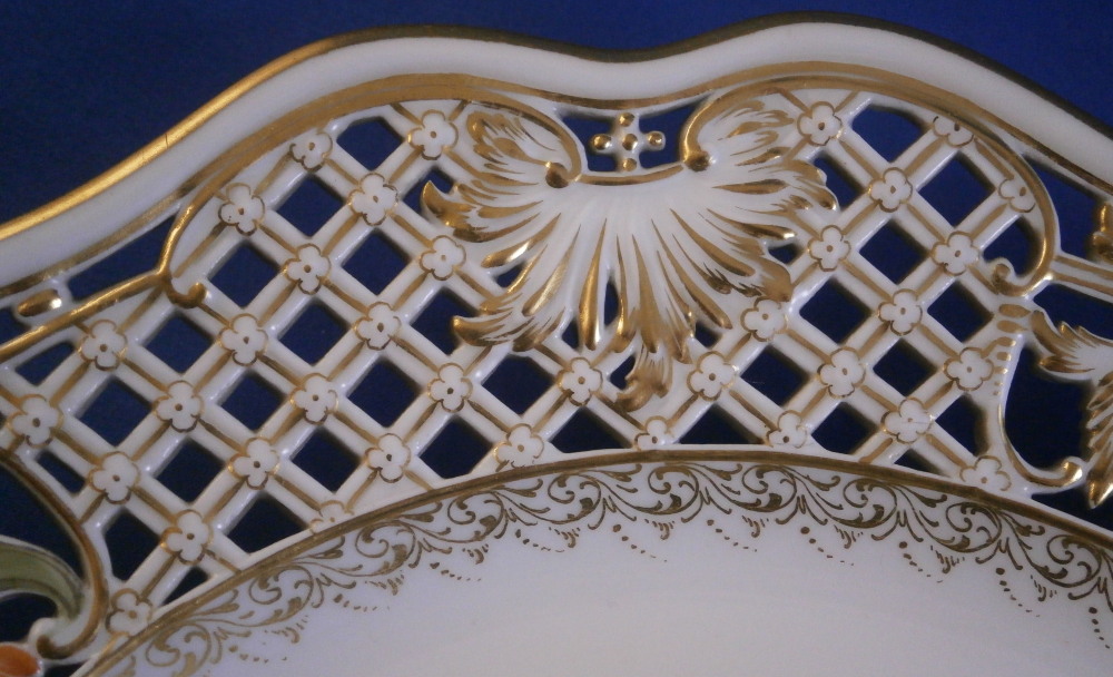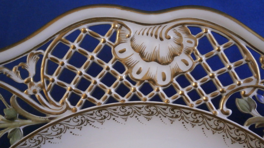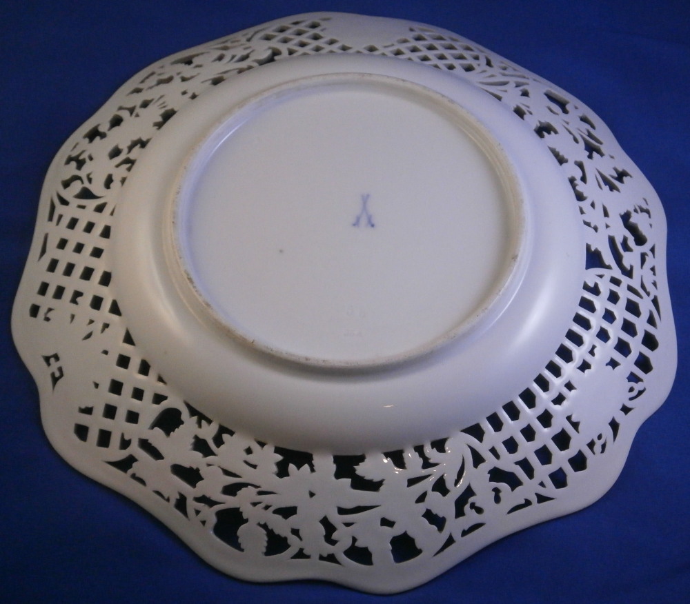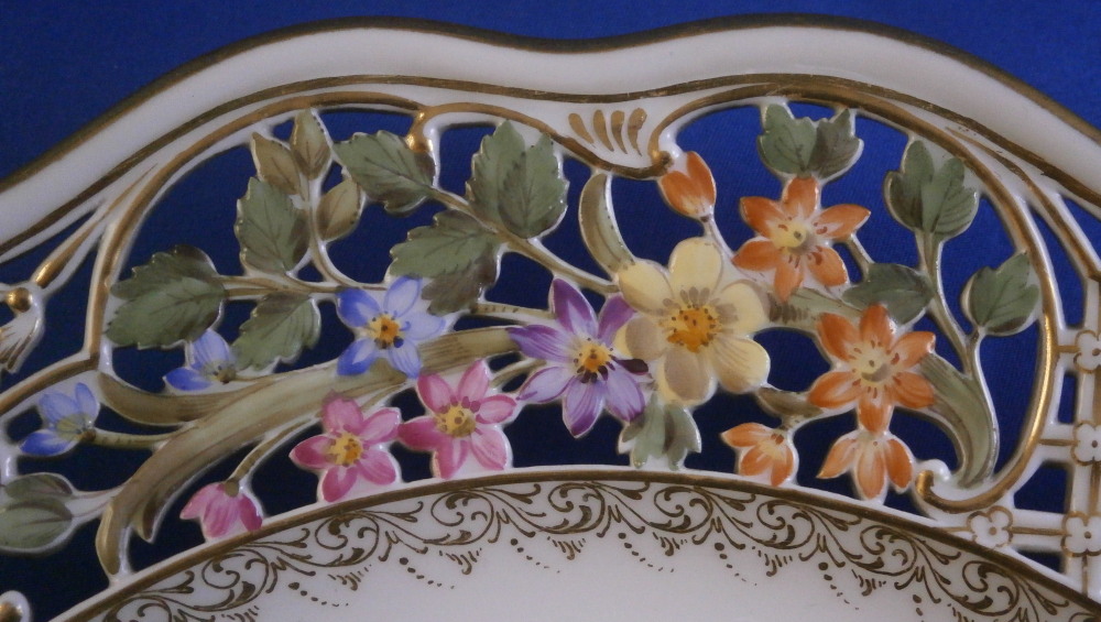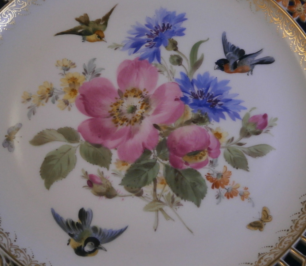 This is a superb plate made by Meissen in the later 19th century. It is hand painted with a detailed floral arrangement in the center that fills most of the well and is surrounded by three little yet superb birds as well as two butterflies / bugs and a fancy gold trim around the well edge but the most fun part is the fancy reticulated rim with lots of flowers and gold highlights. This is probably one of the nicest rim designs you can own by Meissen and is called Bruehlsches Allerlei as it was originally made for Count von Bruehl. The plate is in perfect condition which is astounding given the fragile nature and design. It is marked with the under glaze blue crossed swords mark (first choice) underneath as well as the usual impressed marks one finds on Meissen of this period. The plate is 1.5 inches tall and 10.25 inches in diameter so the larger version of this style. It looks amazing when on display! Please email me for more information or other pictures.