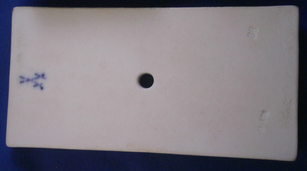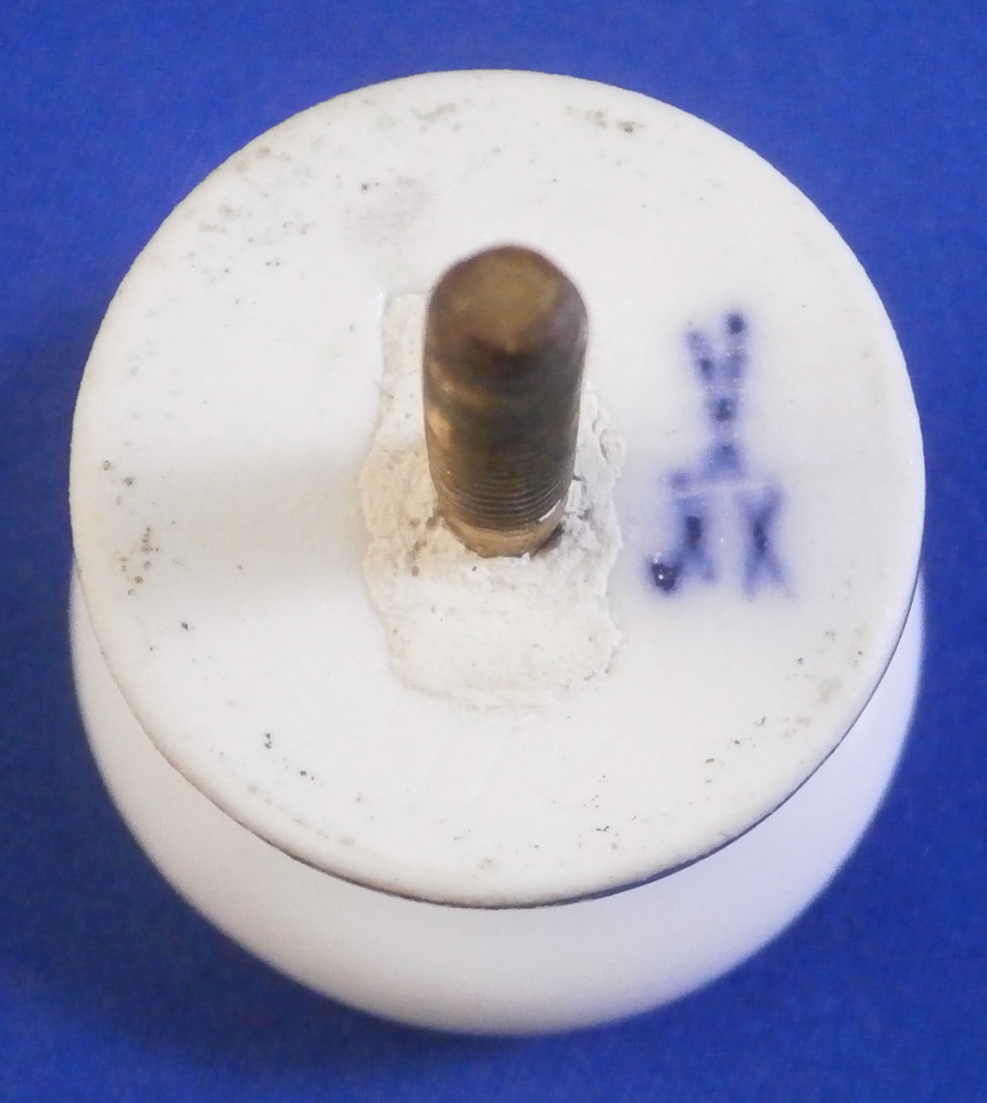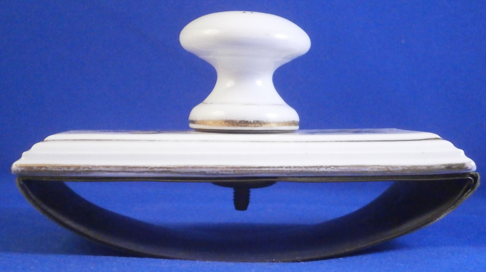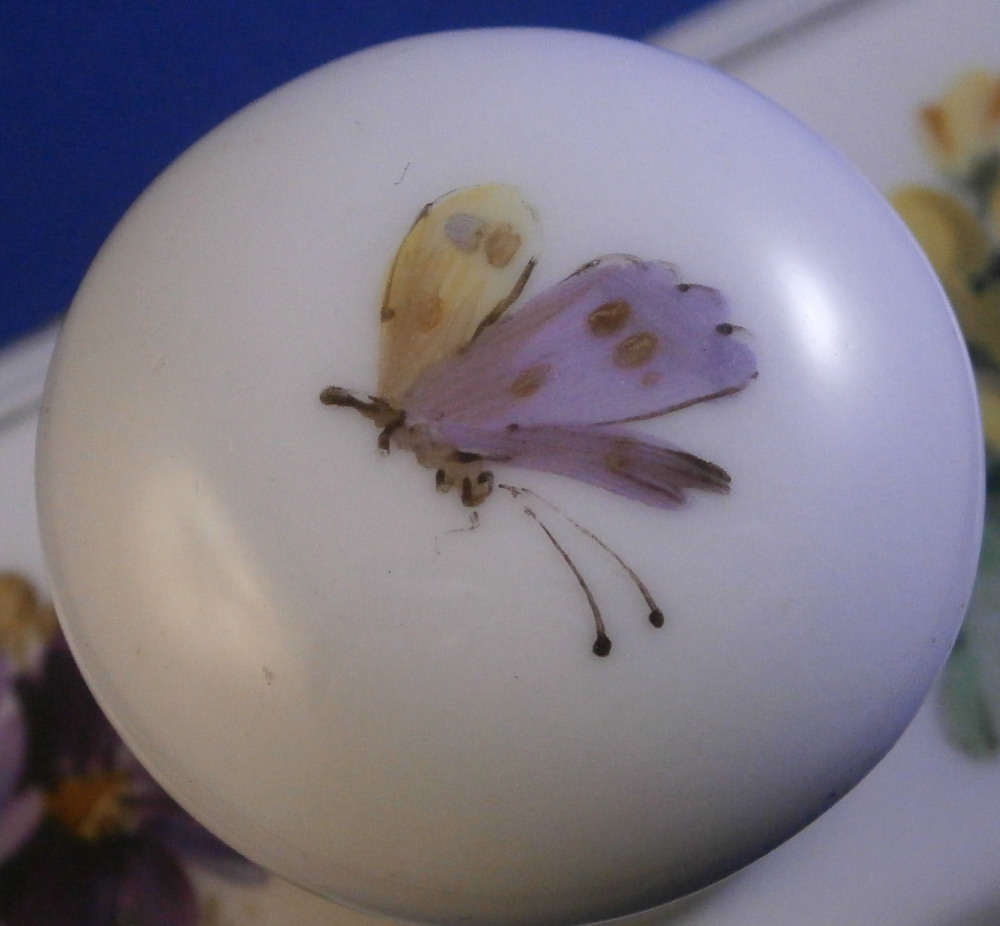 This is a nice blotter made by Meissen in the late 19th or early 20th century. A nicely done example with the knob part having a hand painted butterfly / bug on it and the plate two nice hand painted flowers to it. A purple one to one side and a yellow one to the other. Gold trim to finish off this ncie example! The blotter part is made of metal (probably brass) that is open to the sides. That is covered with a green blotting paper. The blotter comes apart into three pieces plus a metal dish as a spacer as I have shown in the pictures which is normal so you can attach blotter paper to it. The porcelain knob and plate are both marked underneath with the blue swords mark as shown with four cuts across them - made for use by their workers which often decorated them with their specialty so the quality is very good. It was not meant for sale but for use of the workers and to take home and give away as gifts. The entire blotter is 2.375 inches tall, 4.25 inches long and 2.125 inches wide. A really nice and rare piece! It displays nicely but does have wear to the gold trim. It would be a very ahrd to find addition to a desk set or inkwell if you have something with a similar design! Please email me for more information or other pictures.