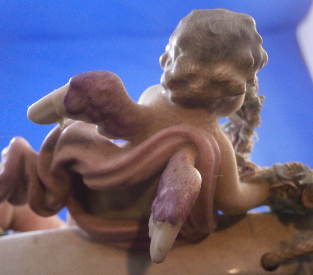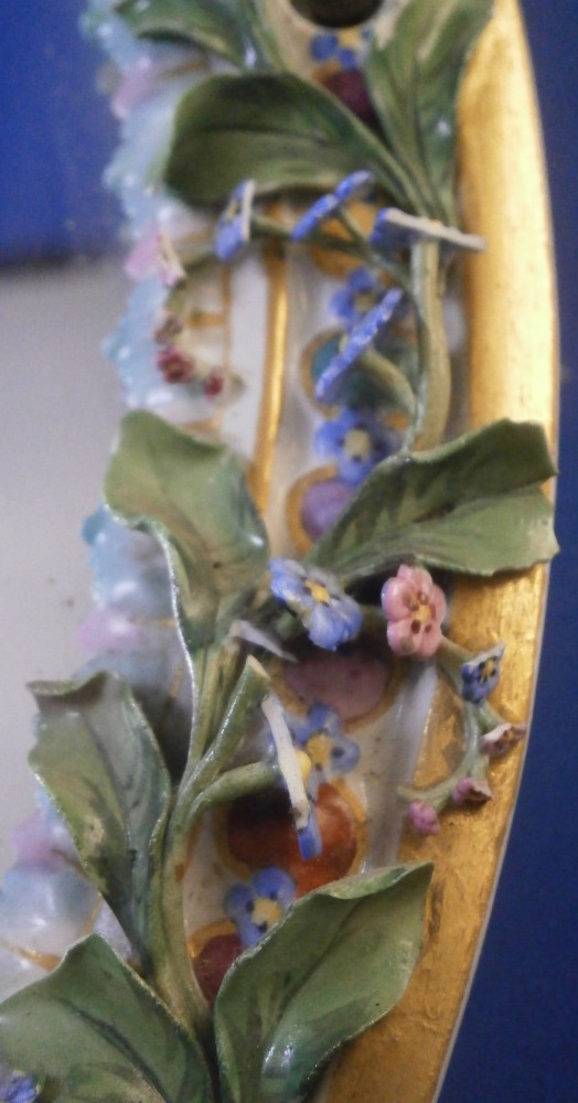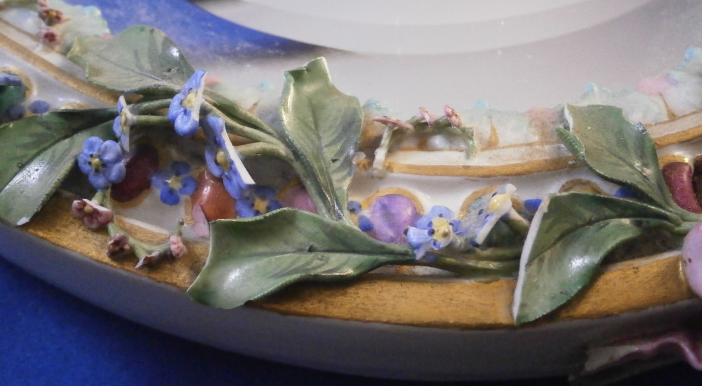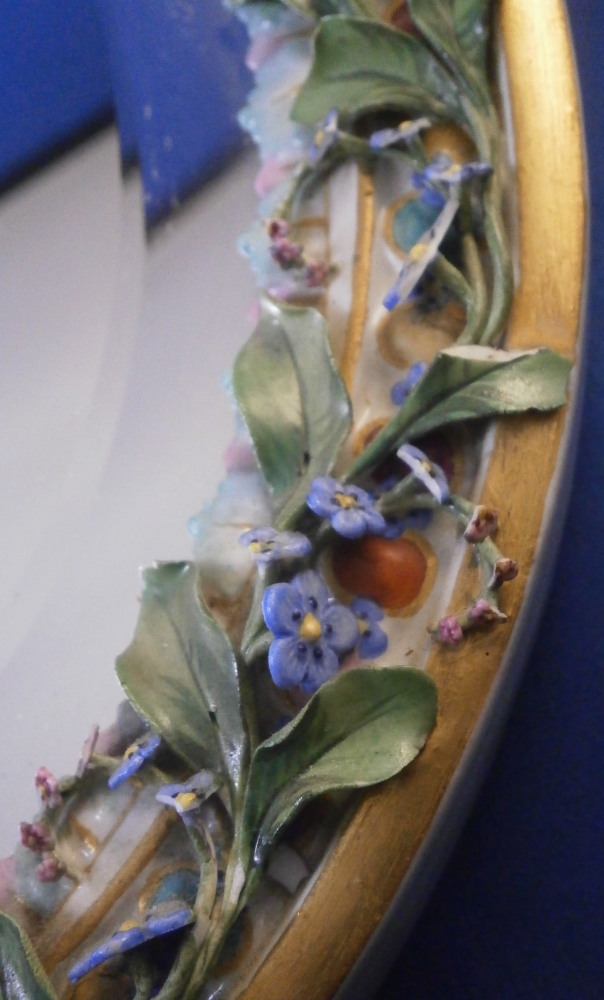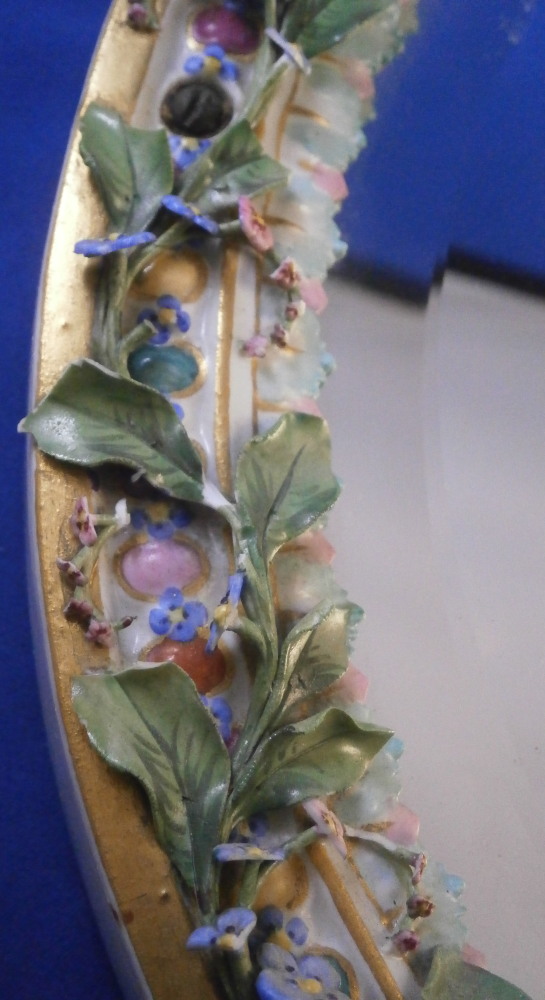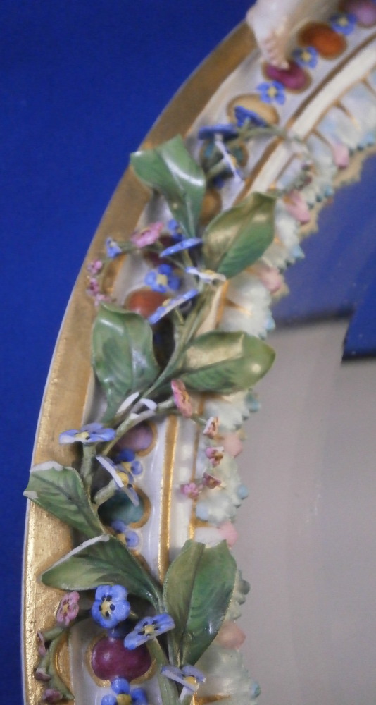 This is a really frame made by Meissen in the mid to late 19th century. This is one of the larger sizes and comes with a mirror but I hae also seen them used for clocks, etc. This is a nice version with the attached forget me not flowers applied to the main frame part. The oval frame part is nicely modeled and hand painted. It has little oval colorful spots to it with tiny forgetmenots in between them, a pink and turquoise pointy trim to the inner edge facing the mirror and some gold trim. The sides and bottom have the applied blossoms and leaves to it and there is a pink bow on the bottom. There are two cherubs sitting on top of the frame that are holding a floral garland between them. One has a pink cloth draped over it and the other a light yellow one. It's a nice piece and in decent condition but has been damaged, one of the wings of the pink cherub is reglued and the other has the tip reglued and the forget me not flowers and leaves have damage thoughout as I am showing in the pictures. The garland has a chip or two but is in nice condition. All in all not terrible and still looks nice on displays. Would be a fun project for a good restorer! The entire piece is about 13 inches tall, 9.75 inches wide and 2.625 inches deep. The visible opening where the mirror is, is about 8.75 inches tall and 7.25 inches wide but there is about a quarter inch of extra room all around in the back for whatever you want to show off. The piece is marked to the top between the cherubs with the under glaze blue crossed swords mark (first choice). The frame has four screw holes (one screw is missing) that attach a wooden backing that is lackered in black. Used to have a kick stand but that is gone. The mirror is in good shape with a couple of smaller scratches to it. Please email me for more information or other pictures.