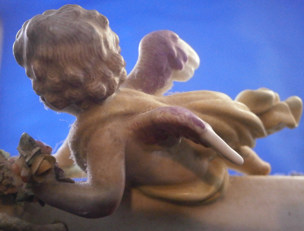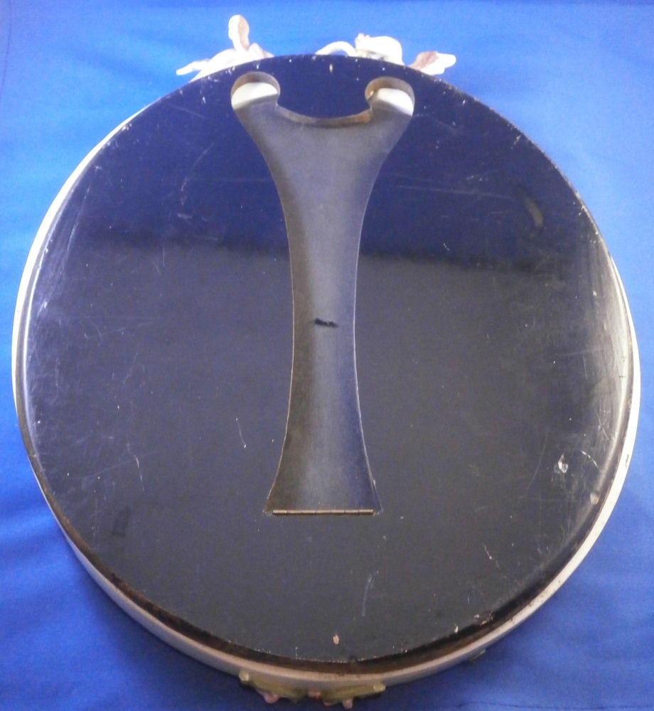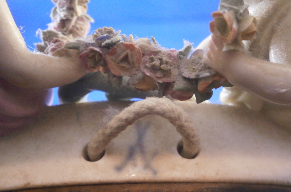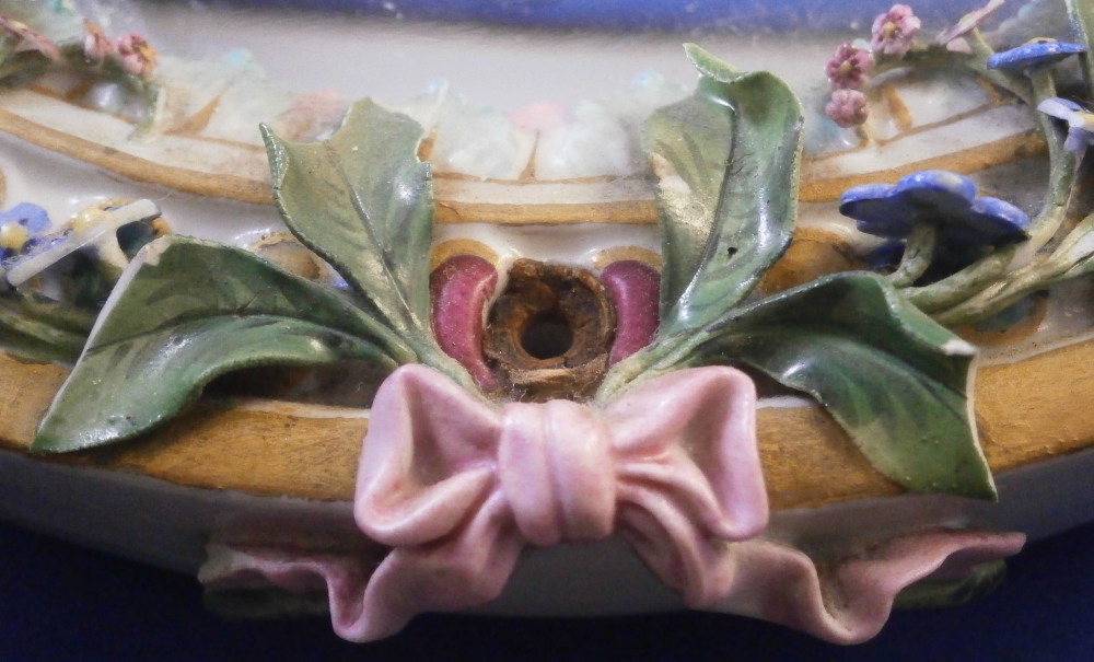 This is a really frame made by Meissen in the mid to late 19th century. This is one of the larger sizes and comes with a mirror but I hae also seen them used for clocks, etc. This is a nice version with the attached forget me not flowers applied to the main frame part. The oval frame part is nicely modeled and hand painted. It has little oval colorful spots to it with tiny forgetmenots in between them, a pink and turquoise pointy trim to the inner edge facing the mirror and some gold trim. The sides and bottom have the applied blossoms and leaves to it and there is a pink bow on the bottom. There are two cherubs sitting on top of the frame that are holding a floral garland between them. One has a pink cloth draped over it and the other a light yellow one. It's a nice piece and in decent condition but has been damaged, one of the wings of the pink cherub is reglued and the other has the tip reglued and the forget me not flowers and leaves have damage thoughout as I am showing in the pictures. The garland has a chip or two but is in nice condition. All in all not terrible and still looks nice on displays. Would be a fun project for a good restorer! The entire piece is about 13 inches tall, 9.75 inches wide and 2.625 inches deep. The visible opening where the mirror is, is about 8.75 inches tall and 7.25 inches wide but there is about a quarter inch of extra room all around in the back for whatever you want to show off. The piece is marked to the top between the cherubs with the under glaze blue crossed swords mark (first choice). The frame has four screw holes (one screw is missing) that attach a wooden backing that is lackered in black. Used to have a kick stand but that is gone. The mirror is in good shape with a couple of smaller scratches to it. Please email me for more information or other pictures.