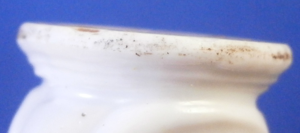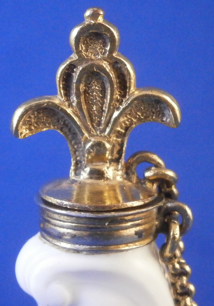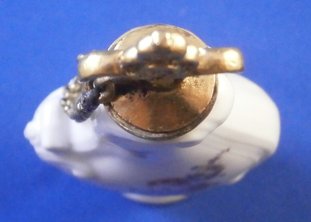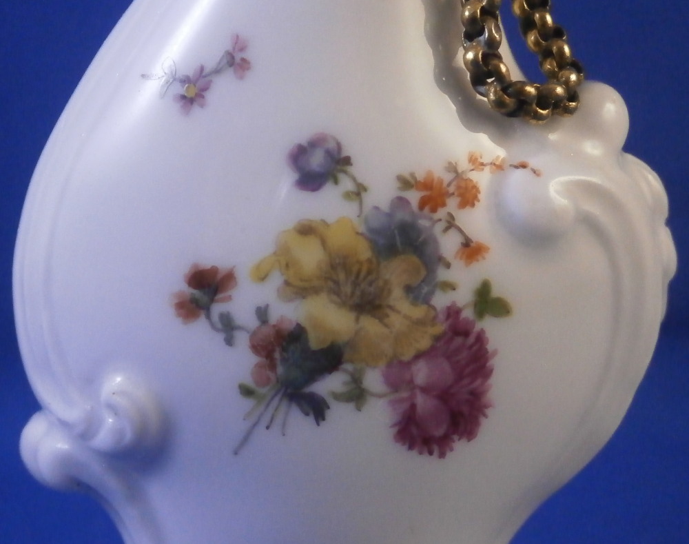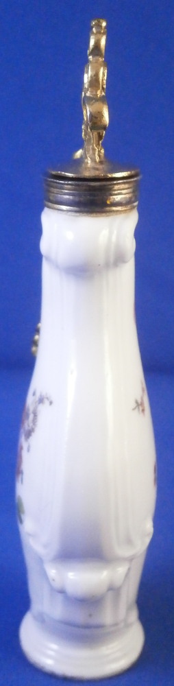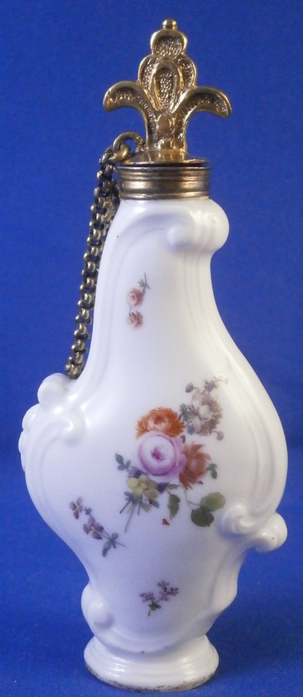 This is a superb perfume / scent bottle made by Meissen in the mid 18th century. It has a nice shape to it with some scrolls in relief and is smaller than most I have seen of this model. The piece is hand painted very nicely with two floral arrangements as well as some single flowers scattered about. It still has its original stopper attached with a chain which is a treat. Not sure what metal this is made of but looks to be gold washed silver. The piece is not marked underneath but the unglazed bottom and the style and color of the flowers makes this easy to identify as Meissen from about 1750. The perfume bottle is 3.75 inches tall to the tip of the stopper, 1.625 inches wide and 0.75 inches deep. The piece is in great condition with some roughness to the bottom edge but it was made that way. Two shallow tiny chips to mostly the underside probably also from when it was made. Some minor wear to the gold wash but it displays perfectly. Please email me for more information or other pictures.