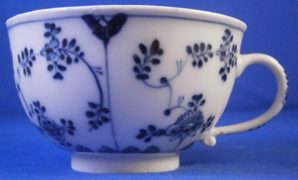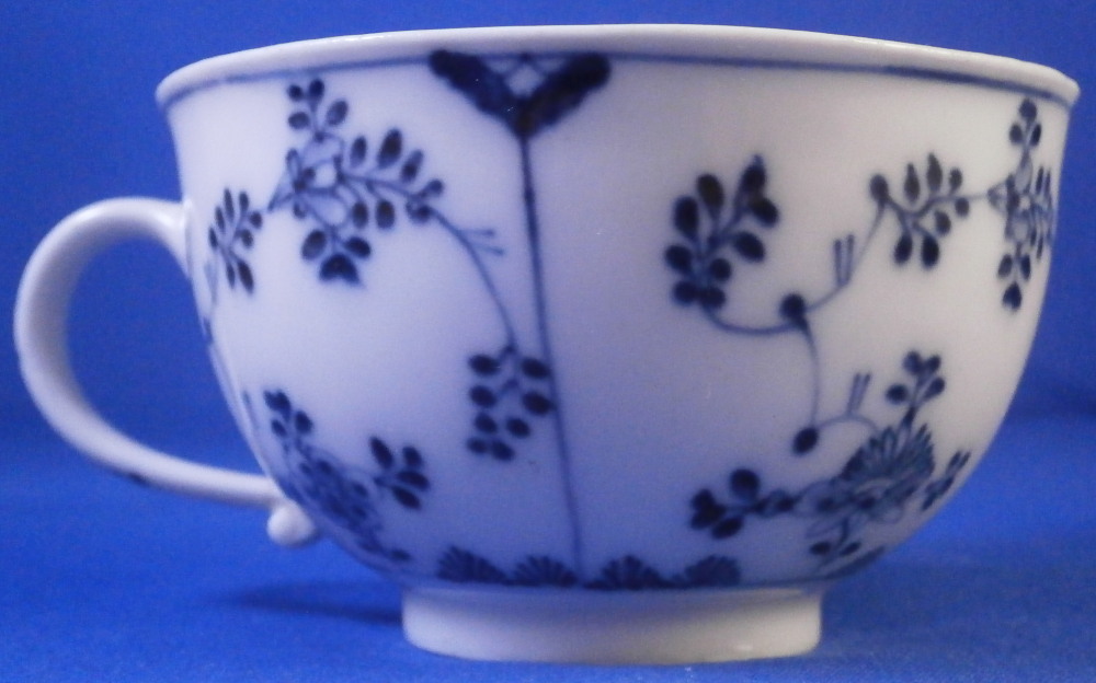 This is a nice early cup and saucer set made by Meissen around 1750. It is quite hard to find one of these early sets these days. Both pieces are hand painted with the well known strawflower design used by so many makers.The design goes all around and there is a bit of a design to the handle as well. The inside of the saucer and inside of the cup have a ribbed design to it to give it a bit of extra texture. A nice touch! The set is in great condition with the bottom terminal of the handle having a crack in it as shown. A very common issue on these early pieces and not a huge deal but... Two brown spots to the bottom inside of the cup and two very tiny fleabits to the outside edge. Impossible to spot when on display and the set displays superbly! The cup is 1.875 inches tall and just over 3 inches in diameter. The saucer is just under 1.25 inch tall and 5.125 inches in diameter. Both are marked underneath with the early under glaze blue crossed swords mark from this period as shown plus some blue painter's marks and impressed number. Please email me for more information or other pictures.