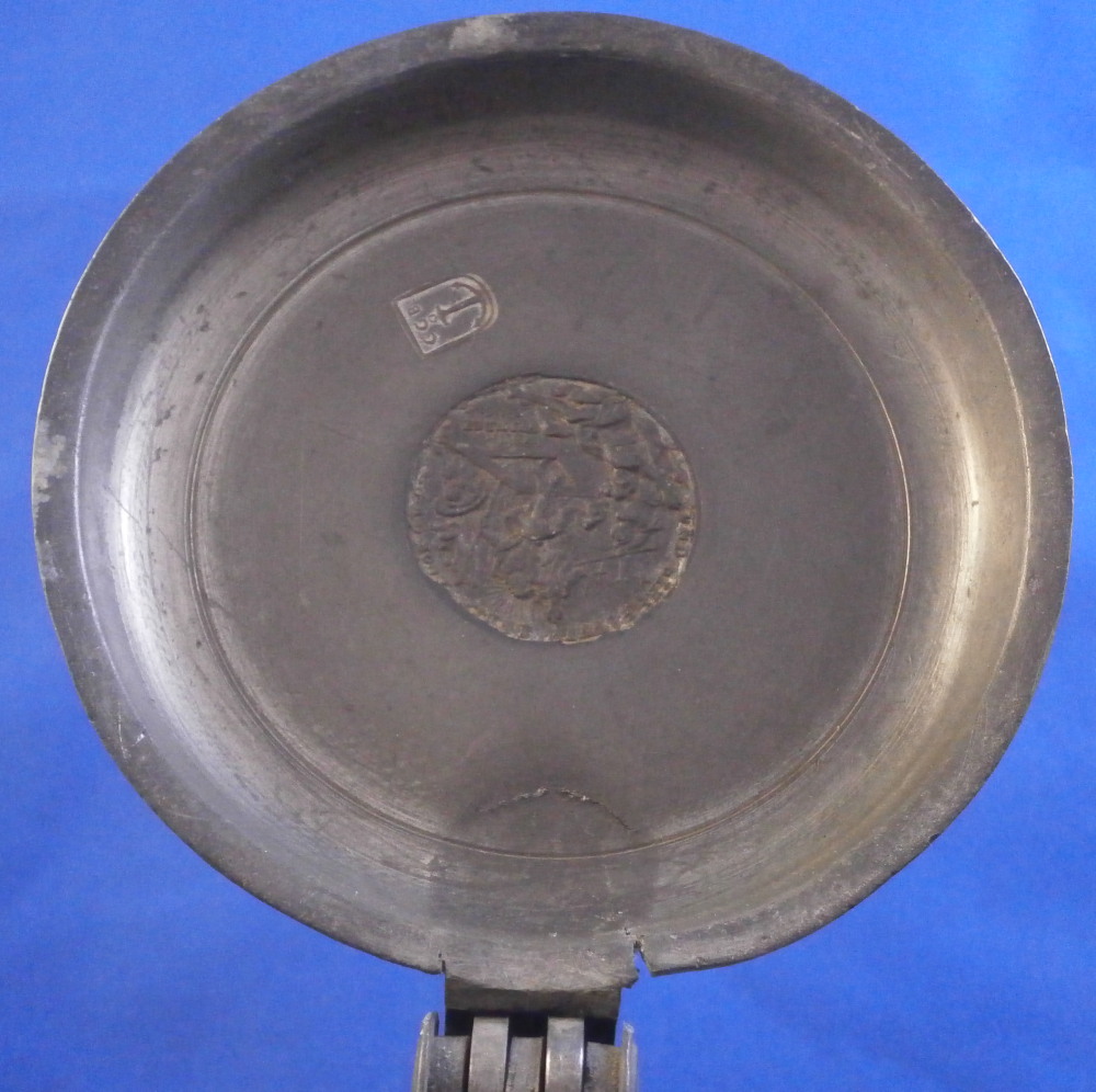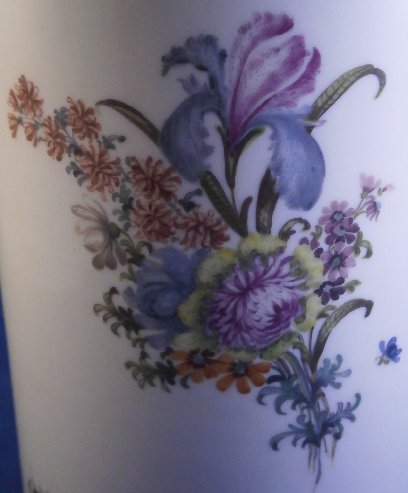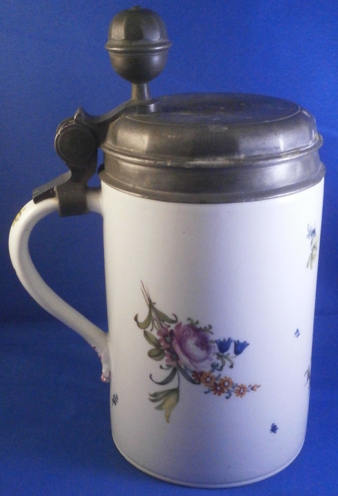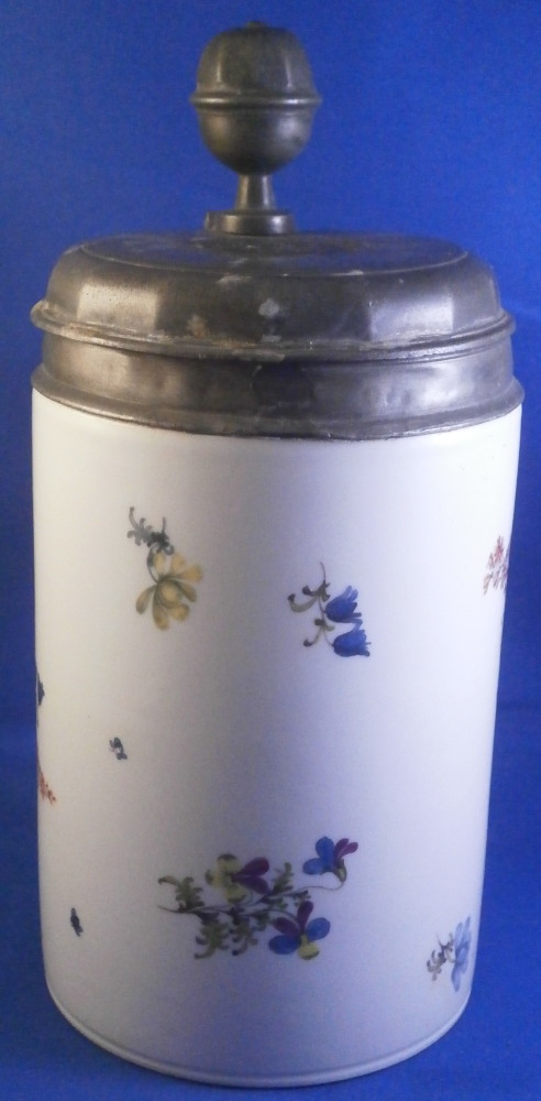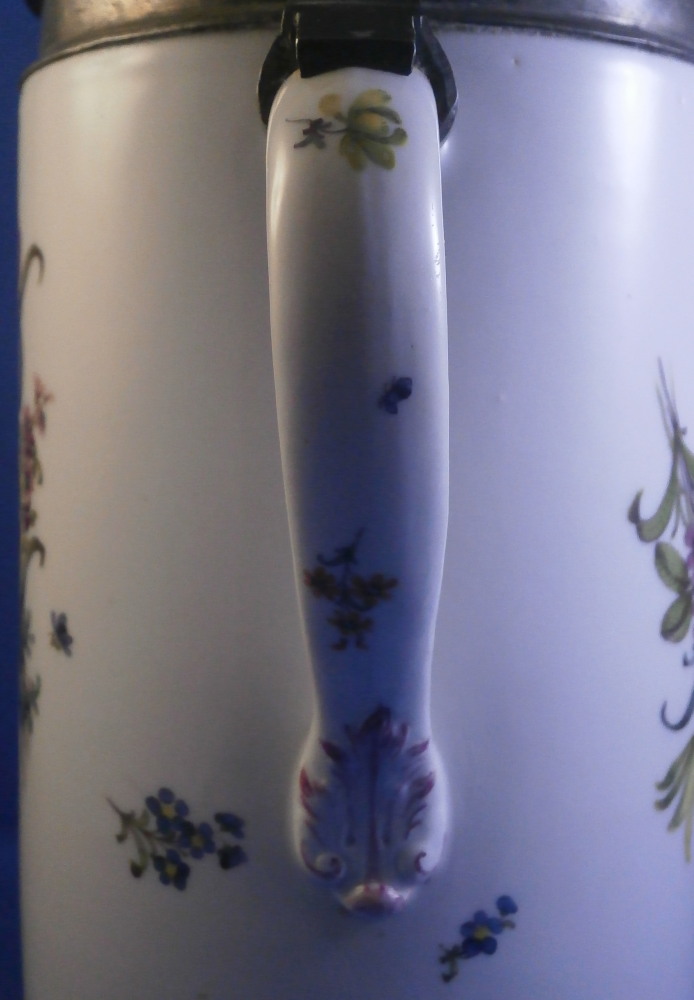 This is a nice early tankard / stein / mug / lidded cup made by Meissen in the mid 18th century. It is hand painted with a superb floral arrangement to the front in the typical early Deutsche Blumen style and colors with my favorite flower being the iris sticking out the top. There is a smaller upside down arrangement on the other side and lots of smaller single flowers and elaves filling in the rest of the space. The handle has two flowers and a leaf or blossom to it with some puce trim to the nice bottom terminal. The piece still has its original zinc mounts which is nice. There is an old coin looking design in the center though I am unsure of it is a coin or just part of the design. On silver example there was often a silver coin so this might just be some sort of imitation of that sort of feature. From underneath it does look like it is a coin or medal. The lid is even marked by a maker's mark underneath the lid though I could not find it anywhere to ID the maker of the zinc. The tankard is in superb condition no chips, wear, etc. One small paint flake to a blosson and the occasional black firing spot normal to early wares. The zink has its issues with some scratches, dents, a crack near the hinge as shown and a possible repair in that area but hey they are over 250 years old and zinc is fairly soft. Just happy it's still there! One part of the hinge is missing a small piece as well. The underside of the porcelain is faintly marked with the blue crossed swords. A bit hard to see but they are there as is an impressed numer 6 or 9 as shown. The entire piece is 8.25 inches tall and 4 inches in diameter. The coin looking piece is of Jesus on the cross and says Als Die Sterbenden (as the dying) and underneath it states Gedult (patience). The underside has Und siehe wir Leben (and see that we are living) as well as ueberwindet (overcomes) on it. Plus 2 Cor. (for Corintians) 6 and 9 I believe. I found a silver medal (which this is not) with the same scenes to it - one being of Jesus' crucifixion and one of his resurrection. A neat piece for sure! Please email me for more information or other pictures.