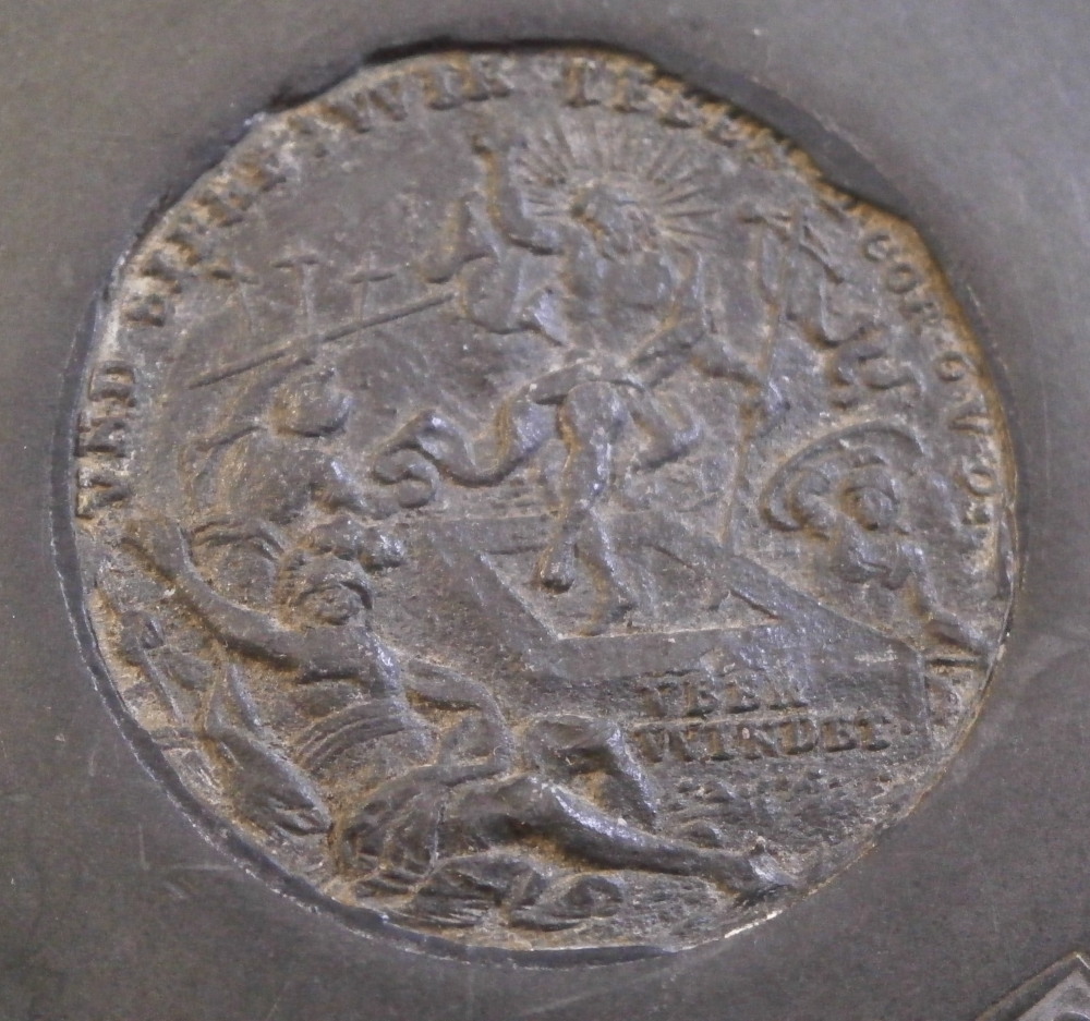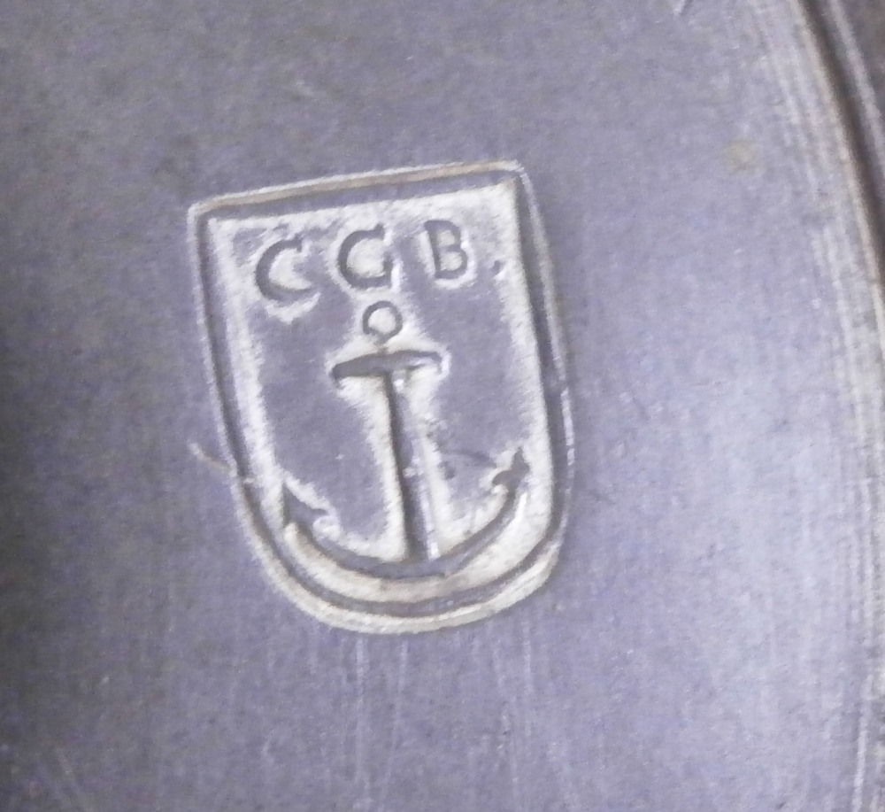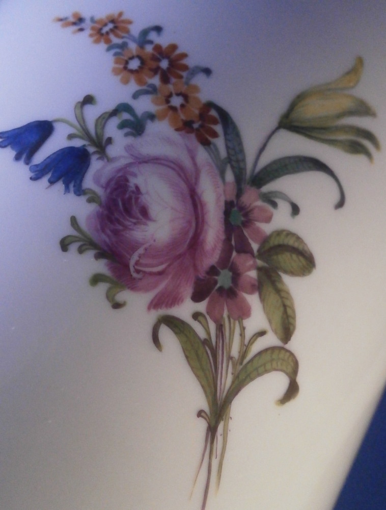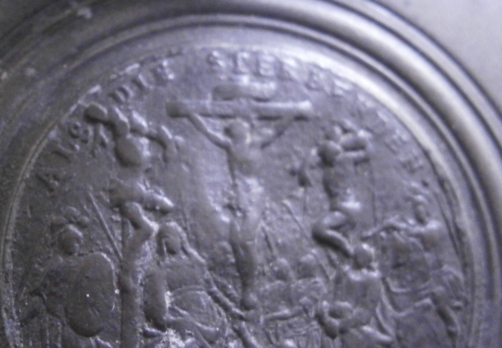This is a nice early tankard / stein / mug / lidded cup made by Meissen in the mid 18th century. It is hand painted with a superb floral arrangement to the front in the typical early Deutsche Blumen style and colors with my favorite flower being the iris sticking out the top. There is a smaller upside down arrangement on the other side and lots of smaller single flowers and elaves filling in the rest of the space. The handle has two flowers and a leaf or blossom to it with some puce trim to the nice bottom terminal. The piece still has its original zinc mounts which is nice. There is an old coin looking design in the center though I am unsure of it is a coin or just part of the design. On silver example there was often a silver coin so this might just be some sort of imitation of that sort of feature. From underneath it does look like it is a coin or medal. The lid is even marked by a maker's mark underneath the lid though I could not find it anywhere to ID the maker of the zinc. The tankard is in superb condition no chips, wear, etc. One small paint flake to a blosson and the occasional black firing spot normal to early wares. The zink has its issues with some scratches, dents, a crack near the hinge as shown and a possible repair in that area but hey they are over 250 years old and zinc is fairly soft. Just happy it's still there! One part of the hinge is missing a small piece as well. The underside of the porcelain is faintly marked with the blue crossed swords. A bit hard to see but they are there as is an impressed numer 6 or 9 as shown. The entire piece is 8.25 inches tall and 4 inches in diameter. The coin looking piece is of Jesus on the cross and says Als Die Sterbenden (as the dying) and underneath it states Gedult (patience). The underside has Und siehe wir Leben (and see that we are living) as well as ueberwindet (overcomes) on it. Plus 2 Cor. (for Corintians) 6 and 9 I believe. I found a silver medal (which this is not) with the same scenes to it - one being of Jesus' crucifixion and one of his resurrection. A neat piece for sure! Please email me for more information or other pictures.