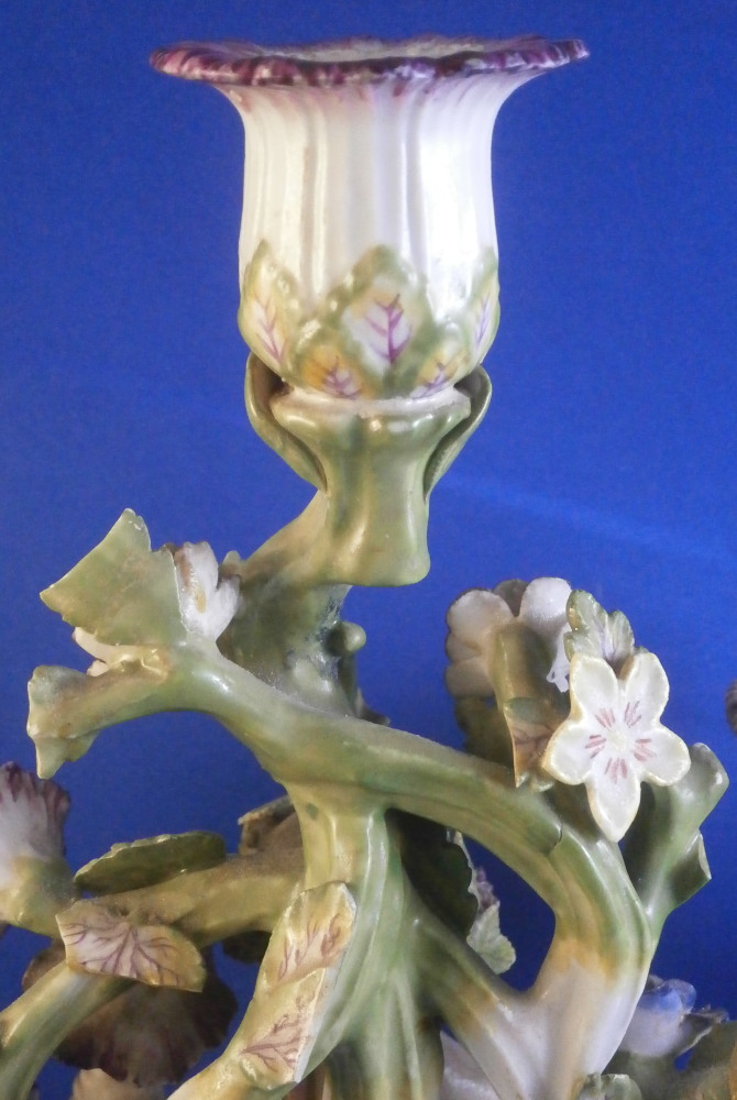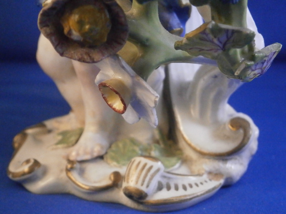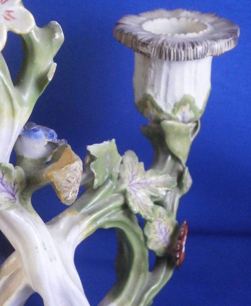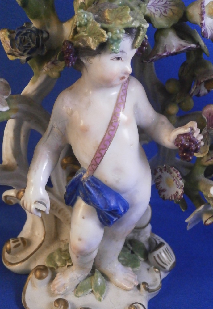 This is a neat triple figural candleholder made by Meissen in about 1750. Before you get too excited - it has been heavily restored. Still worth saving and maybe even having restored a bit better. The piece has a central figurine of a putto holding a bunch of grapes in his left hand and what probably was a knife in the other though the blade is missing. His right arm was broken off and restored and h was broken off the base as well and restored. The candle holder part is made up of a couple of intertwined branches that end in two lower candle holders and one up high. Lots of flowers and some leaves to the branches. The top candle holder cup is in good shape but looks to have been broken off the branch though I am not sure. The other two candle holder cups are but heavily restored / possibly replaced with replicas. The branches in the back are oddly enough in great shape though one has a hairline to one spot. There is dmage to the laves and some minor damage to the flowers though most are in top shape. The base has been heavily over painted and I have no idea what was done to it. The underside looks fine except for a large firing crack and clear coated over but does not appear to have replaced pieces. One flowers looks to be a replacement as well. The scrolls on top are probably additions. Not sure. All in all it sounds much worse than it looks and it is a rare survivor for being 275 years old. The candlestick is 8.875 inches tall, 6.875 inches wide and 3.5 inches deep. The piece is unmarked or at least not visibly marked after the restoration but ceertainly Meissen from the mid 18th century. Please email me for more information or other pictures.
