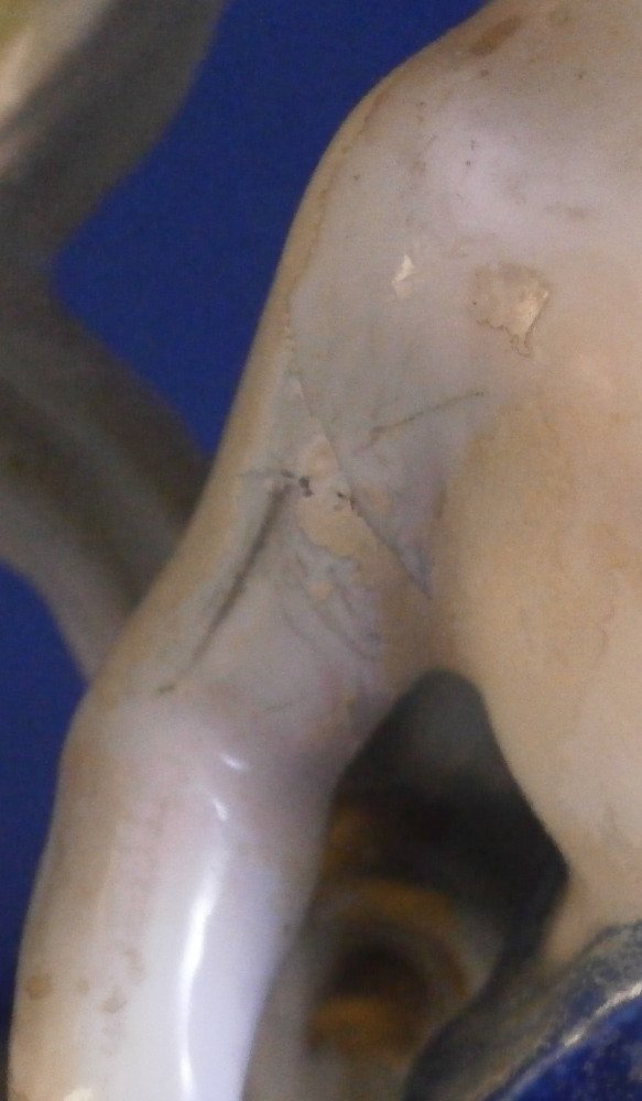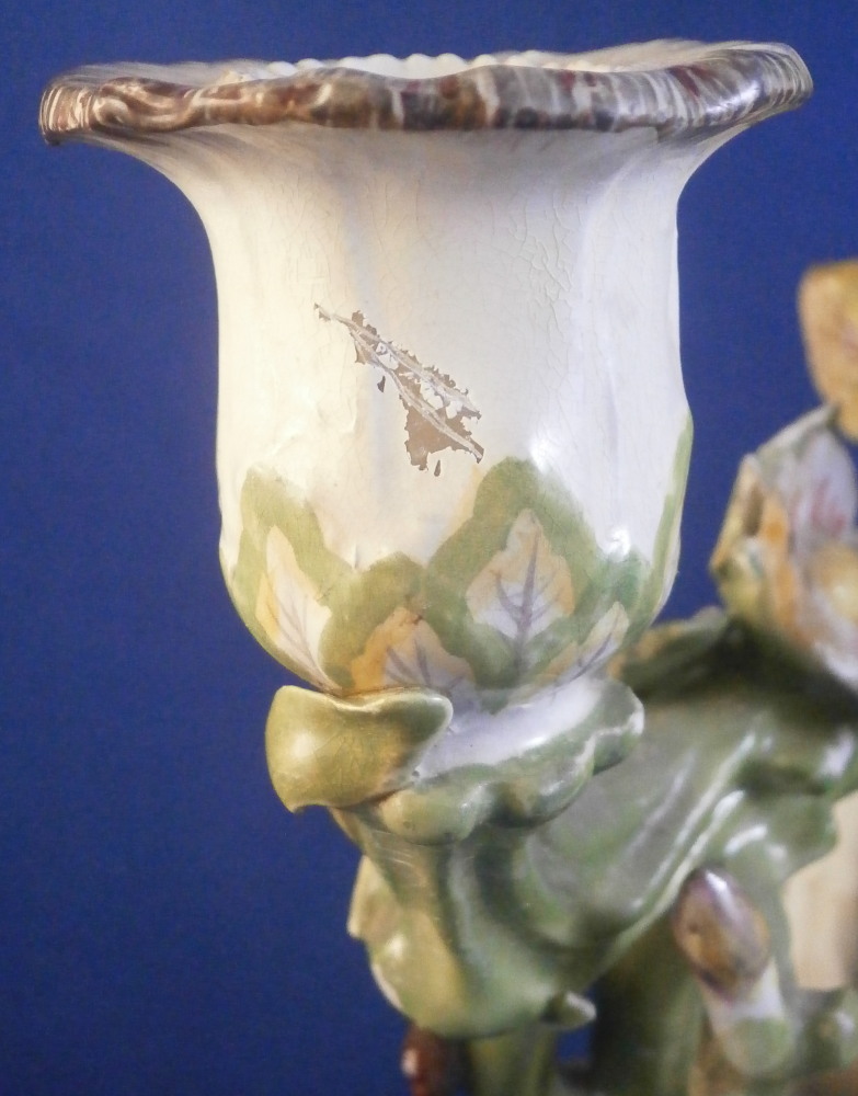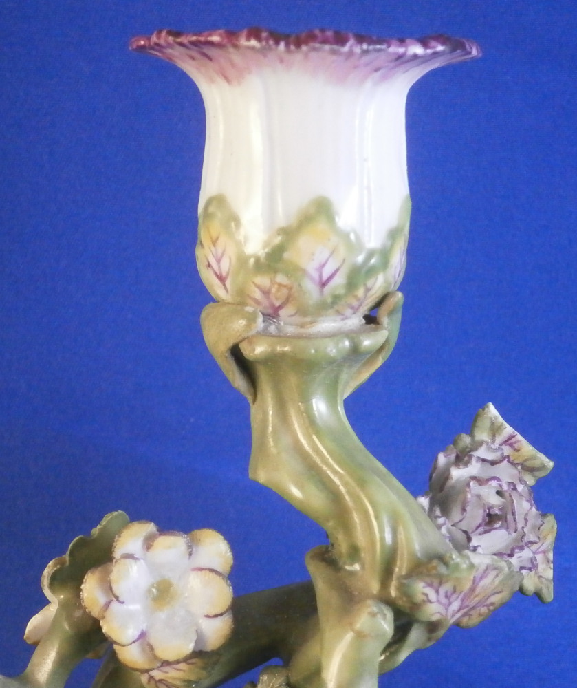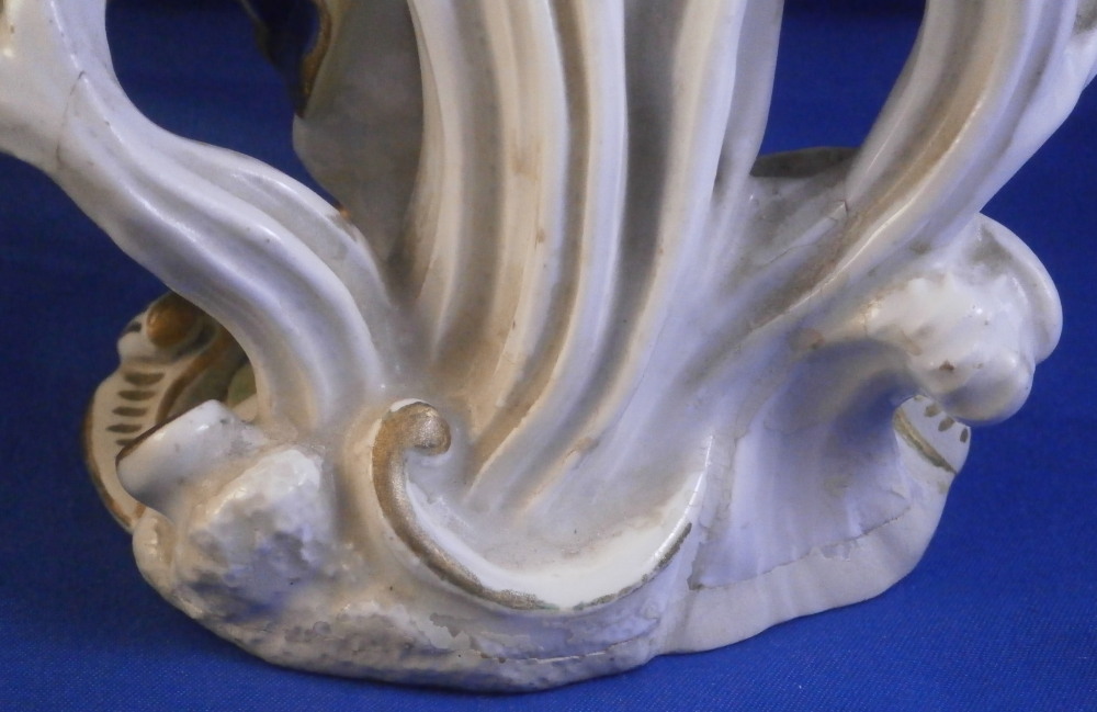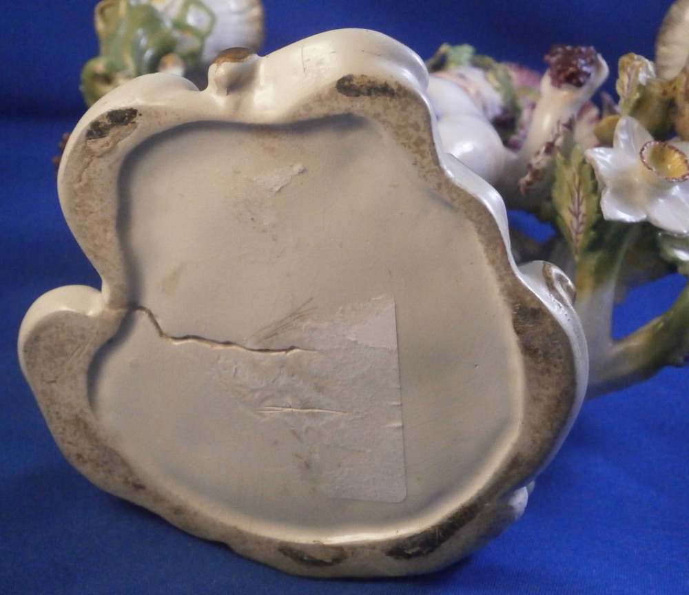 This is a neat triple figural candleholder made by Meissen in about 1750. Before you get too excited - it has been heavily restored. Still worth saving and maybe even having restored a bit better. The piece has a central figurine of a putto holding a bunch of grapes in his left hand and what probably was a knife in the other though the blade is missing. His right arm was broken off and restored and h was broken off the base as well and restored. The candle holder part is made up of a couple of intertwined branches that end in two lower candle holders and one up high. Lots of flowers and some leaves to the branches. The top candle holder cup is in good shape but looks to have been broken off the branch though I am not sure. The other two candle holder cups are but heavily restored / possibly replaced with replicas. The branches in the back are oddly enough in great shape though one has a hairline to one spot. There is dmage to the laves and some minor damage to the flowers though most are in top shape. The base has been heavily over painted and I have no idea what was done to it. The underside looks fine except for a large firing crack and clear coated over but does not appear to have replaced pieces. One flowers looks to be a replacement as well. The scrolls on top are probably additions. Not sure. All in all it sounds much worse than it looks and it is a rare survivor for being 275 years old. The candlestick is 8.875 inches tall, 6.875 inches wide and 3.5 inches deep. The piece is unmarked or at least not visibly marked after the restoration but ceertainly Meissen from the mid 18th century. Please email me for more information or other pictures.