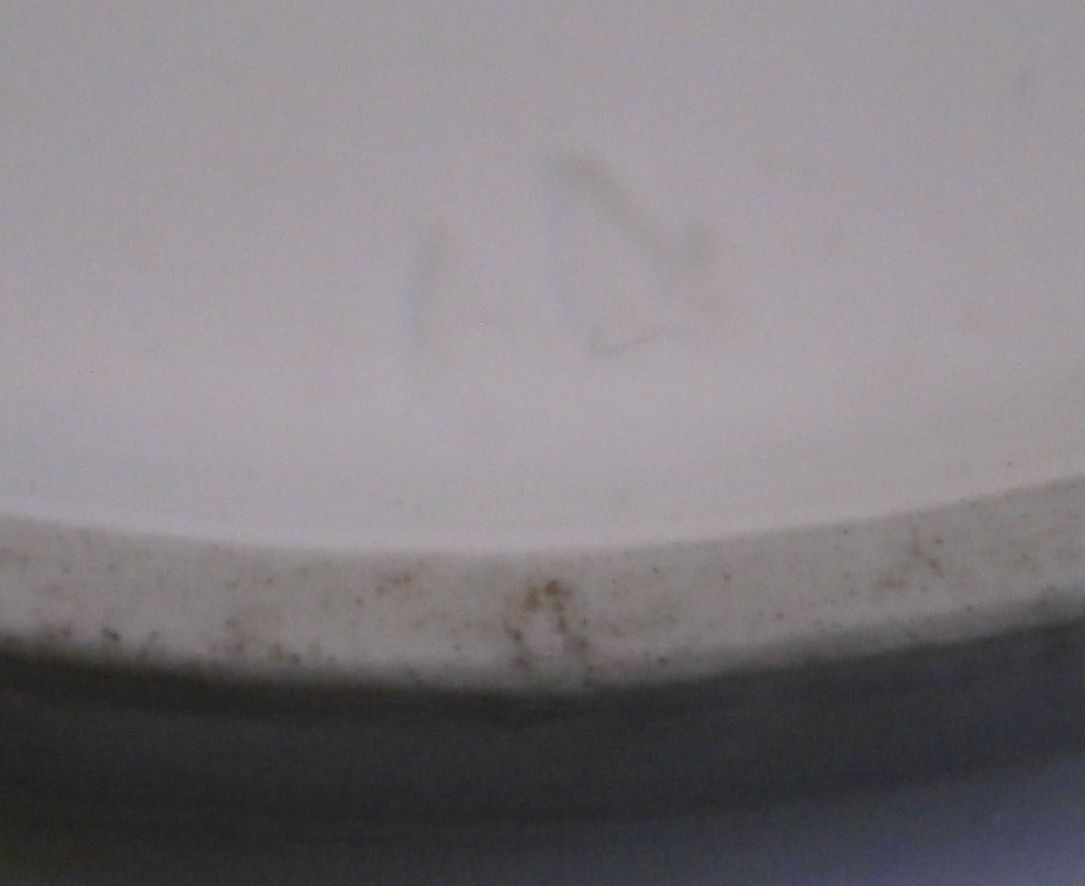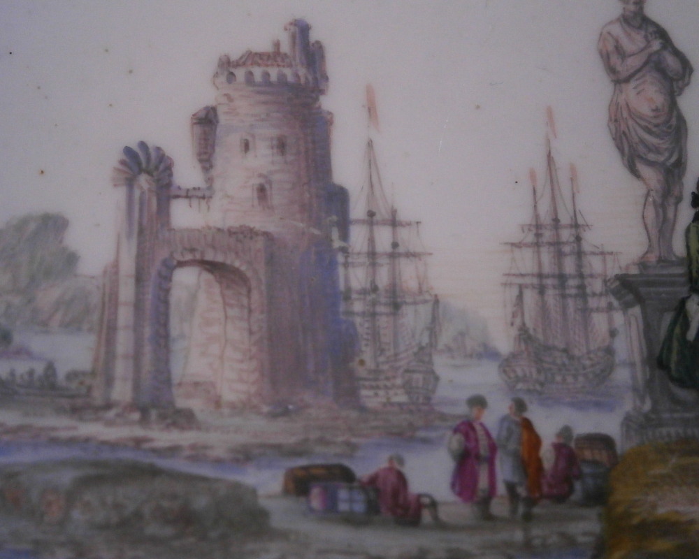 This is a nice saucer made by Meissen in the mid 18th century. A bit rough to call it simple since the scene is superb and amazingly detailed but usually these harbor / merchant type scenes have so much fancy gilding around it that it is refreshing to see just a simple gold trim to the edge. A stunning piece for sure! The scene in the center is quite large with lots of buildings and two large ships as well as a small boat and off course the merchants going about their business and some of their wares. It even has a large statue in the center. Top quality painting and more detail than many! The piece is in superb condition with just a minor touch of wear only visible under magnification. Mainly to the head of the one merchant. The dish is 1.125 inches tall and has a diameter of 5.25 inches. The saucer is marked underneath with the under glaze blue crossed swords mark as well as an impressed number as shown. Please email me for more information or other pictures.