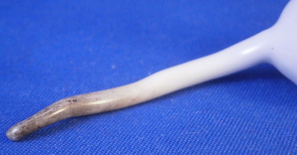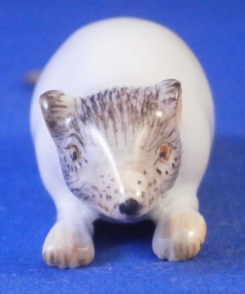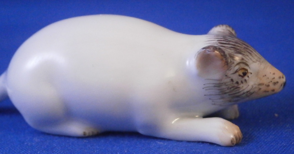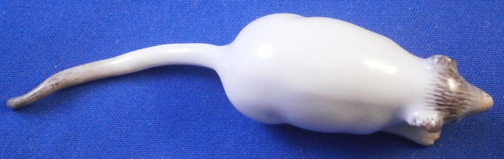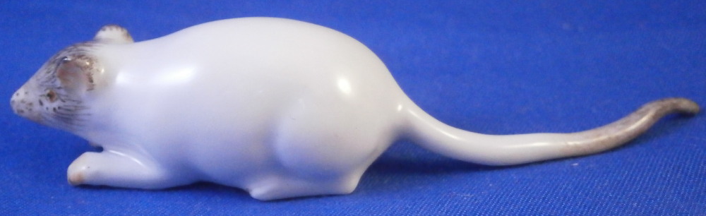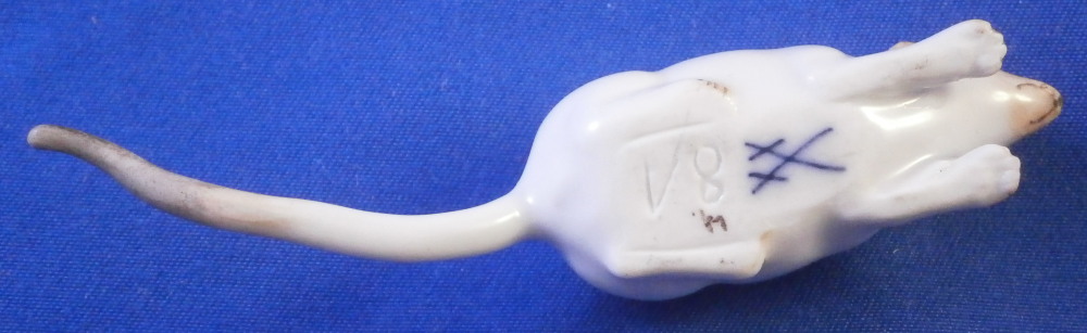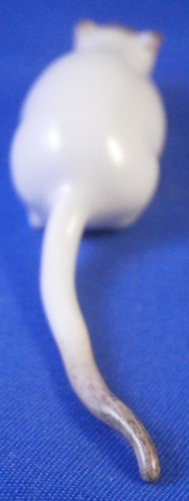 This is a super cute small mouse or rat figurine made by Meissen in the 20th century. It is one of the cutest miniatures they made in my opinion. Not easy to find since the tail is almost always broken due to obvious reasons! Nicely modeled and painted as one would expect from the top maker. The figurine is in perfect condition which is amazing given this skinny and long fragile tail! It is marked underneath with the under glaze blue crossed swords mark as well as an incised number and a painter's mark as shown. The figure is 0.625 inches tall, 0.75 inches wide and 3.125 inches long (about half of which is the tail!). Please email me for more information or other pictures.
