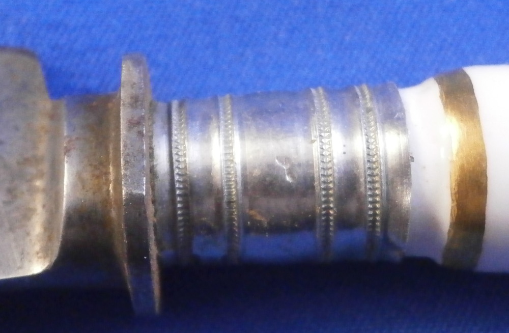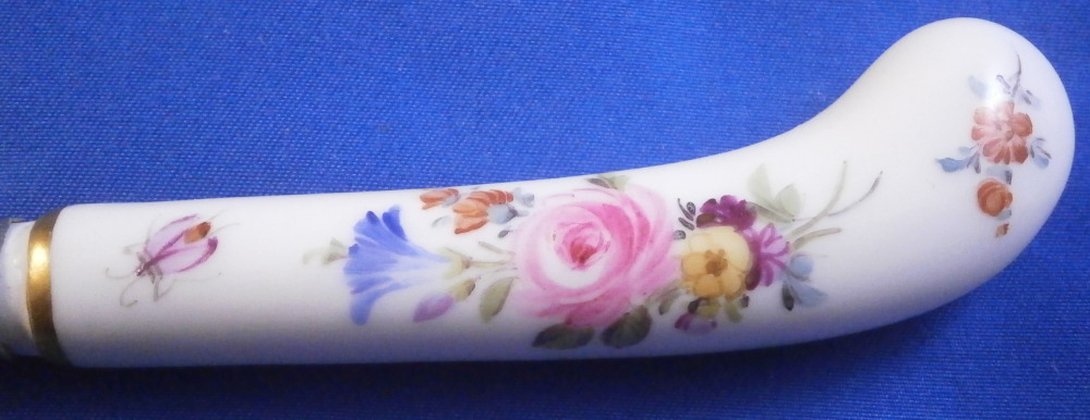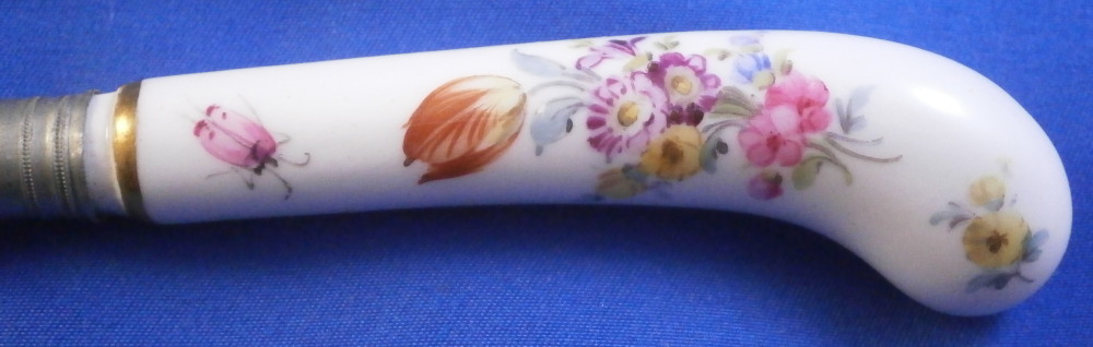 This is a a nice porcelain handled knife made by Meissen in the late 19th or early 20th century. The porcelain handle is hand painted with two very nice floral arrangements as well as two single flowers as well as two bugs and a bit of gold trim to the ferrule end. The porcelain piece is marked but mostly hidden under the ferrule. I have some other pieces from this set without the blade and the mark is clearly visible on those. The knife is in great condition with some oxidation to the blade. The ferrule appears to be made of silver. The blade is marked J.A. Henckels Solingen as shown. A rare chance to get a Meissen porcelain handled knife! The piece is about 8 inches long with the visible porcelain being about 3.125 inches long. It is about 0.625 inches wide. Please email me for more information or other pictures.