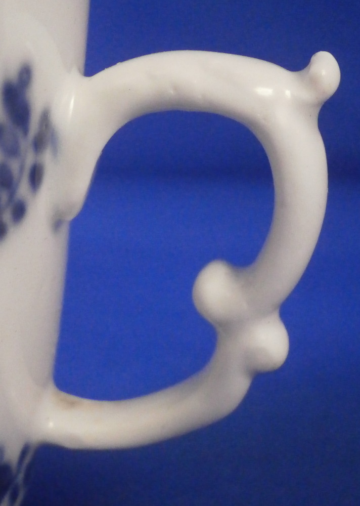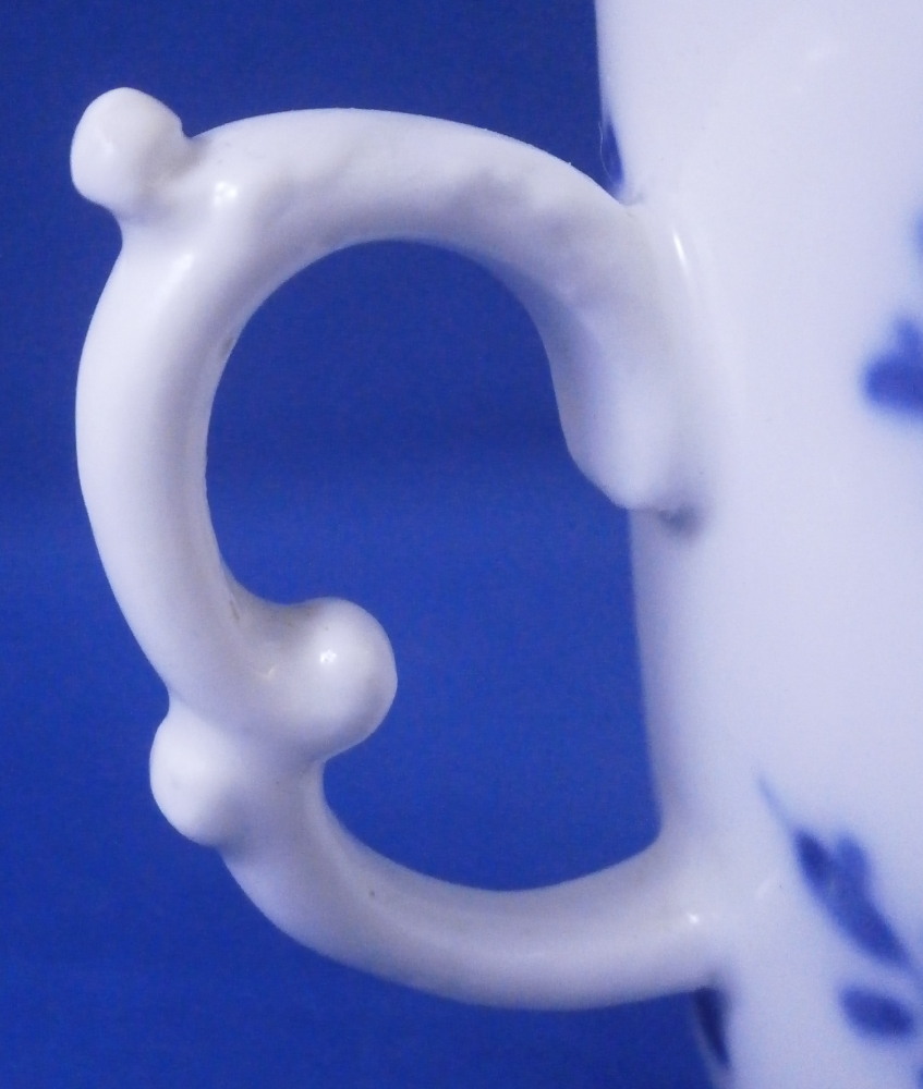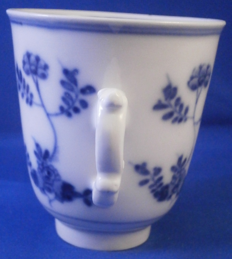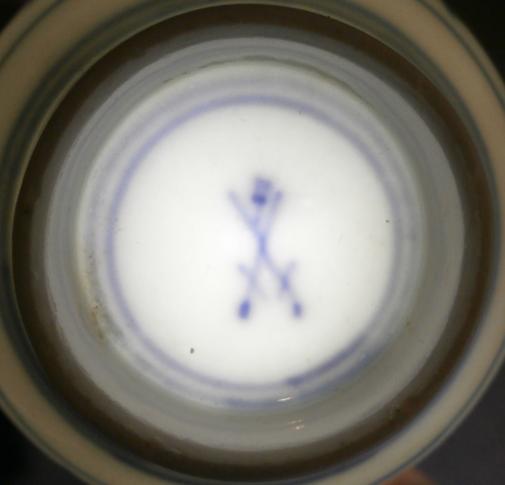This is a nice early chocolate cup and saucer set made by Meissen before 1740. It is very rare to find one of these early sets these days. Both pieces are hand painted with the well known strawflower design used by so many makers.The design goes all around and there is a nice trim to the inside edge of the cup. Typical early handle shape to both sides of the cup. The set is in superb condition with some minor firing flaws to the paste normal to these early wares. A black spot on the top edge of the cup being the most obvious. The saucer has a ribbed design to the underside which is a nice addition. The cup is just over 2.75 inches tall, 4 inches from handle to handle and 2.625 inches in diameter. The saucer is 1 inch tall and 4.875 inches in diameter. Both are marked underneath with the early under glaze blue crossed swords mark from this period as shown. No numbers yet as they started being used later. The saucer also has a blue line along the foot ring likely a mark for the blue painter. I added a pics with a strong light shining through the saucer to show the flaws their early paste had. I have a matching set on the site as well. Please email me for more information or other pictures.