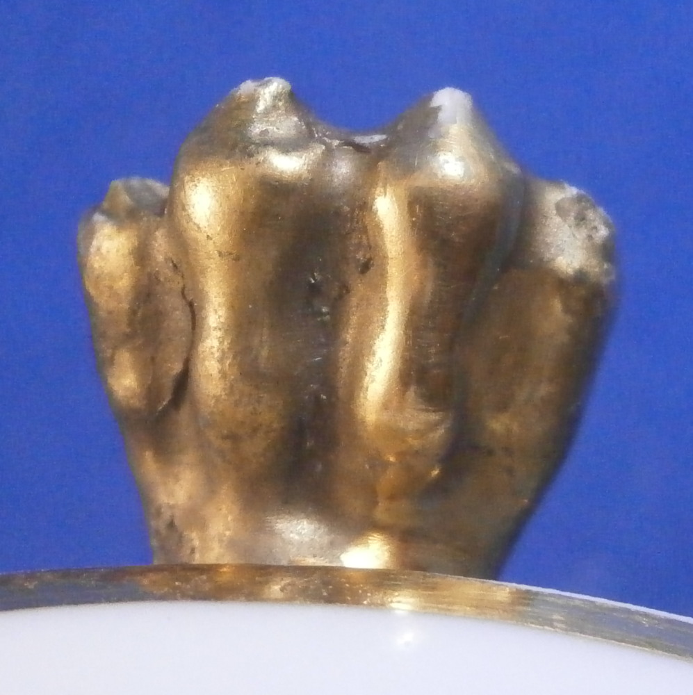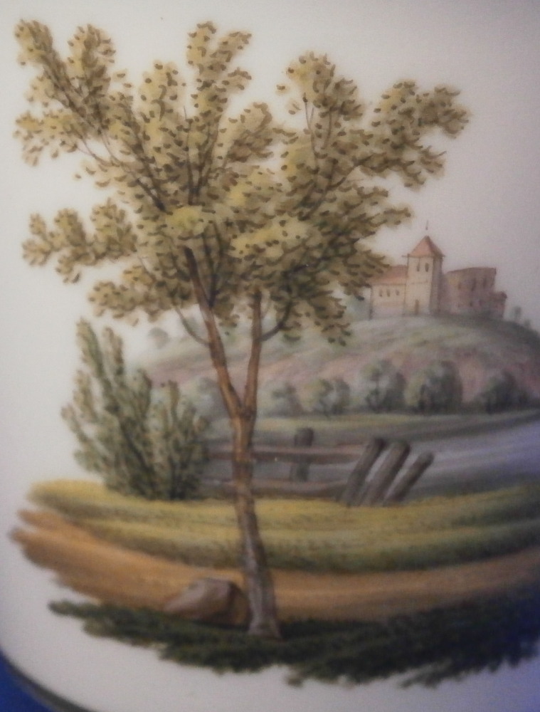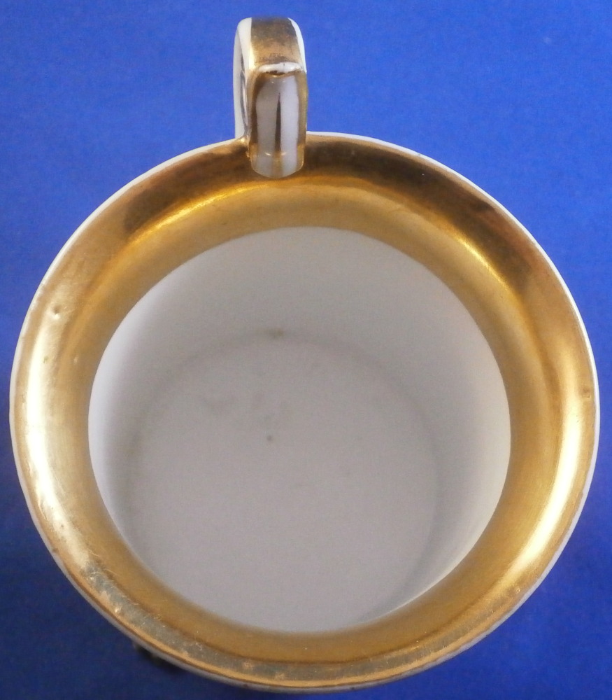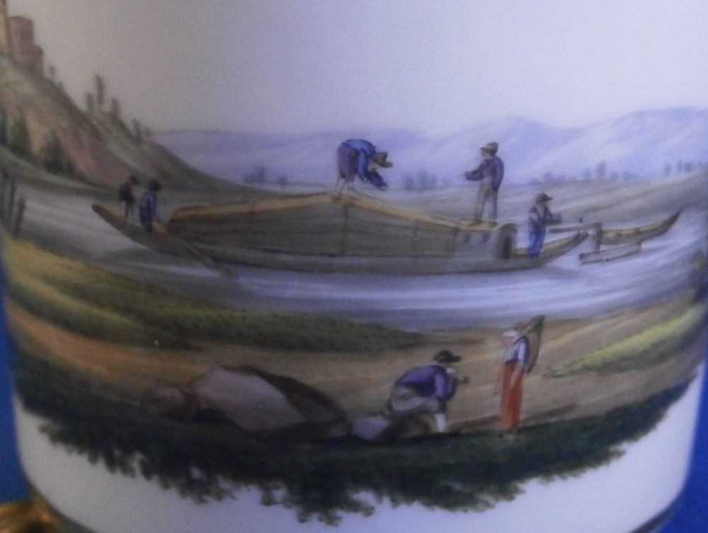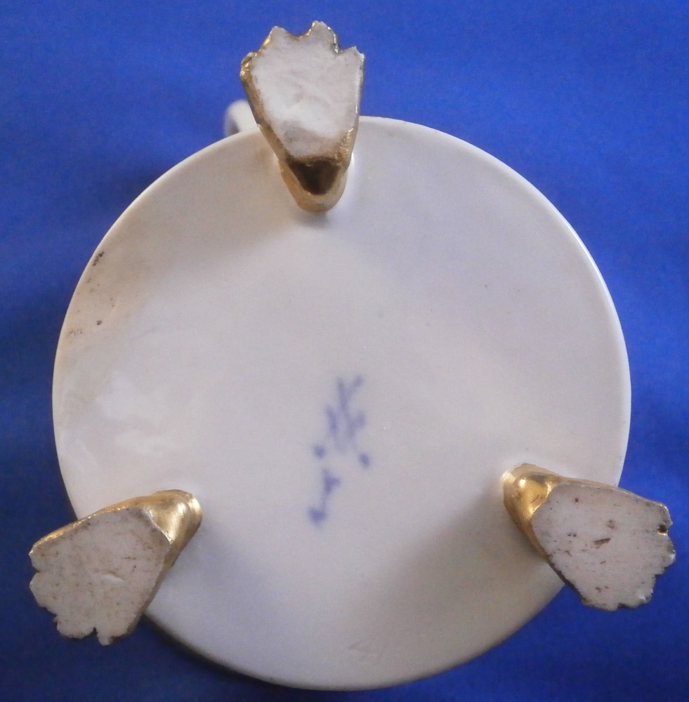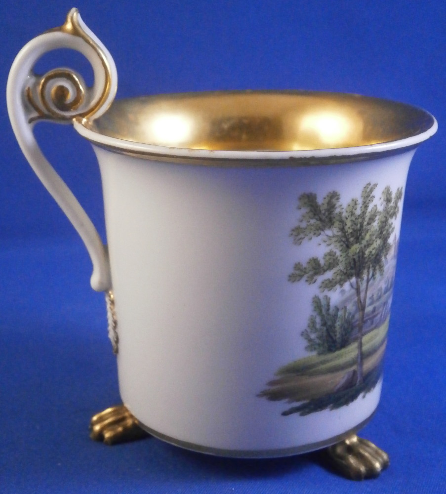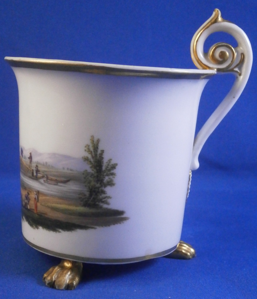 This is a fun cup made by Meissen in in the late 18th to early 19th century. This Roman numeral I mark was a way to identify different types of porcelain pastes and was used from the around 1774 until 1815. The cup is hand painted with a really nice scene depicting people in a landscape surrounding including a a large tree and a building in the background plus off course a few people and a large and a small boat on a river. The cup ists on three claw feet which is always a nice addition plus it has a nice handle shape to it. The feet are gilded, the handle has some gold trim to it and the inside of the cup is gilded about an 0.75 inches down. A well done piece that looks amazing. Just needs a simple saucer with a gold trim to complete a set or it works perfectly well on its own the way it is. The piece is in great condition with the claw feet having some chips as shown. The underside edge has had a chip ground down and painted over which has yellowed a bit over time. Not obvious when on display and it really looks great even with these minor issues. I showed the side view in that spot and as you can see it is very minor. The cup is 2.75 inches tall (plus the handle sticks up another 0.75 inches) and has a diameter of 2.875 inches with the feet sticking out a bit as well from that. The piece is marked underneath with the under glaze blue crossed swords, the Roman numeral I as well as the usual impressed numbers. Please email me for more information or other pictures.