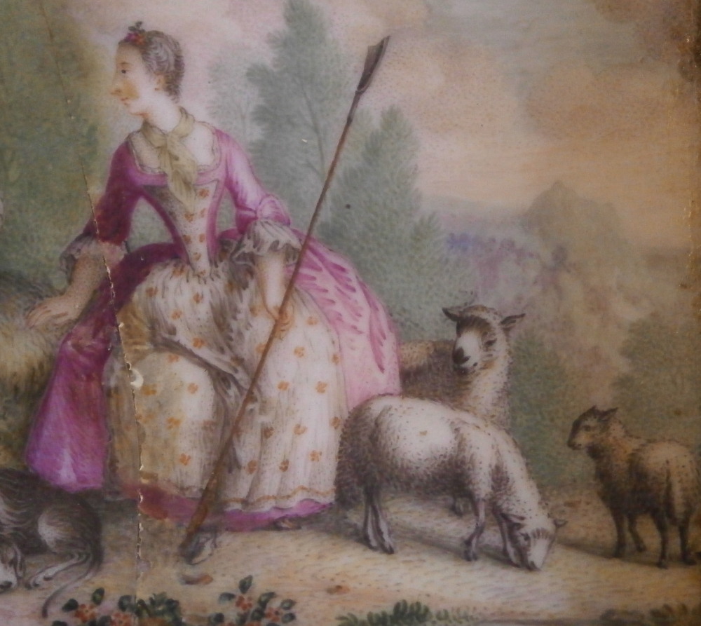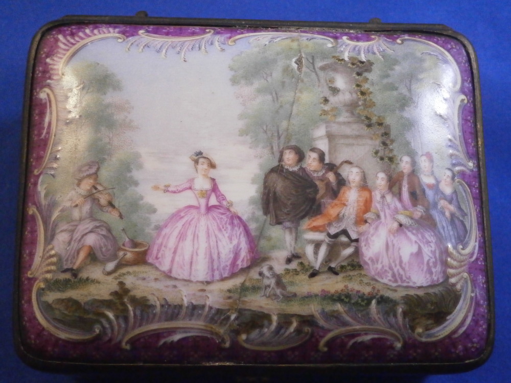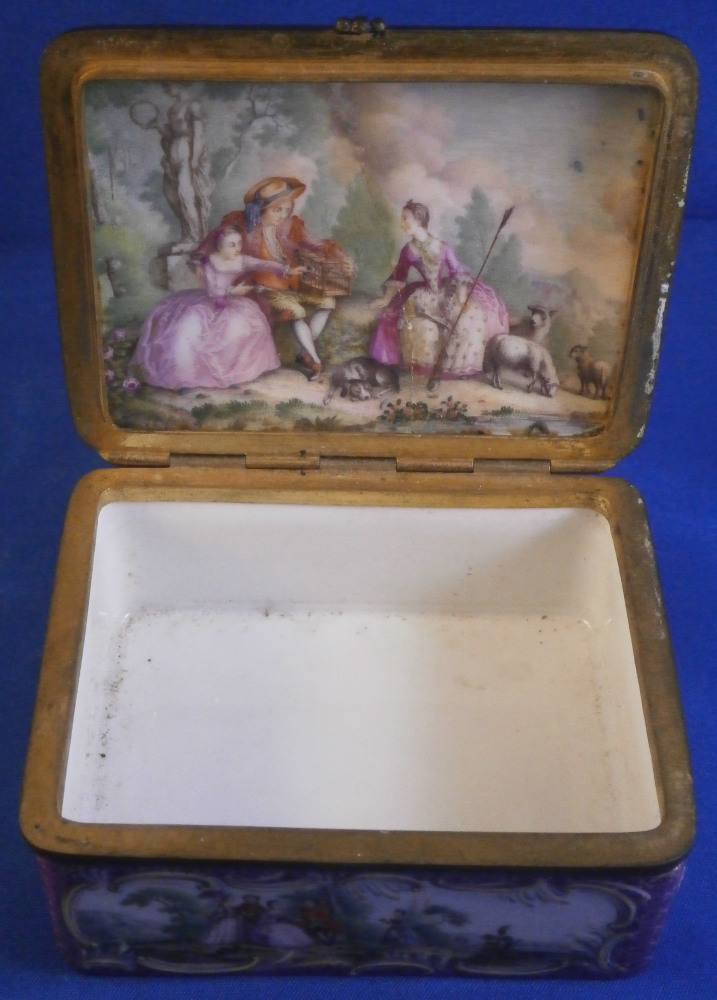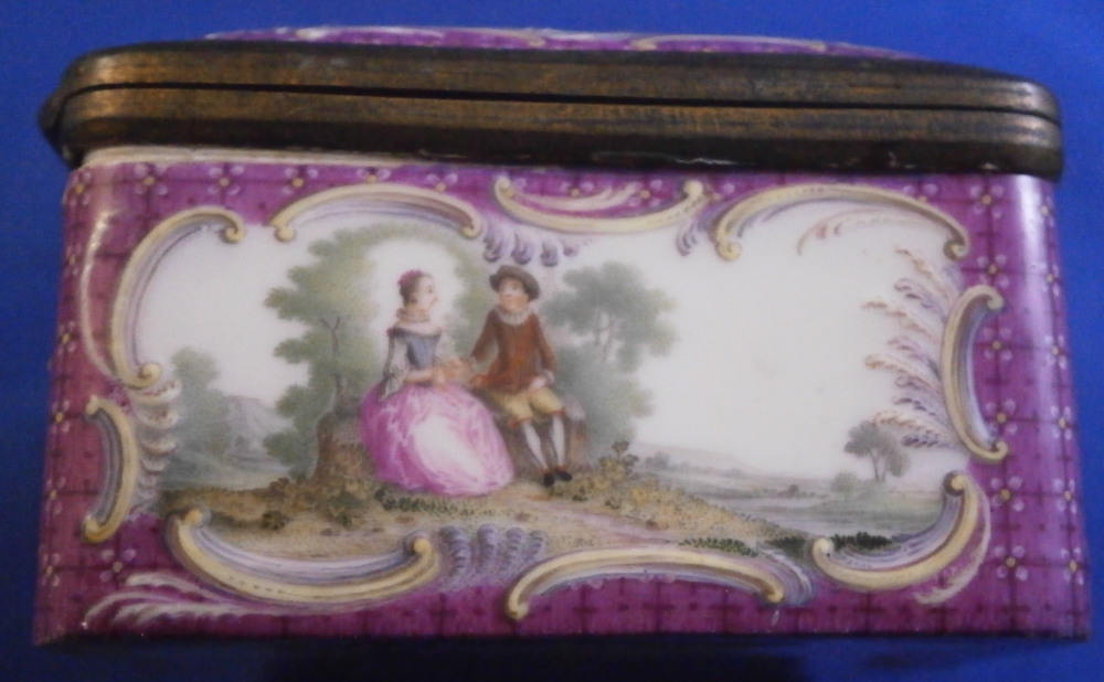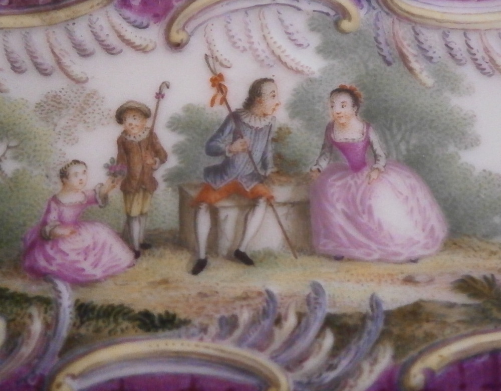 This is a really superb snuff / patch / pill / tabatiere box made by Meissen around 1750. This is a really nice example in terms of the painting. It has seven hand painted nice quality scenes on it as well as some nice relief scroll work plus this amazing puce trim to fill in the areas that are usually white. Most scenes include multiple people and all are in a landscape surrounding. Only the scene on the udnerside has a single shepherdess with its sheep in it. The mounts are brass and they still work perfectly. The quality of the scenes is superb! The box is in good condition - The bottom has no real issues except a little wear to the underside corners and a tiny chip to the edge. The lid sadly has been broken in half and was restored at some point. Hard to spot on the inside but could use a quick redo to bring it back to perfection! On the outside / top it is visible as a dark line but a decent restorer could make it look perfect again. It's a clean break with almost no dmage to any paint. The box is not marked which is normal but the piece speaks for itself. The snuff box is about 1.625 inches tall, 3.375 inches wide and 2.625 inches deep so a very nice size. Please email me for more information or other pictures.