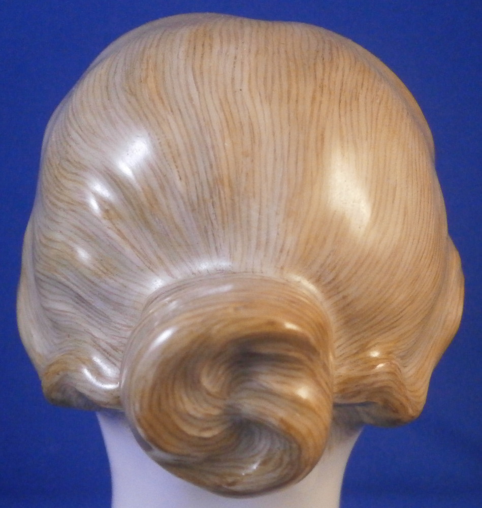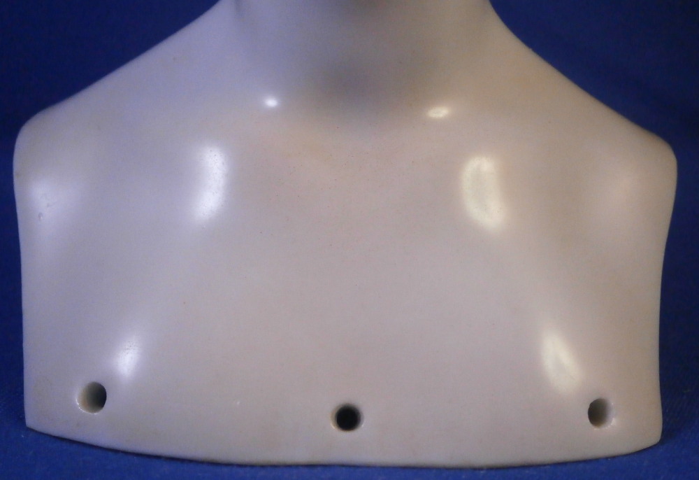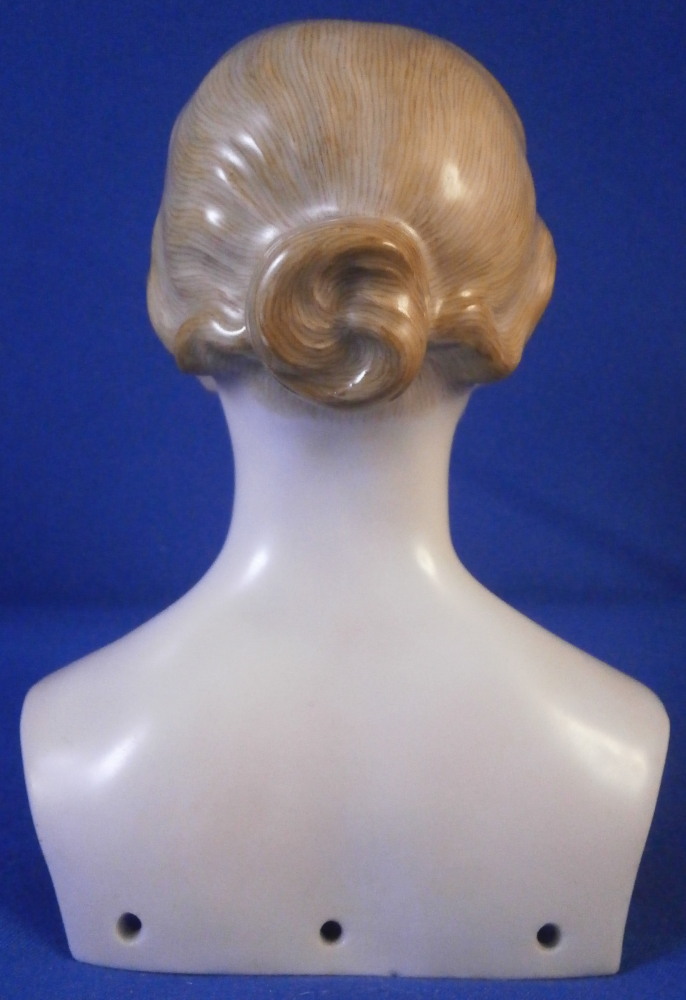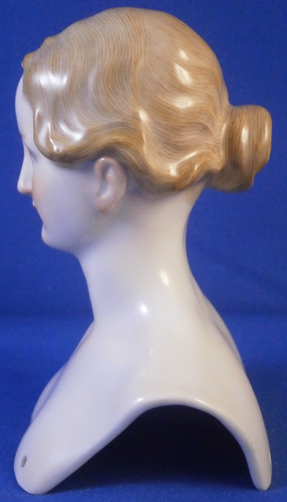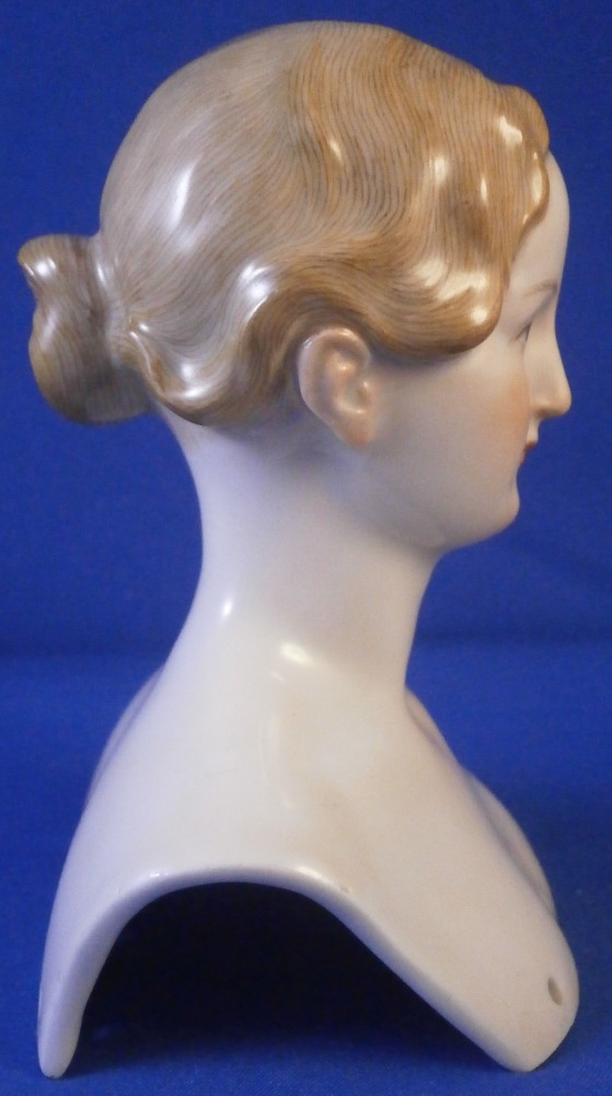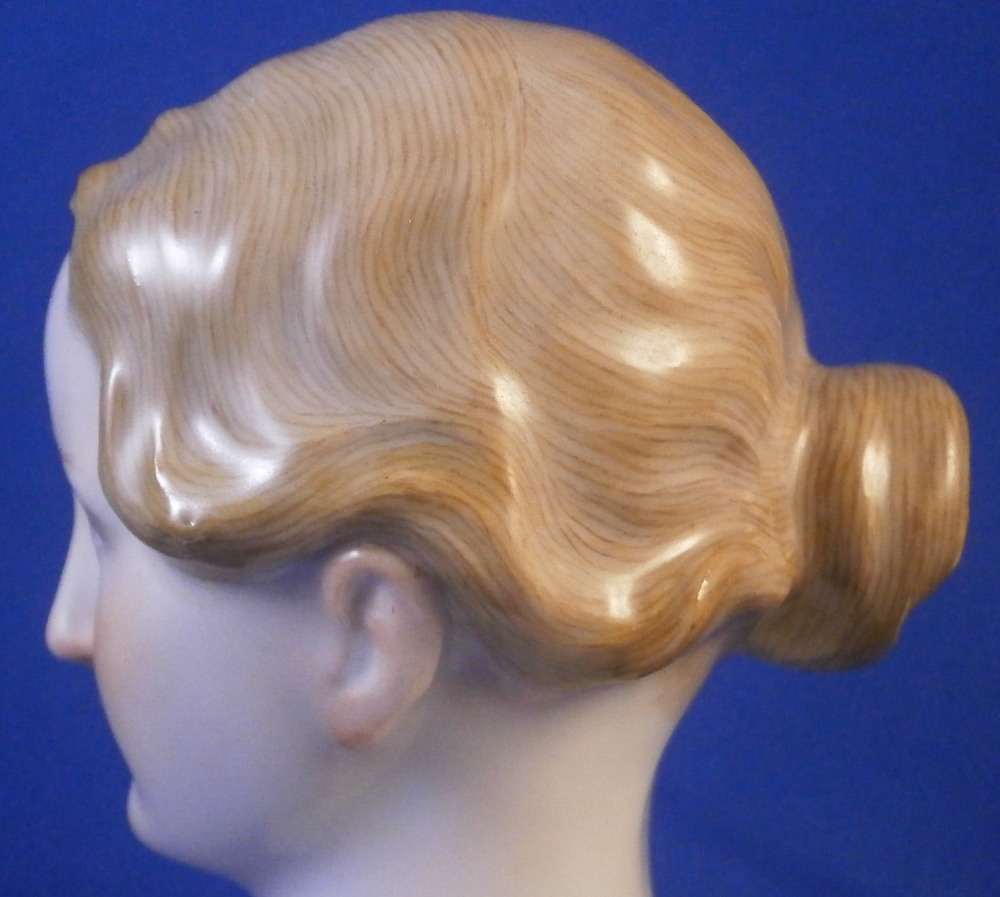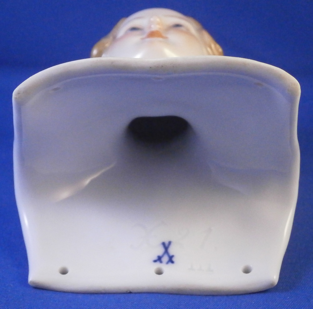 This is a very rare and fine porcelain shoulder head for a doll made by Meissen in the mid to late 19th century. One rarely ever sees these pieces and I have never seen this example before. It is of a young lady or girl with lots of fine details to it. Superb light brown or dirty blonde hair drawn back into a bun, nicely detailed ears and very well painted facial features. In terms of dolls this would have been the most high end of pieces like this! The shoulder plates in the front and back each have three holes in therm to attach to the doll's body! It is marked on the inside of the shoulder plates with their under glaze blue crossed swords mark, incised model number X.21 and imprssed number 111. Possibly originally modeled by Johann Gottfried Dressler . These pieces truly cross the line of the German China doll from being a toy to true art. As nice as they come! I have only seen a handful of these over 25 years and only once as part of a whole doll and that sold for almost 10K. So definitely a very special piece. It is 3.875 inches tall, 3 inches wide and 2.25 inches deep. Insuperb condition except for a flake to the bottom edge as shown that is glazed over and from when it was made. Please email me for more information or other pictures.