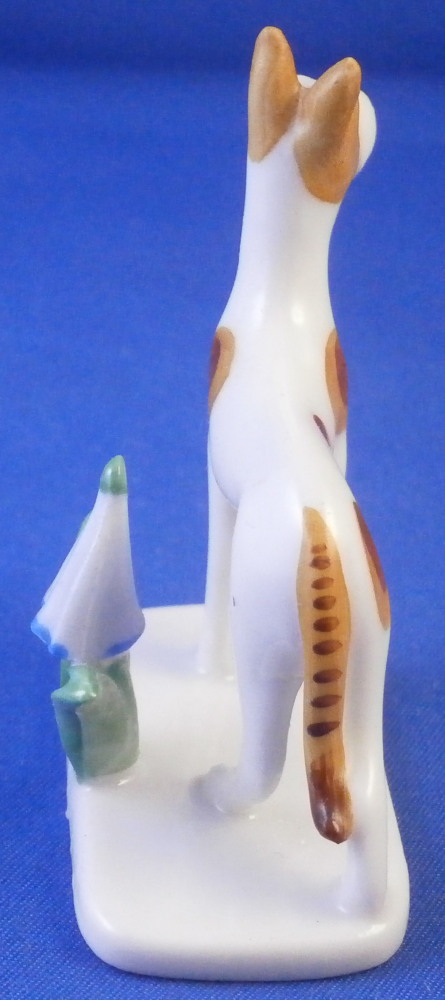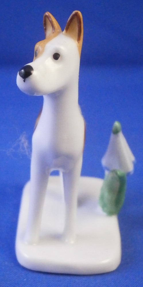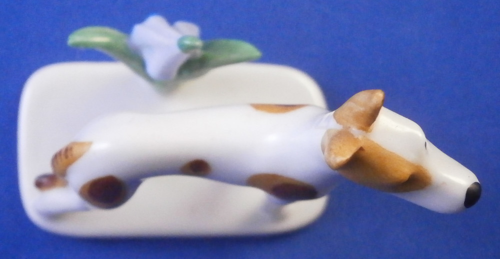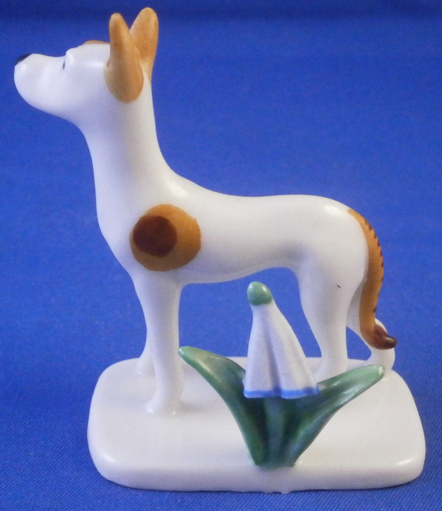 This is a cute and very rare porcelain figurine made by Metzler & Ortloff in the late 1920's. Metzler & Ortloff was founded originally around 1873 and finally closed its doors in 1976. This figurine was designed during their best period by the famous Walter Bosse who worked for them from 1926 until 1930. He made about 200 different figures though most are dogs or such things and very few are larger pieces. The piece here is of a dog possibly a boxer standing on a rectangular base with rounded corners with a flower with its leaves next to it. A super cute example with dark and light brown patches and a cute face. The figure is part of their placecard holder series but I could not find another example of this aprticular model. The figure is modeled and hand painted in the typical fashion for this maker and designer. Really a fun little piece! The figurine is in perfect condition which always helps and is marked underneath with the green MO mork under a crown in a circle as well as an impressed number 5549 as shown. The figurine is about 2.25 inches tall, 1.125 inches wide and 2 inches long. Please email me for more information or photos.