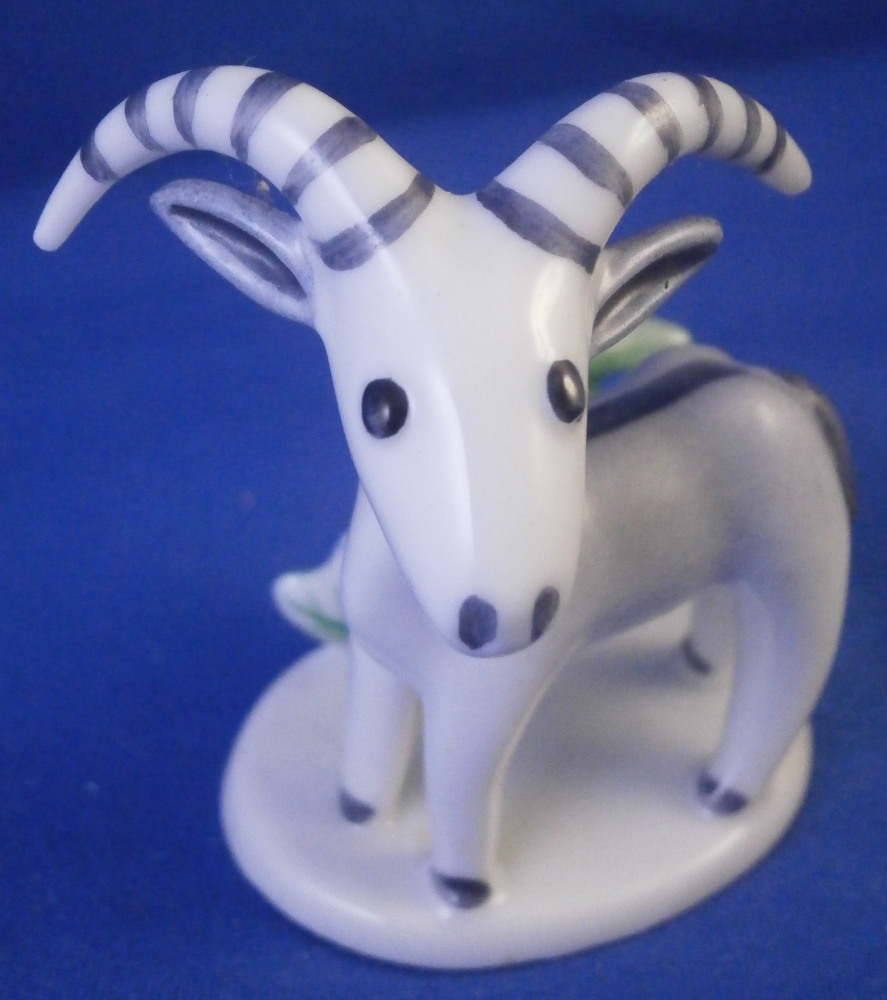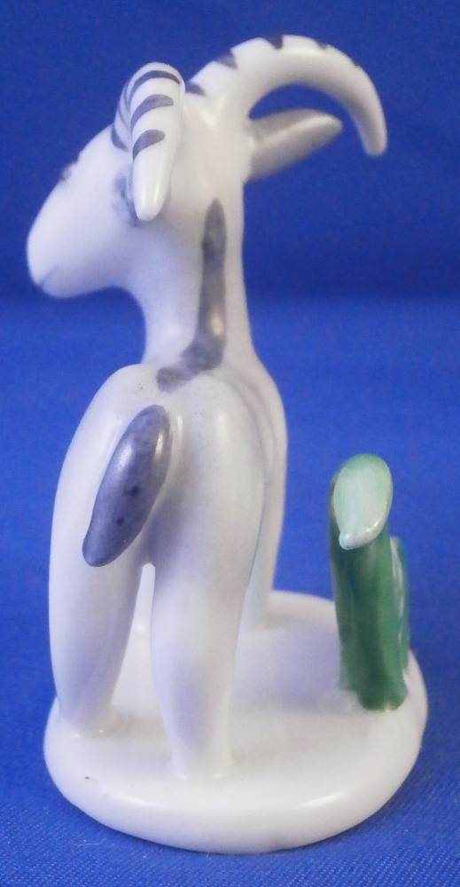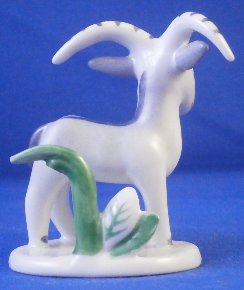 This is a cute porcelain figurine made by Metzler & Ortloff in the late 1920's. Metzler & Ortloff was founded originally around 1873 and finally closed its doors in 1976. This figurine was designed during their best period by the famous Walter Bosse who worked for them from 1926 until 1930. He made about 200 different figures though most are dogs or such things and very few are larger pieces. The piece here is a male goat (I think) figure standing on a rectangular base with rounded corners with some leaves next to it. The piece is part of their place card holder series. A very hard to find example. The goat is super cute with purple rings painted on its horns. The figure is modeled and hand painted in the typical fashion for this maker and designer. I have a few other examples if anyone would like to make a set. I have them all up on the site. These really are fun little pieces! The figurine displays perfectly but upon close inspection a tip of one of the leaves is chipped. It is underneath and impossible to spot when on display. The piece is marked underneath with the green MO mark under a crown in a circle as well as an impressed number 5467 and Germany in black as shown. The figurine is 2 inches tall, 1.375 inches wide and 1.875 inches long. Please email me for more information or photos.