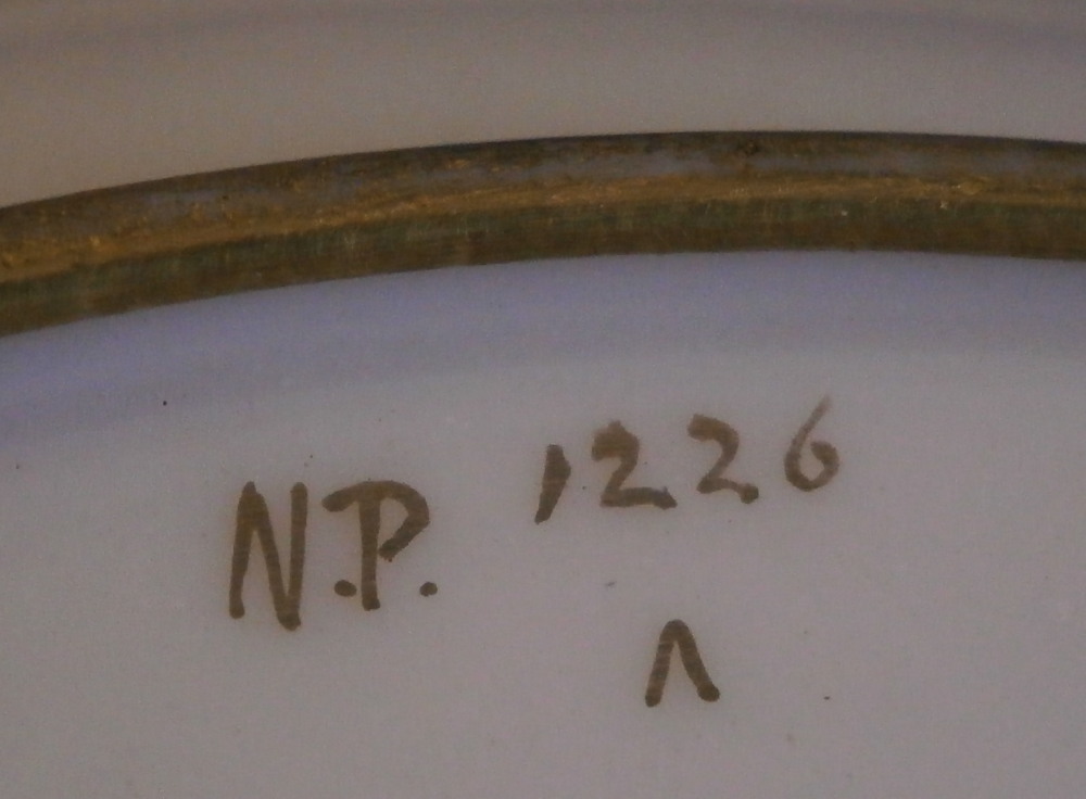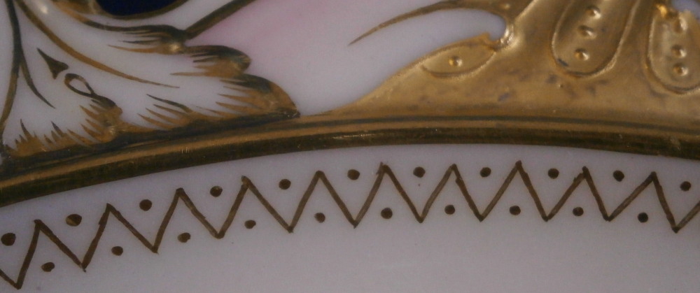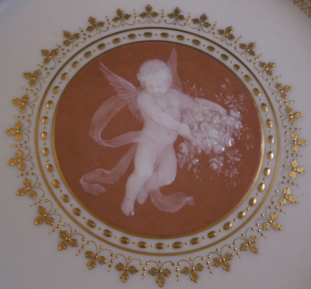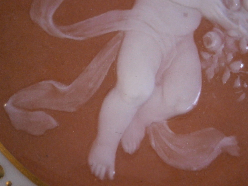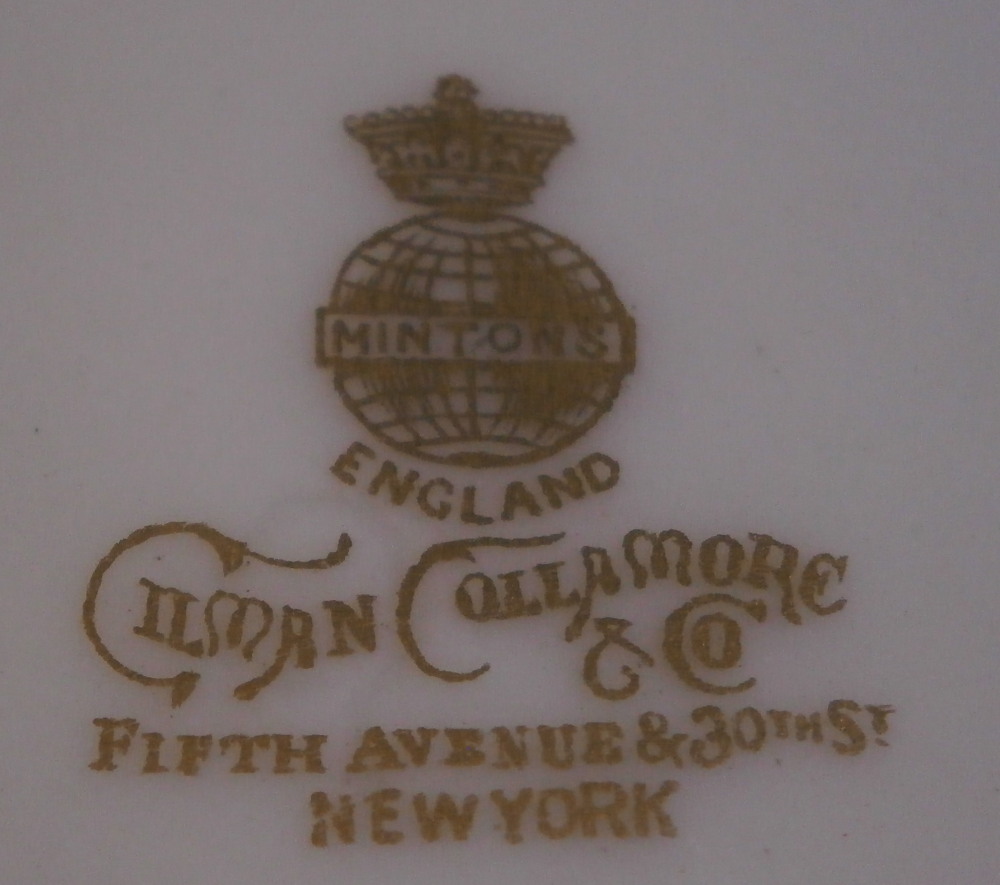 This is a really superb plate made by Mintons in the early 20th century - 1902 if I read the date code correctly. The rim of the plate is nicely reticulated with lots of gold highlights to it. Sort of a fan shaped design with a wave and seashell design below that. Quite detailed and with the cut out sections plus relief and gold details quite a superb look! The edge of the well has a gold ziczac and dot design to it but off course the best part is the central pate sur pate design. It has a circular panel of a reddish ground color with the white pate-sur-pate angel / cherub over that. The angel has a flowing cloth around it and is holding a large bouqet of flowers in front of it. The quality of the pate sur pate design is superb! There is a fancy gold trim around the scene with raised details to it. As nice a plate as they come! The pate-sur-pate scene was painted by Albion Birks, a student of the famous Marc Louis Solon . It is faintly signed AB under the bottom of the lower right flower. The plate is of a nice size being 0.875 inches tall and 9 inches in diameter. It is in perfect condition! It is marked underneath with impressed Mintons as well as their typical date cyphers - in this case a number 2 in a circle plus a gold N.P 1226 and tent mark in gold. It also has the gold globe with Mintons in the center and the crown above plus the retailers mark for Gilman Collamore & Co New York. Fifth Avenue and 30th street. They were rivals to Tiffany & Co.. Please email me for more information or other pictures.