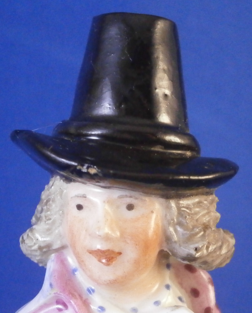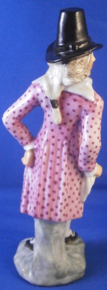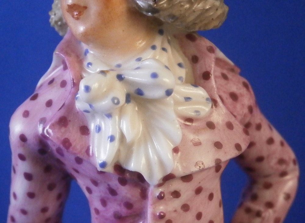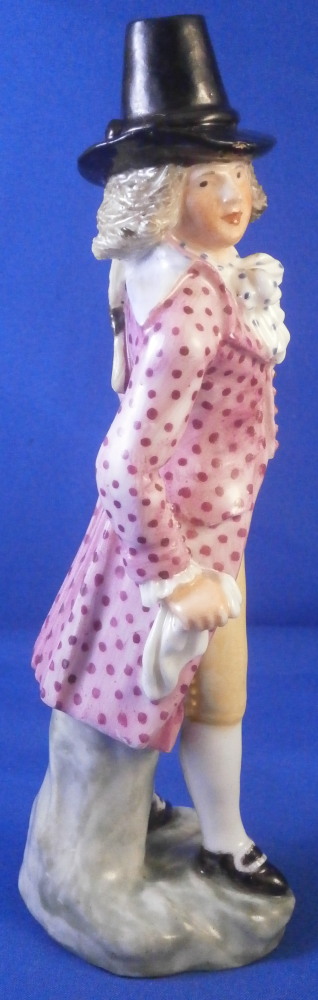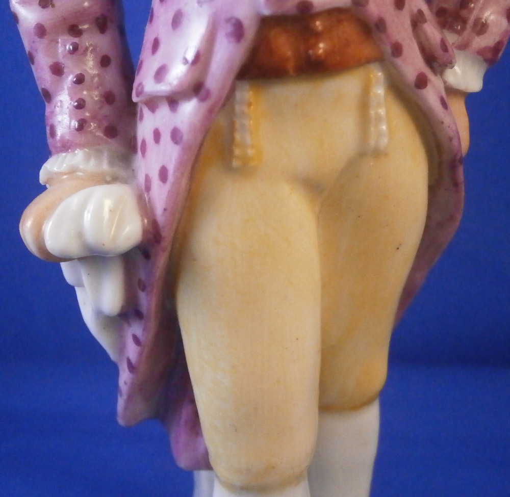 This is a very rare figurine made by Naples ( Real Fabbrica Ferdinandea ) around 1795. It is from the Real Passeggio series and is of a gentleman wearing a fancy outfit including long pink coat with a dot design to it, top hat and yellow pants. Standing on a simple base. Typical hair style for this maker and period. The figure was most likely modelled by Filippo Tagliolini (head modeller) and painted by Giovan Battista Polidoro. He is made of softpaste porcelain. Really well modeled and hand painted and one can see the Capodimonte influence in the painting and colors. The figurine is in superb condition with some chips to the edge of the hat which were colored in to hide them better. He displays perfectly! The piece is unmarked which seems to be the norm from the few pieces I have come across. The figurine is about 6.625 inches tall, 2.5 inches wide and 2.25 inches deep. Please email me for more information or other pictures.