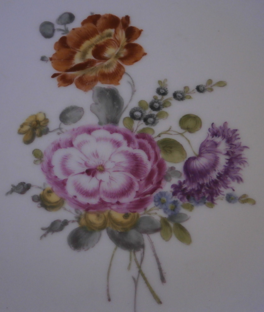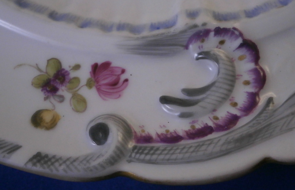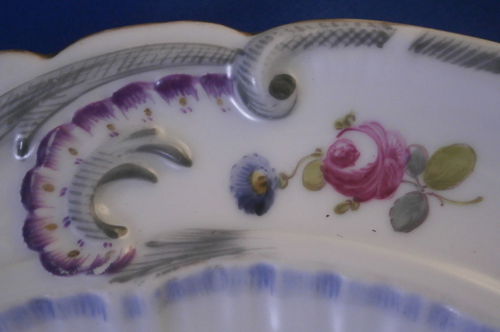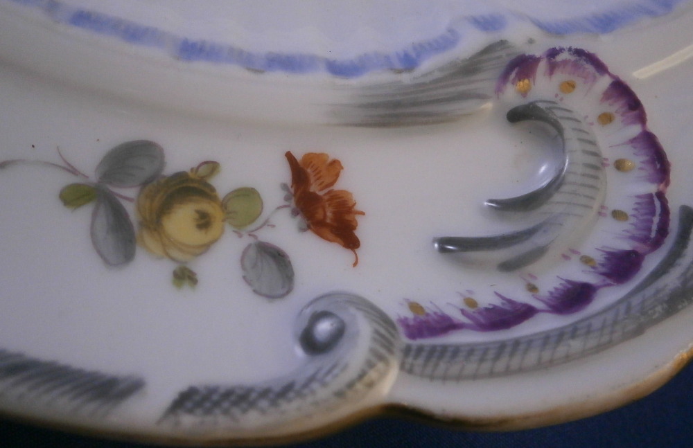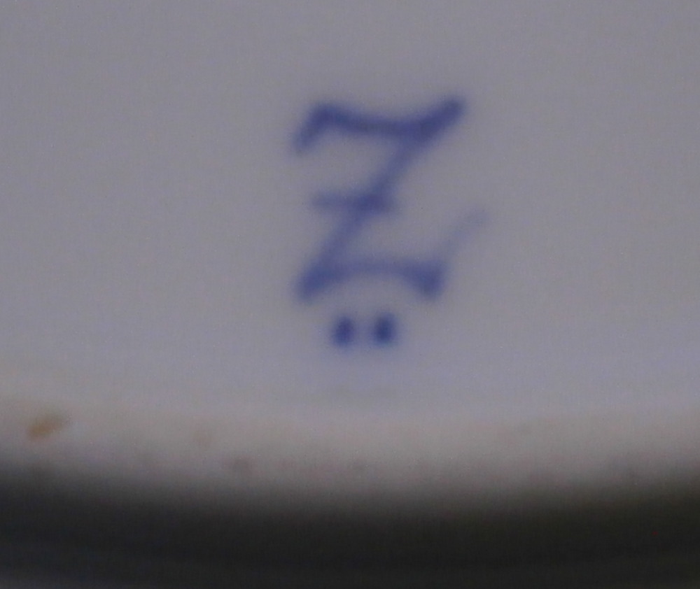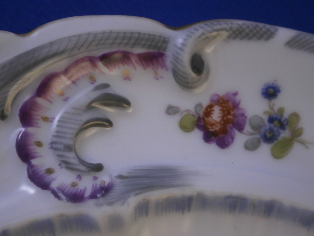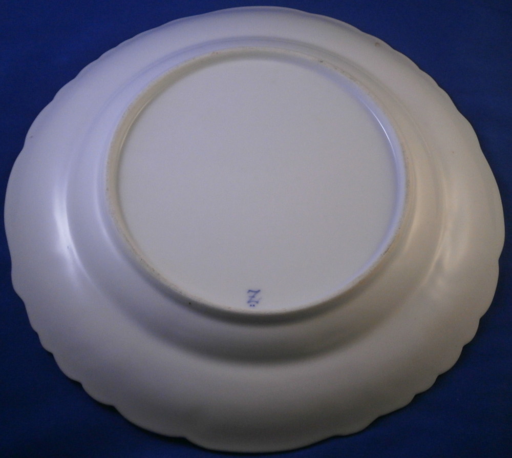 This is a nice floral plate made by an unknown maker in the late 19th or early 20th century. I am fairly sure it is German and most likely Bock-Wallendorf or maybe even Potschappel but not entirely sure on that. It is nicely hand painted with a large floral arrangement in the center as well as a superb relief design to the entire rim including flowers and scrolls. Some grey, puce and blue highlights plus four hand painted small floral arrangements to the rim. Remnants of gold trim to the very edge. A really nice looking plate! The piece is in great condition without chips, etc. but has the already mentoned wear to the gold trim along the outer edge. A discolored spot to the underside likely from one of those old rusty metal hangers. Does not take away from the piece when on display! The plate is 1.25 inches tall and 9.125 inches in diameter. It is marked with the letter Z in under glaze blue with two dots below it as shown. Please email me for more information or other pictures.
